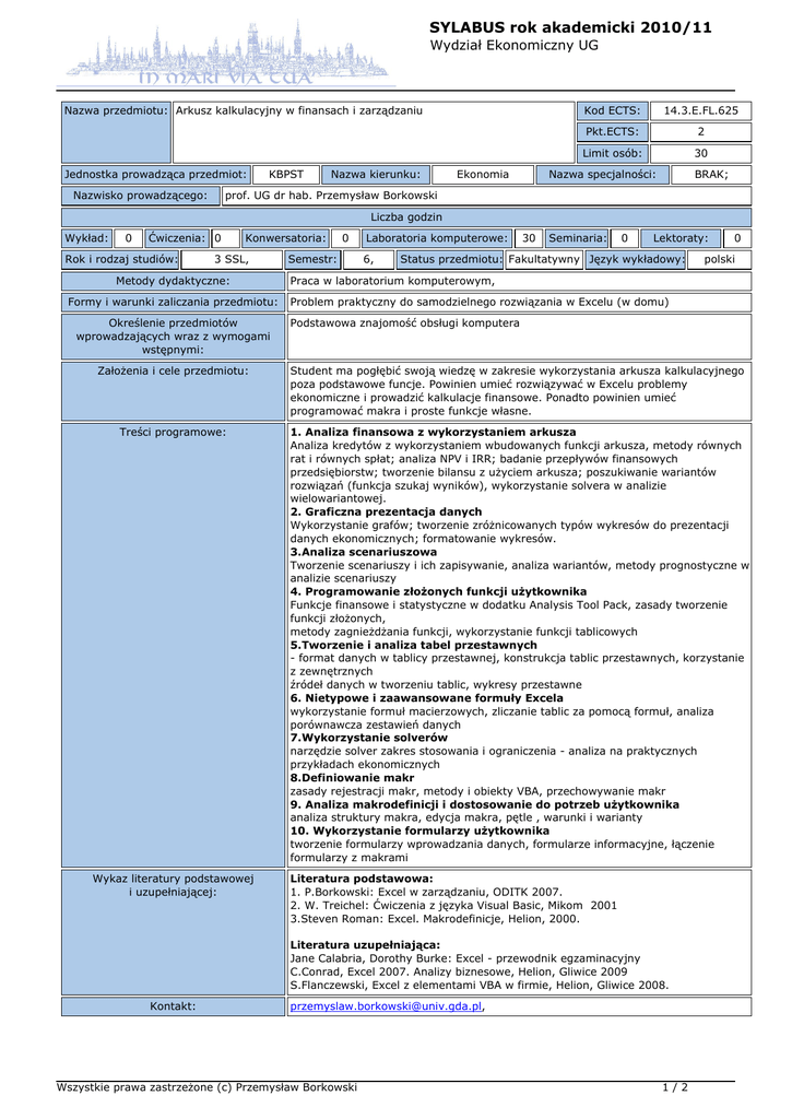 SYLABUS rok akademicki 2010/11 Wydział Ekonomiczny UG Nazwa przedmiotu: Arkusz kalkulacyjny w finansach i zarządzaniu Jednostka prowadząca przedmiot: Nazwisko prowadzącego: KBPST Nazwa kierunku: Ekonomia Kod ECTS: 14.3.E.FL.625 Pkt.ECTS: 2 Limit osób: 30 Nazwa specjalności: BRAK; prof. UG dr hab. Przemysław Borkowski Liczba godzin Wykład: 0 Ćwiczenia: 0 Rok i rodzaj studiów: Konwersatoria: 3 SSL, Metody dydaktyczne: Formy i warunki zaliczania przedmiotu: Określenie przedmiotów wprowadzających wraz z wymogami wstępnymi: 0 Semestr: Laboratoria komputerowe: 6, 30 Seminaria: 0 Lektoraty: Status przedmiotu: Fakultatywny Język wykładowy: 0 polski Praca w laboratorium komputerowym, Problem praktyczny do samodzielnego rozwiązania w Excelu (w domu) Podstawowa znajomość obsługi komputera Założenia i cele przedmiotu: Student ma pogłębić swoją wiedzę w zakresie wykorzystania arkusza kalkulacyjnego poza podstawowe funcje. Powinien umieć rozwiązywać w Excelu problemy ekonomiczne i prowadzić kalkulacje finansowe. Ponadto powinien umieć programować makra i proste funkcje własne. Treści programowe: 1. Analiza finansowa z wykorzystaniem arkusza Analiza kredytów z wykorzystaniem wbudowanych funkcji arkusza, metody równych rat i równych spłat; analiza NPV i IRR; badanie przepływów finansowych przedsiębiorstw; tworzenie bilansu z użyciem arkusza; poszukiwanie wariantów rozwiązań (funkcja szukaj wyników), wykorzystanie solvera w analizie wielowariantowej. 2. Graficzna prezentacja danych Wykorzystanie grafów; tworzenie zróżnicowanych typów wykresów do prezentacji danych ekonomicznych; formatowanie wykresów. 3.Analiza scenariuszowa Tworzenie scenariuszy i ich zapisywanie, analiza wariantów, metody prognostyczne w analizie scenariuszy 4. Programowanie złożonych funkcji użytkownika Funkcje finansowe i statystyczne w dodatku Analysis Tool Pack, zasady tworzenie funkcji złożonych, metody zagnieżdżania funkcji, wykorzystanie funkcji tablicowych 5.Tworzenie i analiza tabel przestawnych - format danych w tablicy przestawnej, konstrukcja tablic przestawnych, korzystanie z zewnętrznych źródeł danych w tworzeniu tablic, wykresy przestawne 6. Nietypowe i zaawansowane formuły Excela wykorzystanie formuł macierzowych, zliczanie tablic za pomocą formuł, analiza porównawcza zestawień danych 7.Wykorzystanie solverów narzędzie solver zakres stosowania i ograniczenia - analiza na praktycznych przykładach ekonomicznych 8.Definiowanie makr zasady rejestracji makr, metody i obiekty VBA, przechowywanie makr 9. Analiza makrodefinicji i dostosowanie do potrzeb użytkownika analiza struktury makra, edycja makra, pętle , warunki i warianty 10. Wykorzystanie formularzy użytkownika tworzenie formularzy wprowadzania danych, formularze informacyjne, łączenie formularzy z makrami Wykaz literatury podstawowej i uzupełniającej: Literatura podstawowa: 1. P.Borkowski: Excel w zarządzaniu, ODITK 2007. 2. W. Treichel: Ćwiczenia z języka Visual Basic, Mikom 2001 3.Steven Roman: Excel. Makrodefinicje, Helion, 2000. Literatura uzupełniająca: Jane Calabria, Dorothy Burke: Excel - przewodnik egzaminacyjny C.Conrad, Excel 2007. Analizy biznesowe, Helion, Gliwice 2009 S.Flanczewski, Excel z elementami VBA w firmie, Helion, Gliwice 2008. Kontakt: [email protected], Wszystkie prawa zastrzeżone (c) Przemysław Borkowski 1/2 SYLABUS rok akademicki 2010/11 Wydział Ekonomiczny UG Wszystkie prawa zastrzeżone (c) Przemysław Borkowski 2/2