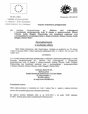 W6jt Gminy Konarzyny, jako Zamawiaiqcy, dzialajqc na podstawie art. 92 ustawy
