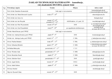 ZAKŁAD TECHNOLOGII MATERIAŁÓW - konsultacje, rok akademicki 2013/2014, semestr letni L.p. Prowadzący zajęcia 1. Prof. dr hab. Stanisław Komornicki 2. Prof. dr hab. inż. Maria Borczuch–Łączka 3. Prof. dr hab. inż. Jerzy Lis 4. Prof. dr hab. inż. Jan Wasylak 5. Termin Miejsce Adres e-mail [email protected], [email protected] brak zajęć w tym semestrze środa 1300 - 1400 [email protected] [email protected] wtorek 1100 -1200 czwartek 1200 - 1300 AGH Kraków, A-3, pok. 212 Prof. dr hab. inż. Piotr Wyszomirski wtorek 1500-1600 D 08 6. Prof. dr hab. inż. Józef Zasadziński środy 900 - 1000 po uzgodnieniu telefonicznym 7. Dr hab. Marek Boczar, prof. PWSZ 8. Dr hab. inż. Andrzej Kwatera, prof. PWSZ 9. Dr hab. inż. Jadwiga Laska, prof. PWSZ 10. [email protected] [email protected] [email protected] [email protected] tel. kom. 603 675 538 brak zajęć w tym semestrze piątek 900 - 945 D 08 [email protected] wtorek 1630 – 1730 C 100c [email protected] Dr inż. Paulina Bednarz środa 1000 – 1100 C 100c [email protected] 11. Dr inż. Sebastian Bielecki piątek 1300 - 1400 C 100b [email protected] tel. kom. 501 009 223 12. Dr Halina Bińczycka poniedziałek 1615 - 1715 C 213 13. Dr inż. Wiesław Juda poniedziałek 1240 - 1340 C 100b [email protected] 14. Dr inż. Bronisław Kurek piątek 830 - 930 C 100b [email protected] 15. Dr inż. Zdzisław Pytel poniedziałek 1730 - 1830 D 09 [email protected] 16. Dr inż. Agata Sawka wtorek 1415 - 1500 D 012 [email protected] 17. Dr inż. Jakub Sobota piątek 845 - 945 C 100b [email protected] 18. Dr Jerzy Stochel 19. Mgr inż. Ryszard Cabaj [email protected] wtorek 1430 - 1530 D 09