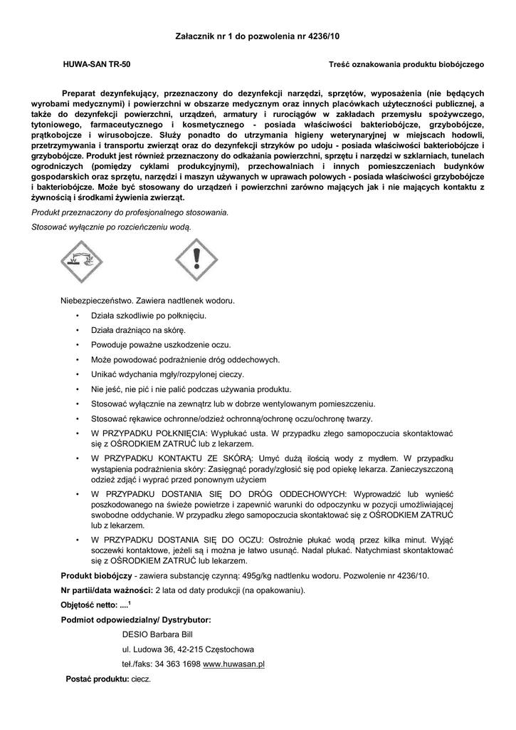 Załacznik nr 1 do pozwolenia nr 4236/10 HUWA-SAN TR-50 Treść oznakowania produktu biobójczego Preparat dezynfekujący, przeznaczony do dezynfekcji narzędzi, sprzętów, wyposażenia (nie będących wyrobami medycznymi) i powierzchni w obszarze medycznym oraz innych placówkach użyteczności publicznej, a także do dezynfekcji powierzchni, urządzeń, armatury i rurociągów w zakładach przemysłu spożywczego, tytoniowego, farmaceutycznego i kosmetycznego - posiada właściwości bakteriobójcze, grzybobójcze, prątkobojcze i wirusobojcze. Służy ponadto do utrzymania higieny weterynaryjnej w miejscach hodowli, przetrzymywania i transportu zwierząt oraz do dezynfekcji strzyków po udoju - posiada właściwości bakteriobójcze i grzybobójcze. Produkt jest również przeznaczony do odkażania powierzchni, sprzętu i narzędzi w szklarniach, tunelach ogrodniczych (pomiędzy cyklami produkcyjnymi), przechowalniach i innych pomieszczeniach budynków gospodarskich oraz sprzętu, narzędzi i maszyn używanych w uprawach polowych - posiada właściwości grzybobójcze i bakteriobójcze. Może być stosowany do urządzeń i powierzchni zarówno mających jak i nie mających kontaktu z żywnością i środkami żywienia zwierząt. Produkt przeznaczony do profesjonalnego stosowania. Stosować wyłącznie po rozcieńczeniu wodą. Niebezpieczeństwo. Zawiera nadtlenek wodoru. • Działa szkodliwie po połknięciu. • Działa drażniąco na skórę. • Powoduje poważne uszkodzenie oczu. • Może powodować podrażnienie dróg oddechowych. • Unikać wdychania mgły/rozpylonej cieczy. • Nie jeść, nie pić i nie palić podczas używania produktu. • Stosować wyłącznie na zewnątrz lub w dobrze wentylowanym pomieszczeniu. • Stosować rękawice ochronne/odzież ochronną/ochronę oczu/ochronę twarzy. • W PRZYPADKU POŁKNIĘCIA: Wypłukać usta. W przypadku złego samopoczucia skontaktować się z OŚRODKIEM ZATRUĆ lub z lekarzem. • W PRZYPADKU KONTAKTU ZE SKÓRĄ: Umyć dużą ilością wody z mydłem. W przypadku wystąpienia podrażnienia skóry: Zasięgnąć porady/zgłosić się pod opiekę lekarza. Zanieczyszczoną odzież zdjąć i wyprać przed ponownym użyciem • W PRZYPADKU DOSTANIA SIĘ DO DRÓG ODDECHOWYCH: Wyprowadzić lub wynieść poszkodowanego na świeże powietrze i zapewnić warunki do odpoczynku w pozycji umożliwiającej swobodne oddychanie. W przypadku złego samopoczucia skontaktować się z OŚRODKIEM ZATRUĆ lub z lekarzem. • W PRZYPADKU DOSTANIA SIĘ DO OCZU: Ostrożnie płukać wodą przez kilka minut. Wyjąć soczewki kontaktowe, jeżeli są i można je łatwo usunąć. Nadal płukać. Natychmiast skontaktować się z OŚRODKIEM ZATRUĆ lub lekarzem. Produkt biobójczy - zawiera substancję czynną: 495g/kg nadtlenku wodoru. Pozwolenie nr 4236/10. Nr partii/data ważności: 2 lata od daty produkcji (na opakowaniu). Objętość netto: ....1 Podmiot odpowiedzialny/ Dystrybutor: DESIO Barbara Bill ul. Ludowa 36, 42-215 Częstochowa teł./faks: 34 363 1698 www.huwasan.pl Postać produktu: ciecz. Sposób użycia: • Roztwór roboczy HUWA-SAIM TR-50 nanosić na powierzchnie metodą natrysku, zanurzania i zamgławiania. Nadaje się do przeprowadzenia procesu dezynfekcji z użyciem czystej szmatki, gąbki lub mopa. • Przed dezynfekcją narzędzia, sprzęty, powierzchnie umyć przy pomocy odpowiedniego środka myjącego a następnie opłukać wodą wodociągową. • Przygotować roztwór roboczy o zalecanym stężeniu. • Narzędzia, małe przedmioty i części urządzeń zanurzyć w roztworze roboczym na określony czas. • Na duże powierzchnie i sprzęty nanieść taką ilości produktu aby dezynfekowane powierzchnie pozostały wilgotne przez zalecany czas dezynfekcji. • Po użyciu spłukać wodą wodociągową a powierzchnie mające bezpośredni kontakt z żywnością wodą do picia. • Systemy rozprowadzania wody pitnej, zbiorniki i rurociągi wypełnić roztworem o wymaganym stężeniu na określony czas. Zapewnić odpowietrzanie rurociągów w czasie tej operacji. Po dezynfekcji system starannie wypukać wodą wodociągową dla usunięcia pozostałości (biofilmu). Płukanie rurociągów prowadzić aż do zaniku nadtlenku wodoru w wodzie płuczącej. Przeznaczenie IV: Do zapewnienia higieny w uprawie i przechowywaniu roślin. Preparat jest przeznaczony do dezynfekcji powierzchni, przejść, korytarzy, parapetów, urządzeń, sprzętu i narzędzi w szklarniach, tunelach ogrodniczych (pomiędzy cyklami produkcyjnymi), przechowalniach i innych pomieszczeniach budynków gospodarskich oraz sprzętu, narzędzi i maszyn używanych w uprawach polowych. Posiada właściwości grzybobójcze i bakteriobójcze, potwierdzone działanie wobec Alternaria, Botrytis, Fusarium, Phytophora,, Rizoctonia, Cylindrocladium oraz Ralstonia solanacearum i Clavibacter michiganensis ssp. sepedonicus. Produkt jest przeznaczony do powierzchni, zarówno mających jak i nie mających bezpośredniego kontaktu z żywnością oraz środkami żywienia zwierząt. Zalecane dozowanie: Stosować roztwory robocze o stężeniu 2% w ilości co najmniej 1 litra na 10 m 2 i minimalny czas kontaktu 5 minut. Postępowanie z odpadami: Zapobiegać przedostawaniu się nierozcieńczonego produktu do ścieków, wód powierzchniowych i wód gruntowych. Produkt zużyć w całości. Niewielkie ilości niewykorzystanego produktu rozcieńczyć wodą do stężenia najwyżej 1%, odprowadzać do kanalizacji. Większe ilości przekazywać do utylizacji specjalistycznej firmie. Opróżnione opakowania przechowywać zamknięte. Przepłukane dwukrotnie wodą zużyte opakowania przeznaczyć do recyklingu. Warunki przechowywania: Magazynować wyłącznie w oryginalnych, szczelnych i właściwie oznakowanych opakowaniach, w pozycji pionowej, w suchych, chłodnych i odpowiednio wentylowanych pomieszczeniach. Nie wystawiać na bezpośrednie działanie słońca, unikać skrajnych temperatur. Używać wy