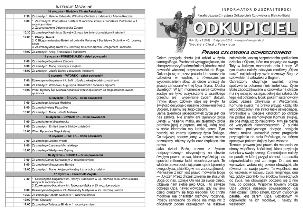Intencje Mszalne 10 stycznia – Niedziela Chrztu Pańskiego 7:30 Za zmarłych: Helenę, Edwarda, Wilhelma Chrobak z rodzicami, i Adama Kruczka I N F O R M AT O R D U S Z PA S T E R S K I Parafia Jezusa Chrystusa Odkupiciela Człowieka w Bielsku-Białej 9:00 1. Za zmarłych: Władysława Fułata w 9. rocznicę śmierci i Stanisława Pietraszko w 1. rocznicę śmierci 2. Za zmarłą Annę Dziechciarską-Zaczek 10:30 Za zmarłego Kazimierza Suwaj w 2. rocznicę śmierci z rodzicami i teściami 12:00 1. Chrzty i Roczki 2. O Błogosławieństwo Boże i zdrowie dla Marianny i Stanisława Drobnik w 40. rocznicę ślubu 3. Za zmarłą Marię Korol w 5. rocznicę śmierci z mężem Grzegorzem i rodzicami 17:00 Za zmarłych: Annę, Franciszka i Stanisława 11 stycznia – PONIEDZIAŁEK – dzień powszedni 7:00 Za zmarłego Bogusława Zendera 8:00 Za zmarłych: Marię Szewczyk z mężem 18:00 Za zmarłych: Józefa Dańda z rodzicami i teściami 12 stycznia – WTOREK – dzień powszedni 7:00 Dziękczynno-błagalna w int. Zofii i Józefa z okazji urodzin z rodzinami 8:00 Za zmarłych: Weronikę i Augustyna Dziendziel z córkami i zięciami 18:00 W int, Rycerzy Św. Michała Achanioła wraz z opiekunem i o błogosławione owoce rycerstwa 13 stycznia – ŚRODA – dzień powszedni 7:00 Za zmarłego Janusza Młodzika 8:00 Za zmarłą Helenę Pszczółka 18:00 Za zmarłych: Marię i Józefa Malinka 14 stycznia – CZWARTEK – dzień powszedni 7:00 Za zmarłą Irenę Młoczkowską 8:00 Za zmarłych: Emilię i Józefa Bibików z dziećmi 18:00 W int. Rycerstwa Niepokalanej 15 stycznia – PIĄTEK – dzień powszedni 7:00 Za zmarłego Lucjana Wcisło 8:00 Za zmarłego Czesława Michalskiego 18:00 Za zmarłego Władysława Zięcinę 16 stycznia – SOBOTA – dzień powszedni 7:00 Za zmarłą Danutę Kurowską w 2. rocznicę śmierci 8:00 Za zmarłego Mieczysława Bomba 18:00 Za zmarłych: Marię i Alojzego Kwaśny i zmarłych z rodziny 17 stycznia – II Niedziela Zwykła 7:30 1. Dziękczynno-błagalna w int. Haliny i Stanisława w 38. rocznicę ślubu oraz Łukasza i Anny w 8. rocznicę ślubu 2. Dziękczynno-błagalna w int. Tadeusza Majka w 85. rocznicę urodzin 9:00 Dziękczynno-błagalna w int. Aleksandry Martyniak w 25. rocznicę urodzin 10:30 Za zmarłego Roberta Murasa w 1. rocznicę śmierci 12:00 W int. Ojczyzny 17:00 Za zmarłego Tadeusza Binda w 1. rocznicę śmierci Rok Rok 18, nr 2 (693) 18, 10 stycznia nr 24 2016 www.parafiakarpackie.pl (609) 22 czerw- Niedziela Chrztu Pańskiego 2 lutego - Święto Ofiarowania Pańskiego Prawa człowieka ochrzczonego Celem przyjęcia chrztu jest udział w życiu samego Boga. Po chrzest wyciąga rękę ten, kto chce przekroczyć barierę śmierci, kto chce mieć pewność wiecznej przynależności do Boga. Dokonuje się to przez polanie lub zanurzenie człowieka w wodzie, z równoczesnym wypowiadaniem słów: „ja ciebie chrzczę /to znaczy zanurzam/ w Imię Ojca i Syna, i Ducha Świętego”. W tym momencie serce człowieka zostaje nie tylko oczyszczone z wszelkiego grzechu, ale i wypełnione życiem Bożym. Innymi słowy, człowiek staje się święty. Ta świętość decyduje o naszym pokrewieństwie z Bogiem, stajemy się Jego dziećmi. Sama tajemnica jakiegokolwiek życia jest dla nas zakryta. Nie znamy ani tajemnicy życia ukrytej w nasieniu maku, ani tajemnicy życia promieniującej z paproci, ani tej, którą nosi w sobie biedronka czy ludzkie serce. Tym bardziej nie znamy tajemnicy życia Bożego. Co najwyżej obserwujemy, w pewnej mierze poznajemy, objawy życia oraz rządzące nim prawa. Jako dzieci Boże, razem z życiem nadprzyrodzonym otrzymujemy na chrzcie świętym pewne prawa, które wyróżniają nas spośród milionów ludzi nieochrzczonych. Te właśnie prawa odsłaniają nam rąbek tajemnicy owego życia, jakie Bóg w nas zapoczątkował. Pierwszym z nich jest prawo mówienia Bogu — „Ojcze”. Przez chrzest zmienia się stosunek Boga do nas. Uznaje On nas za swoje dzieci. Objawia nam siebie jako Ojca, i to zawsze dobrego Ojca, nawet wówczas, gdy my jako dzieci okażemy się tego niegodni. Od chrztu modlitwa ma charakter rozmowy rodzinnej. Prośby zanoszone do nieba nie mają nic z oficjalnych podań czekających na łaskawe załatwienie, lecz są bezpośrednim spotkaniem dziecka z Ojcem, które ma przystęp do swego Taty w każdym momencie dnia i nocy. W tym duchu należy odczytać modlitwę „Ojcze nasz”, najpiękniejszy wzór rozmowy Boga z człowiekiem i człowieka z Bogiem. Ochrzczony otrzymuje również prawo spożywania pokarmu nieśmiertelności. Życie Boże zapoczątkowane w człowieku na chrzcie ma się rozwijać i osiągać pełnię dojrzałości. Do tego jest potrzebny Boski pokarm ustanowiony przez Jezusa Chrystusa w Wieczerniku. Komunię świętą ma prawo przyjąć każdy, kto jest ochrzczony i nie stracił łaski uświęcającej. Wprawdzie w Kościele katolickim po chrzcie nie podaje się niemowlętom Komunii świętej, ale one mają już do niej prawo i tym się różnią od wszystkich nieochrzczonych. Z punktu widzenia praktycznego decyzję przyjęcia chrztu można uzasadnić przez pragnienie przystąpienia do stołu Pańskiego, na którym spoczywa pokarm dający życie wieczne. Trzecim prawem jest prawo do wsparcia ze strony wspólnoty kościelnej, która przyjmuje członka w swoje szeregi. Chrześcijanin należy do parafii, w której przyjął chrzest, i ta parafia odpowiedzialna jest za niego. On zaś ma wprawdzie wobec niej pewne obowiązki, ale również ma swoje prawa. Ta wspólnota ma go wspierać w rozwoju życia religijnego, ona też, gdyby zabrakło mu środków koniecznych do życia, ma obowiązek podzielić się z nim tym, co posiada. Wspólnie bowiem proszą Ojca „chleba naszego powszedniego daj nam dzisiaj”. Chleb zatem, którym dysponuje parafia, jest darem Ojca, udzielonym w odpowiedzi na ich modlitwę, i należy do wszystkich. Czwarte prawo dotyczy dziedziczenia dóbr, jakie posiada n