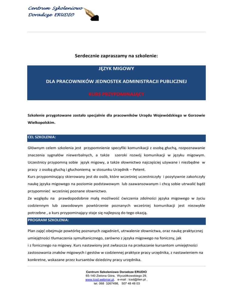 Centrum Szkoleniowo Doradcze ERUDIO Serdecznie zapraszamy na szkolenie: JĘZYK MIGOWY DLA PRACOWNIKÓW JEDNOSTEK ADMINISTRACJI PUBLICZNEJ KURS PRZYPOMINAJĄCY Szkolenie przygotowane zostało specjalnie dla pracowników Urzędu Wojewódzkiego w Gorzowie Wielkopolskim. CEL SZKOLENIA: Głównym celem szkolenia jest przypomnienie specyfiki komunikacji z osobą głuchą, rozpoznawanie znaczenia sygnałów niewerbalnych, a także szeroki rozwój komunikacji w języku migowym. Uczestnicy przypomną sobie język migowy, a także słownictwo najczęściej używane i niezbędne w pracy z osobą głuchą i głuchoniemą w stosunku Urzędnik – Petent. Kurs przypominający skierowany jest do osób, które wcześniej uczestniczyły i pozytywnie zakończyły naukę języka migowego na poziomie podstawowym lub zaawansowanym i chcą sobie utrwalić bądź przypomnieć wcześniej poznane słownictwo. Ze względu na prawdopodobnie małą możliwość ćwiczenia zdolności języka migowego w życiu codziennym lub zawodowym powtórzenie poznanych wcześniej komunikacji jest niezwykle potrzebne , a kurs przypominający staje się najlepszą do tego okazją. PROGRAM SZKOLENIA: Plan zajęć obejmuje powtórkę poznanych zagadnień, utrwalenie słownictwa, oraz naukę praktycznej umiejętności tłumaczenia symultanicznego, zarówno z języka migowego na foniczny, jak i z fonicznego na migowy. Kurs nastawiony jest zwłaszcza na przekazanie kursantom umiejętności zastosowania znaków migowych i gestów w codziennej praktyce pracy urzędnika, z nastawieniem na konkretne, wskazane przez kursantów dziedziny pracy urzędnika. Centrum Szkoleniowo Doradcze ERUDIO 65-140 Zielona Góra, Wyczółkowskiego 29, www.lcsd.webmar.pl, e-mail : [email protected] , tel. 068 3267498, 507 48 48 03 Centrum Szkoleniowo Doradcze ERUDIO METODA SZKOLENIA: Nauka na kursie przypominający prowadzona będzie metodą warsztatową. Uczestnicy po przypomnieniu sobie kolejnych grup znaków, będą wykorzystywali je w zaaranżowanych sytuacjach, z którymi spotykać się mogą na co dzień w pracy. WYKŁADOWCY: Wykładowcą na szkoleniu będzie wykwalifikowany specjalista, tłumacz języka migowego legitymujący się: Certyfikatem uzyskania kwalifikacji Tłumacza Języka Migowego Certyfikatem ukończenia kursu Wykładowca/Trener języka migowego nr MIGAJ.EU/TW/0020/2014/BOR Zaświadczeniem o ukończeniu szkolenia Tłumaczy-Przewodników Osób Głuchoniewidomych – Towarzystwo Pomocy Głuchoniewidomym - Nr zaświadczenia LU/STP/01/2010/03 Zaświadczeniem o zaliczeniu elementarnego i doskonolającego kursu języka migowego dla pracowników służb społecznych wydane Polski Związek Głuchych Zaświadczeniem o ukończeniu kursu Polskiego Języka Migowego na poziomie A1 – Centrum Psychologii Rehabilitacji - Nr zaświadczenia CPR/PJM-A1/05/2014 Zaświadczeniem o ukończeniu kursu Wykładowca/Trener języka migowego nr 196/2014 z dnia 14 sierpnia 2014 r. Referencjami Lubelskiej Jednostki Wojewódzkiej Towarzystwa Pomocy Głuchoniewidomym z dnia 27.11.2014 r. ORGANIZACJA SZKOLENIA: Rozpoczęcie szkolenia w kwietniu 2015 roku. Program szkolenia obejmuje 30 godz. Szkolenie odbędzie się w Urzędzie Wojewódzkim w Gorzowie Wlkp. Grupa 10 osobowa KOSZT UCZESTNICTWA: 650 zł od osoby. Centrum Szkoleniowo Doradcze ERUDIO 65-140 Zielona Góra, Wyczółkowskiego 29, www.lcsd.webmar.pl, e-mail : [email protected] , tel. 068 3267498, 507 48 48 03