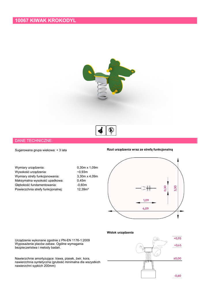 10067 KIWAK KROKODYL DANE TECHNICZNE: Rzut urządzenia wraz ze strefą funkcjonalną Sugerowana grupa wiekowa: + 3 lata Wymiary urządzenia: Wysokość urządzenia: Wymiary strefy funkcjonowania: Maksymalna wysokość upadkowa: Głębokość fundamentowania: Powierzchnia strefy funkcjonalnej: 0,30m x 1,09m ~0,93m 3,30m x 4,09m 0,45m -0,60m 12,39m² Widok urządzenia Urządzenie wykonane zgodnie z PN-EN 1176-1:2009 Wyposażenie placów zabaw. Ogólne wymagania bezpieczeństwa i metody badań. Nawierzchnie amortyzujące: trawa, piasek, żwir, kora, nawierzchnia syntetyczna (grubość minimalna dla wszystkich nawierzchni sypkich 200mm) MATERIAŁY: Całość urządzenia: płyty HDPE Uchwyty, podpory na nogi: tworzywo sztuczne Elementy stalowe: stal ocynkowana kąpielowo, malowana proszkowo Sprężyna: stal ocynkowana kąpielowo, malowana proszkowo Zaślepki: tworzywo sztuczne Podstawa fundamentowa: ażurowa konstrukcja stalowa Fundamenty: beton klasy min. B-15 SATERNUS DISTRIBUTION Sp. z o.o. sp. k. ul. Nowa 32 41-500 Chorzów SATERNUS DISTRIBUTION Sp. z o.o. sp. k. zastrzega sobie wszelkie prawa do ochrony praw autorskich na podstawie Ustawy z dnia 04.02.1994 r. o prawie autorskim i prawach pokrewnych ( DZ. U. Nr 28 poz. 83) a zwłaszcza art. 78 i 79 tejże ustawy. Właściciel certyfikatu: Producent: Dystrybutor: GRUPA SATERNUS Sp. z o.o. S. K. A. (następca prawny Place Zabaw Saternus Sp. z o.o.) Saternus Production Sp. z o.o. sp. k. Saternus Distribution Sp. z o.o. sp. k.