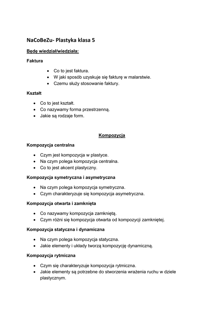 NaCoBeZu- Plastyka klasa 5 Będę wiedział/wiedziała: Faktura    Co to jest faktura. W jaki sposób uzyskuje się fakturę w malarstwie. Czemu służy stosowanie faktury. Kształt    Co to jest kształt. Co nazywamy forma przestrzenną. Jakie są rodzaje form. Kompozycja Kompozycja centralna    Czym jest kompozycja w plastyce. Na czym polega kompozycja centralna. Co to jest akcent plastyczny. Kompozycja symetryczna i asymetryczna   Na czym polega kompozycja symetryczna. Czym charakteryzuje się kompozycja asymetryczna. Kompozycja otwarta i zamknięta   Co nazywamy kompozycja zamkniętą. Czym różni się kompozycja otwarta od kompozycji zamkniętej. Kompozycja statyczna i dynamiczna   Na czym polega kompozycja statyczna. Jakie elementy i układy tworzą kompozycję dynamiczną. Kompozycja rytmiczna   Czym się charakteryzuje kompozycja rytmiczna. Jakie elementy są potrzebne do stworzenia wrażenia ruchu w dziele plastycznym. Perspektywa Perspektywa rzędowa    Co to jest perspektywa rzędowa. Na czym polega perspektywa rzędowa. Czym charakteryzuje się układ pasowy. Perspektywa kulisowa   Czym się charakteryzuje perspektywa kulisowa. Jak jest różnica między perspektywa rzędową, a kulisową. Perspektywa zbieżna (linearna)    Na czym polega perspektywa zbieżna. Co to jest punkt zbiegu. Jakie są rodzaje perspektywy zbieżnej. Perspektywa powietrzna i malarska   Co to jest perspektywa powietrzna. Na czym polega perspektywa malarska. Formy twórczości Czym są działa sztuki    Jakie są formy twórczości. Co nazywamy oryginałem, kopią i reprodukcją działa sztuki. Gdzie można oglądać dzieła sztuki. Rysunek   Czym się charakteryzuje rysunek. Jaka funkcję pełni szkic. Malarstwo   Czym się różni malarstwo realistyczne od malarstwa abstrakcyjnego. Jakie są rodzaje malarstwa.