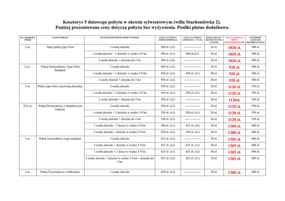 Kosztorys 5 dniowego pobytu w okresie sylwestrowym (willa Stachoniówka 2). Poniżej prezentowane ceny dotyczą pobytu bez wyżywienia. Posiłki płatne dodatkowo. ILU OSOBOWY POKÓJ NAZWA POKOJU: WYSZCZEGÓLNIENIE OSÓB W POKOJU CENA ZA TURNUS (OSOBA DOROSŁA) CENA ZA TURNUS (DZIECKO 3 - 9 LAT) KOSZT OPŁATY KLIMATYCZNEJ ŁĄCZNIE CENA ŁĄCZNA ZA POBYT WSZYSTKICH OSÓB WYSOKOŚĆ ZALICZKI REZERWACYJNEJ 2 os. Mały pokój typu Twin 2 osoby dorosłe 500 zł. (x2) ----------------- 20 zł. 1020 zł. 500 zł. 1 osoba dorosła + 1 dziecko w wieku 3-9 lat 500 zł. (x1) 500 zł.(x1) 20 zł. 1020 zł. 500 zł. 2 osoby dorosłe + dziecko do 3 lat 500 zł. (x2) ----------------- 20 zł. 1020 zł. 500 zł. 2 osoby dorosłe 450 zł. (x2) ----------------- 20 zł. 920 zł. 500 zł. 1 osoba dorosła + 1 dziecko w wieku 3-9 lat 450 zł. (x1) 450 zł. (x1) 20 zł. 920 zł. 500 zł. 2 osoby dorosłe + dziecko do 3 lat 450 zł. (x2) ---------------- 20 zł. 920 zł. 500 zł. 2 osoby dorosłe 550 zł. (x2) ---------------- 20 zł. 1120 zł. 550 zł. 1 osoba dorosła + 1 dziecko w wieku 3-9 lat 550 zł. (x1) 550 zł. (x1) 20 zł. 1120 zł. 550 zł. 2 osoby dorosłe + dziecko do 3 lat 550 zł. (x2) --------------- 20 zł. 1120zł. 550 zł. 2 osoby dorosłe 550 zł. (x2) --------------- 20 zł. 1120 zł. 550 zł. 1 osoba dorosła + 1 dziecko w wieku 3-9 lat 550 zł. (x1) 550 zł. (x1) 20 zł. 1120 zł. 550 zł. 2 osoby dorosłe + dziecko do 3 lat 550 zł. (x2) --------------- 20 zł. 1120 zł. 550 zł. 1 osoba dorosła + 2 dzieci w wieku 3-9 lat 500 zł. (x1) 425 zł. (x2) 30 zł. 1380 zł. 600 zł. 2 osoby dorosłe + dziecko w wieku 3-9 lat 550 zł. (x2) 250 zł. (x1) 30 zł. 1380 zł. 600 zł. 3 osoby dorosłe 425 zł. (x3) ---------------- 30 zł. 1305 zł. 600 zł. 2 osoby dorosłe + dziecko w wieku 3-9 lat 425 zł. (x2) 425 zł. (x1) 30 zł. 1305 zł. 600 zł. 1 osoba dorosła + 2 dzieci w wieku 3-9 lat 425 zł. (x1) 425 zł. (x2) 30 zł. 1305 zł. 600 zł. 2 osoby dorosłe + dziecko w wieku 3-9 lat + dziecko do 3 lat 425 zł. (x2) 425 zł. (x1) 30 zł. 1305 zł. 600 zł. 3 osoby dorosłe 450 zł. (x3) ---------------- 30 zł. 1380 zł. 600 zł. 2 os. 2 os. 2(3) os. 3 os. 3 os. Pokój Dwuosobowy Typu Twin Standard Pokój typu twin z prywatną łazienką Pokój Dwuosobowy z dodatkowym łóżkiem Pokój Trzyosobowy typu standard Pokój Trzyosobowy z balkonem 3 os. 4 os. 4 os. 4(5) os. Pokój Trzyosobowy typu Comfort Pokój Czteroosobowy Pokój Czteroosobowy z balkonem Pokój Rodzinny z łazienką 2 osoby dorosłe + dziecko w wieku 3-9 lat 450 zł. (x2) 450 zł. (x1) 30 zł. 1380 zł. 600 zł. 1 osoba dorosła + 2 dzieci w wieku 3-9 lat 450 zł. (x1) 450 zł. (x2) 30 zł. 1380 zł. 600 zł. 2 osoby dorosłe + dziecko w wieku 3-9 lat + dziecko do 3 lat 450 zł. (x2) 450 zł. (x1) 30 zł. 1380 zł. 600 zł. 3 osoby dorosłe 550 zł. (x3) --------------- 30 zł. 1680 zł. 700 zł. 2 osoby dorosłe + dziecko w wieku 3-9 lat 550 zł. (x2) 550 zł. (x1) 30 zł. 1680 zł. 700 zł.. 1 osoba dorosła + 2 dzieci w wieku 3-9 lat 550 zł. (x1) 550 zł. (x2) 30 zł. 1680 zł. 700 zł. 2 osoby dorosłe + dziecko w wieku 3-9 lat + dziecko do 3 lat 550 zł. (x2) 550 zł. (x1) 30 zł. 1680 zł. 700 zł. 3 osoby dorosłe + dziecko w wieku 3-9 lat 450 zł. (x3) 450 zł. (x1) 40 zł. 1840 zł. 800 zł. 3 osoby dorosłe 500 zł. (x3) --------------- 30 zł. 1530 zł. 750 zł. 3 osoby dorosłe + dziecko do 3 lat 500 zł. (x3) --------------- 30 zł. 1530 zł. 750 zł. 2 osoby dorosłe + dziecko 3-9 lat + dziecko 3-9 lat 450 zł. (x2) 450 zł. (x2) 40 zł. 1840 zł. 800 zł. 4 osoby dorosłe 500 zł. (x4) ---------------- 40 zł. 2040 zł. 900 zł. 3 osoby dorosłe + dziecko 3-9 lat 500 zł. (x3) 500 zł. (x1) 40 zł. 2040 zł. 900 zł. 3 osoby dorosłe + dziecko 3-9 lat + dziecko do 3 lat 500 zł. (x3) 500 zł. (x1) 40 zł. 2040 zł. 900 zł. 2 osoby dorosłe + dziecko 3-9 lat + dziecko 3-9 lat 500 zł. (x2) 500 zł. (x2) 40 zł. 2040 zł. 900 zł. 2 osoby dorosłe + dziecko 3-9 lat + dziecko 3-9 lat + dziecko do 3 lat 500 zł. (x2) 500 zł. (x2) 40 zł. 2040 zł. 900 zł. 4 osoby dorosłe + dziecko 3-9 lat 450 zł. (x4) 450 zł. (x1) 50 zł. 2290 zł. 900 zł. 4 osoby dorosłe 500 zł. (x4) -------------- 40 zł. 2040 zł. 900 zł. 3 osoby dorosłe + dziecko 3-9 lat 500 zł. (x3) 500 zł. (x1) 40 zł. 2040 zł. 900 zł. 3 osoby dorosłe + dziecko 3-9 lat + dziecko 3-9 lat 450 zł. (x3) 450 zł. (x2) 50 zł. 2290 zł. 900 zł. 4 osoby dorosłe + dziecko do 3 lat 500 zł. (x4) ------------- 40 zł. 2040 zł. 900 zł. Uwaga: dla uproszczenia schematu przyjęto, że dziecko powyżej 9 lat to osoba dorosła.