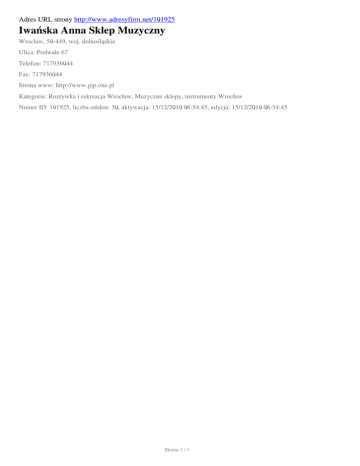 Adres URL strony http://www.adresyfirm.net/101925 Iwańska Anna Sklep Muzyczny Wrocław, 50-449, woj. dolnośląskie Ulica: Podwale 67 Telefon: 717936044 Fax: 717936044 Strona www: http://www.gip.one.pl Kategorie: Rozrywka i rekreacja Wrocław, Muzyczne sklepy, instrumenty Wrocław Numer ID: 101925, liczba odsłon: 30, aktywacja: 15/12/2010 06:54:45, edycja: 15/12/2010 06:54:45 Strona 1 / 1