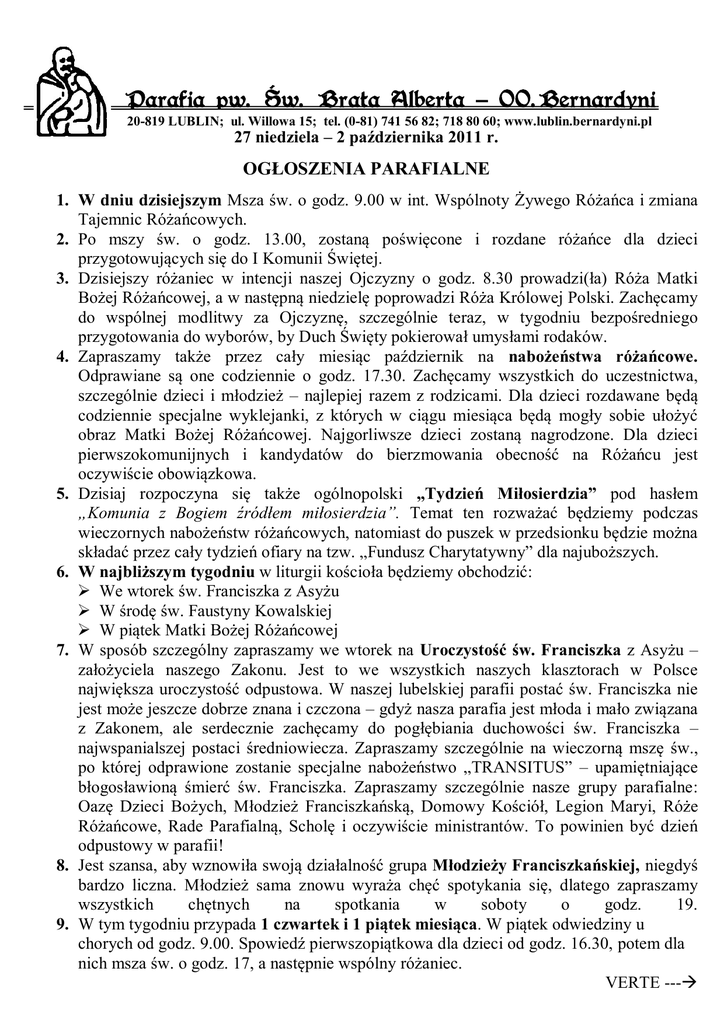 Parafia pw. Św. Brata Alberta – OO.Bernardyni 20-819 LUBLIN; ul. Willowa 15; tel. (0-81) 741 56 82; 718 80 60; www.lublin.bernardyni.pl 27 niedziela – 2 października 2011 r. OGŁOSZENIA PARAFIALNE 1. W dniu dzisiejszym Msza św. o godz. 9.00 w int. Wspólnoty Żywego Różańca i zmiana Tajemnic Różańcowych. 2. Po mszy św. o godz. 13.00, zostaną poświęcone i rozdane różańce dla dzieci przygotowujących się do I Komunii Świętej. 3. Dzisiejszy różaniec w intencji naszej Ojczyzny o godz. 8.30 prowadzi(ła) Róża Matki Bożej Różańcowej, a w następną niedzielę poprowadzi Róża Królowej Polski. Zachęcamy do wspólnej modlitwy za Ojczyznę, szczególnie teraz, w tygodniu bezpośredniego przygotowania do wyborów, by Duch Święty pokierował umysłami rodaków. 4. Zapraszamy także przez cały miesiąc październik na nabożeństwa różańcowe. Odprawiane są one codziennie o godz. 17.30. Zachęcamy wszystkich do uczestnictwa, szczególnie dzieci i młodzież – najlepiej razem z rodzicami. Dla dzieci rozdawane będą codziennie specjalne wyklejanki, z których w ciągu miesiąca będą mogły sobie ułożyć obraz Matki Bożej Różańcowej. Najgorliwsze dzieci zostaną nagrodzone. Dla dzieci pierwszokomunijnych i kandydatów do bierzmowania obecność na Różańcu jest oczywiście obowiązkowa. 5. Dzisiaj rozpoczyna się także ogólnopolski „Tydzień Miłosierdzia” pod hasłem „Komunia z Bogiem źródłem miłosierdzia”. Temat ten rozważać będziemy podczas wieczornych nabożeństw różańcowych, natomiast do puszek w przedsionku będzie można składać przez cały tydzień ofiary na tzw. „Fundusz Charytatywny” dla najuboższych. 6. W najbliższym tygodniu w liturgii kościoła będziemy obchodzić: We wtorek św. Franciszka z Asyżu W środę św. Faustyny Kowalskiej W piątek Matki Bożej Różańcowej 7. W sposób szczególny zapraszamy we wtorek na Uroczystość św. Franciszka z Asyżu – założyciela naszego Zakonu. Jest to we wszystkich naszych klasztorach w Polsce największa uroczystość odpustowa. W naszej lubelskiej parafii postać św. Franciszka nie jest może jeszcze dobrze znana i czczona – gdyż nasza parafia jest młoda i mało związana z Zakonem, ale serdecznie zachęcamy do pogłębiania duchowości św. Franciszka – najwspanialszej postaci średniowiecza. Zapraszamy szczególnie na wieczorną mszę św., po której odprawione zostanie specjalne nabożeństwo „TRANSITUS” – upamiętniające błogosławioną śmierć św. Franciszka. Zapraszamy szczególnie nasze grupy parafialne: Oazę Dzieci Bożych, Młodzież Franciszkańską, Domowy Kościół, Legion Maryi, Róże Różańcowe, Rade Parafialną, Scholę i oczywiście ministrantów. To powinien być dzień odpustowy w parafii! 8. Jest szansa, aby wznowiła swoją działalność grupa Młodzieży Franciszkańskiej, niegdyś bardzo liczna. Młodzież sama znowu wyraża chęć spotykania się, dlatego zapraszamy wszystkich chętnych na spotkania w soboty o godz. 19. 9. W tym tygodniu przypada 1 czwartek i 1 piątek miesiąca. W piątek odwiedziny u chorych od godz. 9.00. Spowiedź pierwszopiątkowa dla dzieci od godz. 16.30, potem dla nich msza św. o godz. 17, a następnie wspólny różaniec. VERTE --- 10. Obecny miesiąc październik będzie szczególnie naznaczony osobą bł. Jana Pawła II. Już za tydzień 9 października będziemy obchodzić doroczny „Dzień papieski”, a 22 października po raz pierwszy liturgiczne wspomnienie bł. Jana Pawła II. Pragniemy się do tego dnia przygotować. Wychodzimy tutaj naprzeciw waszym propozycjom uczczenia Jana Pawła II – które wypisaliście w ostatniej ankiecie do gazetki parafialnej – wśród których najczęściej powtarzała się prośba o specjalne nabożeństwo. A zatem rozpoczniemy takie nabożeństwo w najbliższą sobotę po mszy św. wieczornej i - mamy nadzieję - sobotnie wieczory pozostaną już u nas na zawsze poświęcone modlitwom do bł. Jana Pawła II. Będziemy się także uczyć nowych pieśni do Jana Pawła II, tak jak dzisiaj 10 minut przed każdą mszą św. niedzielną. 11. Jak w każdą pierwszą niedzielę miesiąca informujemy o stanie budowy naszej świątyni. Otóż dobiegają końca prace przy produkcji drzwi wejściowych – głównych i bocznych. Kilka elementów zostało już przywiezionych, a pełny montaż nastąpi jeszcze w tym tygodniu. Po założeniu drzwi będzie można dokończyć posadzkę przy drzwiach. W ostatnim tygodniu zakupiliśmy także 50 krzeseł do Sali konferencyjnej klasztoru, gdyż wcześniej wszystkie krzesła zostały wyniesione tutaj do kościoła i w sali nie pozostało nic, a konieczne są one na spotkania dzieci pierwszokomunijnych, bierzmowanych itp. Wydaliśmy na krzesła 5 tys. zł. Jak zatem wygląda obecnie sprawa finansowa budowy: W minionym miesiącu wrześniu wasze ofiary na rzecz budowy kościoła wyniosły łącznie 8 200 zł. – za co bardzo dziękujemy. Aktualnie stan konta budowy wynosi 44 600 zł. Do zapłaty zaś mamy ok. 60 tys zł. za drzwi wejściowe. Jak łatwo obliczyć do zapłacenia za drzwi brakuje jeszcze ponad 15 tys. zł. Sumę tą musimy wypłacić niestety już w tym tygodniu, dlatego będziemy zmuszeni pożyczyć te pieniądze – w nadziei na szybkie oddanie. Pożyczy nam klasztor w Kalwarii Zebrzydowskiej. Ale na tym nie koniec, gdyż bardzo pilne jest jeszcze wykonanie barierek na całym balkonie (aż 280 m. barierki). Barierki te są konieczne – ze względów bezpieczeństwa - do tzw. odbioru budowlanego, byśmy mogli zgodnie z prawem się tu gromadzić i poświęcić kościół – inaczej mogliby nam zabronić. Do odbioru konieczne jest także odgromienie krzyża na dachu i wykonanie wszelkich ekspertyz i dokumentacji budynku. Staramy się to wszystko po kolei gromadzić, aby jeszcze w tym roku dokonać odbioru i poświęcenia. Wiemy, że nie będzie łatwo, ale ufamy Bożej Opatrzności. Dziękujemy także W
