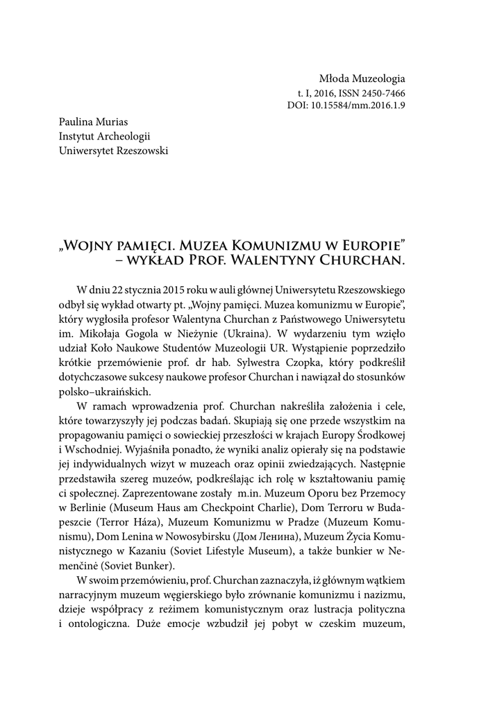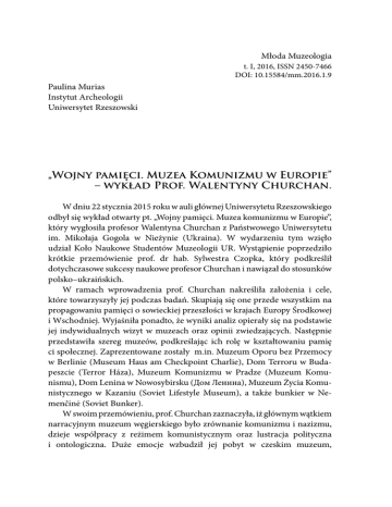 Młoda Muzeologia t. I, 2016, ISSN 2450-7466 DOI: 10.15584/mm.2016.1.9 Paulina Murias Instytut Archeologii Uniwersytet Rzeszowski „Wojny pamięci. Muzea Komunizmu w Europie” – wykład Prof. Walentyny Churchan. W dniu 22 stycznia 2015 roku w auli głównej Uniwersytetu Rzeszowskiego odbył się wykład otwarty pt. „Wojny pamięci. Muzea komunizmu w Europie”, który wygłosiła profesor Walentyna Churchan z Państwowego Uniwersytetu im. Mikołaja Gogola w Nieżynie (Ukraina). W wydarzeniu tym wzięło udział Koło Naukowe Studentów Muzeologii UR. Wystąpienie poprzedziło krótkie przemówienie prof. dr hab. Sylwestra Czopka, który podkreślił dotychczasowe sukcesy naukowe profesor Churchan i nawiązał do stosunków polsko–ukraińskich. W ramach wprowadzenia prof. Churchan nakreśliła założenia i cele, które towarzyszyły jej podczas badań. Skupiają się one przede wszystkim na propagowaniu pamięci o sowieckiej przeszłości w krajach Europy Środkowej i Wschodniej. Wyjaśniła ponadto, że wyniki analiz opierały się na podstawie jej indywidualnych wizyt w muzeach oraz opinii zwiedzających. Następnie przedstawiła szereg muzeów, podkreślając ich rolę w kształtowaniu pamię ci społecznej. Zaprezentowane zostały m.in. Muzeum Oporu bez Przemocy w Berlinie (Museum Haus am Checkpoint Charlie), Dom Terroru w Budapeszcie (Terror Háza), Muzeum Komunizmu w Pradze (Muzeum Komunismu), Dom Lenina w Nowosybirsku (Дом Ленина), Muzeum Życia Komunistycznego w Kazaniu (Soviet Lifestyle Museum), a także bunkier w Nemenčinė (Soviet Bunker). W swoim przemówieniu, prof. Churchan zaznaczyła, iż głównym wątkiem narracyjnym muzeum węgierskiego było zrównanie komunizmu i nazizmu, dzieje współpracy z reżimem komunistycznym oraz lustracja polityczna i ontologiczna. Duże emocje wzbudził jej pobyt w czeskim muzeum, 60 Sprawozdania a panującą tam atmosferę określiła jako „agresywna ironia” i zdystansowanie. Negatywne odczucia towarzyszyły jej podczas zwiedzania litewskiego bunkra, gdyż według prof. Churchan głównym celem tego miejsca było nastawienie na zysk, zamiast podtrzymywania pamięci o zbrodniach komunizmu. Prezentując wyżej wymienione instytucje prof. Churchan dokonała trafnej analizy porównawczej oraz podzieliła się ze słuchaczami odczuciami towarzyszącymi jej podczas zwiedzania. Zaznaczyła, iż niektóre z muzeów są zaangażowane w walkę o tworzenie nowej pamięci o komunizmie oraz promują postsowieckie „ideały”. Prof. Churchan przyjęła krytyczne stanowisko wobec „disneylandyzacji” oraz komercjalizacji muzeów komunizmu. Podsumowując, prof. Churchan podkreśliła strategię symbolicznej „sprzedaży komunizmu” w niektórych z tych placówek, nadając temu zjawisku negatywny wydźwięk. Po wykładzie, wywiązała się dyskusja, która dopełniła ponadgodzinne spotkanie. Streszczenie: Prof. Walentyna Churchan przedstawiła na wykładzie szereg muzeów, związanych z historią socjalizmu w Europie Środkowej i Wschodniej, zwracając szczególną uwagę na odmienny sposób prezentowania tej tematyki w poszczególnych instytucjach. Przyjęła krytyczne stanowisko, zwłaszcza wobec propagowania postsowieckich „ideałów” a także komercjalizacji i „disneylandyzacji” tego typu muzeów, podkreślając ich rolę w kształtowaniu pamięci społecznej.