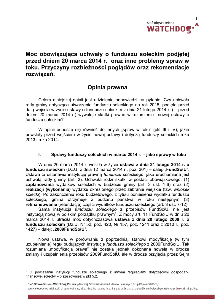 1 Moc obowiązująca uchwały o funduszu sołeckim podjętej przed dniem 20 marca 2014 r. oraz inne problemy spraw w toku. Przyczyny rozbieżności poglądów oraz rekomendacje rozwiązań. Opinia prawna Celem niniejszej opinii jest udzielenie odpowiedzi na pytanie: Czy uchwała rady gminy dotycząca utworzenia funduszu sołeckiego na rok 2015, podjęta przed datą wejścia w życie ustawy o funduszu sołeckim z dnia 21 lutego 2014 r. (tj. przed dniem 20 marca 2014 r.) wywołuje skutki prawne w rozumieniu nowej ustawy o funduszu sołeckim? W opinii odnoszę się również do innych „spraw w toku” (pkt III i IV), jakie powstały przed wejściem w życie nowej ustawy i dotyczą funduszy sołeckich roku 2013 i roku 2014. I. Sprawy funduszy sołeckich w marcu 2014 r. – jako sprawy w toku W dniu 20 marca 2014 r. weszła w życie ustawa z dnia 21 lutego 2014 r. o funduszu sołeckim (Dz.U. z dnia 12 marca 2014 r., poz. 301) – dalej: „FundSołU”. Ustawa ta ustanawia instytucję prawną funduszu sołeckiego, jaka uruchamiana jest uchwałą rady gminy (art. 2). Uchwała rodzi skutki w postaci obowiązkowego: (1) zaplanowania wydatków sołeckich w budżecie gminy (art. 3 ust. 1-6) oraz (2) realizacji (wykonania) wydatku określonego przez zebranie wiejskie (tzw. wniosek sołecki). Po zakończeniu roku budżetowego, z tytułu poniesienia wydatku funduszu sołeckiego, gmina otrzymuje z budżetu państwa w roku następnym (3) refinansowanie (refundację) części wydatków funduszu sołeckiego (art. 3 ust. 7-12). Sama instytucja funduszu sołeckiego z przepisów FundSołU, nie jest instytucją nową w polskim porządku prawnym1. Z mocy art. 11 FundSołU w dniu 20 marca 2014 r. utraciła moc dotychczasowa ustawa z dnia 20 lutego 2009 r. o funduszu sołeckim (Dz.U. Nr 52, poz. 420, Nr 157, poz. 1241 oraz z 2010 r., poz. 1427) – dalej: „2009FundSołU”. Nowa ustawa, w porównaniu z poprzednią, stanowi modyfikację (w tym uzupełnienie) reguł budujących instytucję funduszu sołeckiego z 2009FundSołU. Tak rozumiana „modyfikacja prawa” nie została jednak dokonana nowelą w drodze zmiany i uzupełnienia przepisów 2009FundSołU, ale w drodze przyjęcia przez Sejm O powiązaniu instytucji funduszu sołeckiego z innymi regulacjami dotyczącymi gospodarki finansowej sołectw – piszę również w pkt 5.2. 1 2 ustawy nowej (pełnej). Powstają w związku z tym liczne problemy z zakresu przejścia dotychczasowego stanu prawnego w nowy stan regulowany przepisami FundSołU. Pod stanem prawnym wynikającym z 2009FundSołU powstały określone stosunki prawne, uprawnienia i obowiązki. Co dzieje się z nimi po dniu 19 marca 2014 r.? Nie budzi wątpliwości to, że do osądu spraw w pełni zakończonych przed dniem 20 marca 2014 r. (np. osądu: czy kwota refinansowania przekazana gminie w roku 2013 za rok 2012, jest poprawnie obliczona) stosuje się przepisy uchylonej 2009FundSołU. Nowa FundSołU, w myśl zasady lex retro non agit, nie może prostować, ani cofać tamtych skutków prawnych. Problemem poważniejszym dla organów stosujących prawo (tj. gmin, wojewodów, organów nadzoru, organów kontroli, sądów) jest to, że przed dniem uchylenia 2009FinPublU funkcjonowały również takie „prawa i obowiązki” (po stronie wspólnot sołeckich oraz po stronie gmin i wojewodów), które okazały się być niezakończonymi sprawami w toku. Powstałe przed dniem 20 marca 2014 uprawnienia i obowiązki oraz stany prawne dotyczyć mogą, w ten sposób, trzech funduszy sołeckich: a) fundusz sołecki roku 2013 (refinansowanie) – jako nabyte przez gminę uprawnienie do otrzymania w roku 2014 (z mocy decyzji wojewody) zwrotu z budżetu państwa części środków wydatkowanych na fundusz sołecki w budżecie gminy z roku 2013 - na podstawie art. 2 ust. 4 -9 2009FundSołU w związku z rozporządzeniem Ministra Finansów z dnia 25 stycznia 2010 r. w sprawie trybu zwrotu części wydatków gmin w ramach funduszu sołeckiego (Dz.U. Nr 21, poz. 106); b) fundusz sołecki roku 2014 (planowanie, realizacja, refinansowanie) – jako sytuacje prawne z racji zaplanowania przedsięwzięć sołeckich w budżecie gminy roku 2014 i obowiązku ich realizacji do końca roku 2014 – z art. 1 i art. 2 2009FudSołU; c) fundusz sołecki roku 2015 (planowanie) – jako wola rady gminy dotycząca uruchomienia funduszu sołeckiego w przyszłym budżecie gminy roku 2015 - wynikająca z uchwały rady gminy (miasta) podjętej przed dniem 20 marca 2014 r. - na podstawie art. 1 ust. 1 2009FundSołU. Rodzi się w związku z tym pytanie: jaka jest treść norm prawnych regulujących od dnia 20 marca 2014 r. trzy ww. stany prawne funduszy sołeckich z lat 2013, 2014 i 2015, które powstały pod rządami uchylonych przepisów 2009FundSołU? II. Normy przejściowe - intertemporalne Odpowiedzią, co do sposobu załatwienia trzech opisanych powyżej stanów prawnych wynikających z uchylanej 2009FunSołU powinny być odpowiednio 3 sformułowane przepisy nowej FundSołU. Co zostanie dowiedzione poniżej, czasami nawet „brak zapisu” może zostać potraktowany jako dorozumiana wola ustawodawcy o zastosowaniu niezapisanych w ustawie ogólnych norm polskiego systemu prawnego. 2.1. Postulaty doktryny prawniczej oraz orzecznictwa Co do zasady, każda nowa ustawa, działa „do przodu”, przez co nowe stany prawne, powstałe pod jej rządami, są w pełni normowane przepisami tej ustawy. Zakładając względną stabilność prawa i niezmienność woli Sejmu, przyjąć należy, że przepisy FundSołU znajdują pełne zastosowanie do funduszy sołeckich w budżetach gmin na rok 2015 i na lata kolejne. Sytuacja prawna się komplikuje, gdy dochodzi do zmiany normy dotychczasowych na rozwiązania nowe. Zmiany te mogą polegać na uchyleniu starych norm, bądź na celowej ich modyfikacji, w tym na stworzeniu specjalnej regulacji dla spraw w toku. W takich sytuacjach przy osądzie spraw zastanych, wiadomo jedynie, że zachowania, zdar