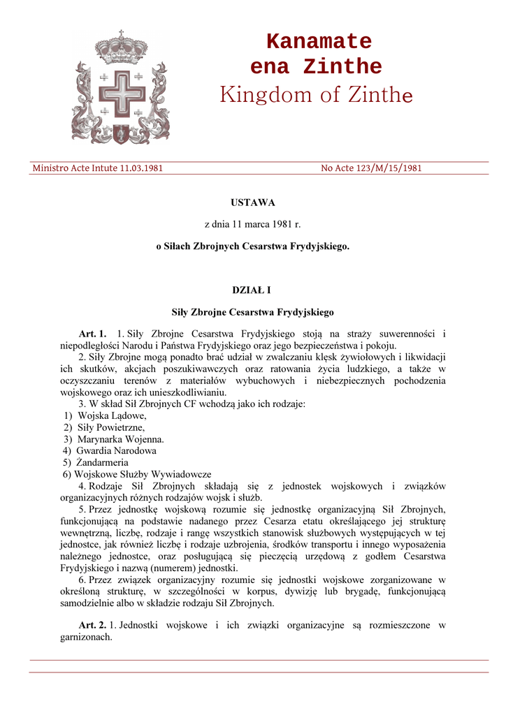 Kanamate ena Zinthe Kingdom of Zinthe Ministro Acte Intute 11.03.1981 No Acte 123/M/15/1981 USTAWA z dnia 11 marca 1981 r. o Siłach Zbrojnych Cesarstwa Frydyjskiego. DZIAŁ I Siły Zbrojne Cesarstwa Frydyjskiego Art. 1. 1. Siły Zbrojne Cesarstwa Frydyjskiego stoją na straży suwerenności i niepodległości Narodu i Państwa Frydyjskiego oraz jego bezpieczeństwa i pokoju. 2. Siły Zbrojne mogą ponadto brać udział w zwalczaniu klęsk żywiołowych i likwidacji ich skutków, akcjach poszukiwawczych oraz ratowania życia ludzkiego, a także w oczyszczaniu terenów z materiałów wybuchowych i niebezpiecznych pochodzenia wojskowego oraz ich unieszkodliwianiu. 3. W skład Sił Zbrojnych CF wchodzą jako ich rodzaje: 1) Wojska Lądowe, 2) Siły Powietrzne, 3) Marynarka Wojenna. 4) Gwardia Narodowa 5) Żandarmeria 6) Wojskowe Służby Wywiadowcze 4. Rodzaje Sił Zbrojnych składają się z jednostek wojskowych i związków organizacyjnych różnych rodzajów wojsk i służb. 5. Przez jednostkę wojskową rozumie się jednostkę organizacyjną Sił Zbrojnych, funkcjonującą na podstawie nadanego przez Cesarza etatu określającego jej strukturę wewnętrzną, liczbę, rodzaje i rangę wszystkich stanowisk służbowych występujących w tej jednostce, jak również liczbę i rodzaje uzbrojenia, środków transportu i innego wyposażenia należnego jednostce, oraz posługującą się pieczęcią urzędową z godłem Cesarstwa Frydyjskiego i nazwą (numerem) jednostki. 6. Przez związek organizacyjny rozumie się jednostki wojskowe zorganizowane w określoną strukturę, w szczególności w korpus, dywizję lub brygadę, funkcjonującą samodzielnie albo w składzie rodzaju Sił Zbrojnych. Art. 2. 1. Jednostki wojskowe i ich związki organizacyjne są rozmieszczone w garnizonach. Kanamate ena Zinthe Kingdom of Zinthe 2. Cesarz powierza pełnienie funkcji dowódcy garnizonu żołnierzowi zawodowemu zajmującemu stanowisko służbowe w tym garnizonie, a także zwalnia z tej funkcji. 3. Cesarz, w drodze dekretu, tworzy, przekształca i znosi garnizony, określa zadania ich dowódców oraz siedziby i terytorialny zasięg właściwości, z uwzględnieniem w szczególności podziału terytorialnego państwa. Art. 3. 1. W stanie najwyższej konieczności lub też w innym dowolnym czasie Cesarz może wydać dekret powołujący do służby wojskowej w Siłach Zbrojnych obywateli Cesarstwa Frydyjskiego. Nadzwyczajnemu /wówczas/ obowiązkowi obrony podlegają wszyscy obywatele Cesarstwa Frydyjskiego zdolni ze względu na wiek i stan zdrowia do wykonywania tego obowiązku. Obywatel Cesarstwa Frydyjskiego będący równocześnie obywatelem innego państwa nie podlega nadzwyczajnemu obowiązkowi obrony, jeżeli stale zamieszkuje poza granicami Cesarstwa. 2. W ramach nadzwyczajnego obowiązku obrony obywatele Cesarstwa są obowiązani do pełnienia służby wojskowej, służby w obronie cywilnej, odbywania przysposobienia obronnego, uczestniczenia w samoobronie ludności, pełnienia służby w jednostkach zmilitaryzowanych oraz do wykonywania świadczeń na rzecz obrony - na zasadach i w zakresie określonych w ustawie. 2. Ochotnicze spełnianie zadań w ramach nadzwyczajnego obowiązku obrony Cesarstwa Frydyjskiego jest prawem wszystkich obywateli Cesarstwa. Art. 4. 1. Na mocy Konstytucji Cesarstwa Frydyjskiego Cesarz jest najwyższym zwierzchnikiem Sił Zbrojnych. Cesarz, stojąc na straży suwerenności i bezpieczeństwa państwa, nienaruszalności i niepodzielności jego terytorium, w szczególności: 1) zatwierdza strategię bezpieczeństwa narodowego, 2) wydaje, w drodze dekretu, Polityczno-Strategiczną Dyrektywę Obronną Cesarstwa Frydyjskiego oraz inne dokumenty wykonawcze do strategii bezpieczeństwa narodowego, 3) zatwierdza, na wniosek Sztabu Generalnego plany krajowych ćwiczeń systemu obronnego i kieruje ich przebiegiem, 4) postanawia, w drodze dekretu o wprowadzeniu albo zmianie określonego stanu gotowości obronnej państwa, 5) wydaje rozkazy podległemu mu Sztabowi Generalnemu a przez niego zarządza wszystkimi siłami wchodzącymi w skład Sił Zbrojnych. 5) inicjuje i patronuje przedsięwzięciom ukierunkowanym na kształtowanie postaw patriotycznych i obronnych w społeczeństwie. Art. 5. 1.Cesarz wykonuje zadania w zakresie bezpieczeństwa i obronności przy pomocy Sztabu Generalnego. Sztab Generalny jest organem doradczym i wykonawczym dla urzędu Cesarza. Kanamate ena Zinthe Kingdom of Zinthe 2. Sztabem Generalnym kieruje Szef Sztabu, mając do dyspozycji sekretarza oraz członków Sztabu generalnego. Cesarz, sprawując zwierzchnictwo nad Siłami Zbrojnymi, powołuje członków Sztabu Generalnego oraz wyznacza Szefa Sztabu. Kadencja członka Sztabu Generalnego sprawowana jest do odwołania, każdy członek Sztabu generalnego może być odwołany w każdej chwili przez Cesarza. 3. Sztab Generalny podlega wyłącznie i jedynie rozkazom Cesarza. 4. Działalność Sztabu Generalnego jest finansowana ze środków budżetowych Sił Zbrojnych. 5. Cesarz określa organizację oraz zakres działania Sztabu Generalnego. 6. Każda decyzja Sztabu Generalnego wymaga zatwierdzenia przez Cesarza. 7. Zatwierdzone przez Cesarza decyzje Sztabu Generalnego są wiążącymi rozkazami dla Sił Zbrojnych Cesarstwa Frydyjskiego i muszą być wykonane w sposób i terminach ściśle określonych w decyzjach. 6. Członek Sztabu Generalnego może być sądzony wyłącznie przez Sądy Wojskowe. 7. Szef Wojskowych Służb Wywiadowczych oraz Szef Gwardii Narodowej podlegają bezpośrednio rozkazom Cesarza. 8. Siły specjalne Cesarstwa Frydyjskiego bez względu na ich przynależność do rodzaju Sił Zbrojnych - za wyjątkiem sił specjalnych Żandarmerii - oraz Batalion Ochrony Rządu podlegają bezpośrednio rozkazom Cesarza. Art. 6. Cesarz, sprawując zwierzchnictwo nad Siłami Zbrojnymi, w szczególności określa, na wniosek Sztabu Generalnego, główne kierunki rozwoju Sił Zbrojnych oraz ich przygotowa