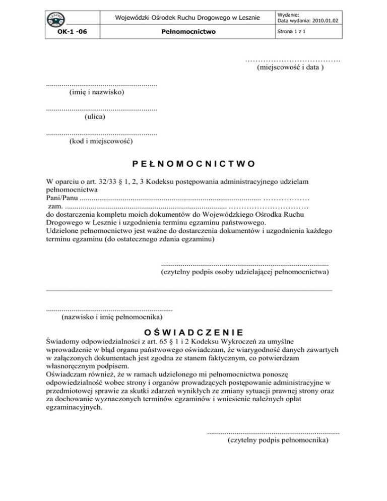 Wojewódzki Ośrodek Ruchu Drogowego w Lesznie OK-1 -06 Pełnomocnictwo Wydanie: Data wydania: 2010.01.02 Strona 1 z 1 ………………………………. (miejscowość i data ) ......................................................... (imię i nazwisko) ......................................................... (ulica) ......................................................... (kod i miejscowość) PEŁNOMOCNICTWO W oparciu o art. 32/33 § 1, 2, 3 Kodeksu postępowania administracyjnego udzielam pełnomocnictwa Pani/Panu ............................................................................................. ……………… zam. ................................................................................... .………………………… do dostarczenia kompletu moich dokumentów do Wojewódzkiego Ośrodka Ruchu Drogowego w Lesznie i uzgodnienia terminu egzaminu państwowego. Udzielone pełnomocnictwo jest ważne do dostarczenia dokumentów i uzgodnienia każdego terminu egzaminu (do ostatecznego zdania egzaminu) ...................................................................................... (czytelny podpis osoby udzielającej pełnomocnictwa) ________________________________________________________________________________________ ................................................................. (nazwisko i imię pełnomocnika) OŚWIADCZENIE Świadomy odpowiedzialności z art. 65 § 1 i 2 Kodeksu Wykroczeń za umyślne wprowadzenie w błąd organu państwowego oświadczam, że wiarygodność danych zawartych w załączonych dokumentach jest zgodna ze stanem faktycznym, co potwierdzam własnoręcznym podpisem. Oświadczam również, że w ramach udzielonego mi pełnomocnictwa ponoszę odpowiedzialność wobec strony i organów prowadzących postępowanie administracyjne w przedmiotowej sprawie za skutki zdarzeń wynikłych ze zmiany sytuacji prawnej strony oraz za dochowanie wyznaczonych terminów egzaminów i wniesienie należnych opłat egzaminacyjnych. .................................................................... (czytelny podpis pełnomocnika)