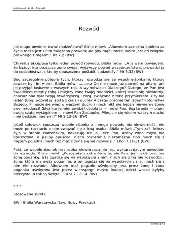 nadzieja.pl - brak - Rozwód Rozwód Jak długo powinno trwać małżeństwo? Biblia mówi: „Albowiem zamężna kobieta za życia męża jest z nim związana prawem; ale gdy mąż umrze, wolna jest od związku prawnego z mężem.” Rz 7,2 (BW) Chrystus akceptuje tylko jeden powód rozwodu. Biblia mówi: „A Ja wam powiadam, że każdy, kto opuszcza żonę swoją, wyjąwszy powód wszeteczeństwa, prowadzi ją do cudzołóstwa, a kto by opuszczoną poślubił, cudzołoży.” Mt 5,32 (BW) Bóg szczególnie potępia tych, którzy rozwodzą się ze współmałżonkami, którzy zawsze byli im wierni. Biblia mówi: „...Lecz On nie może już patrzeć na ofiarę, ani jej przyjąć łaskawie z waszych rąk. A wy mówicie: Dlaczego? Dlatego, że Pan jest świadkiem między tobą i między żoną twojej młodości, której stałeś się niewierny, chociaż ona była twoją towarzyszką i żoną, związaną z tobą przymierzem. Czy nie Jeden (Bóg) uczynił ją istotą z ciała i ducha? A czego pragnie ten Jeden? Potomstwa Bożego. Pilnujcie się więc w waszym duchu i niech nikt nie będzie niewierny żonie swej młodości! Gdyż kto jej nienawidzi i oddala ją — mówi Pan, Bóg Izraela — plami swoją szatę występkiem — mówi Pan Zastępów. Pilnujcie się więc w waszym duchu i nie bądźcie niewierni!” Ml 2,13-16 (BW) Jeżeli człowiek opuszcza współmałżonka z innego powodu niż niewierność, nie może po rozstaniu z nim związać się z inną osobą. Biblia mówi: „Tym zaś, którzy żyją w stanie małżeńskim, nakazuję nie ja, lecz Pan, ażeby żona męża nie opuszczała, a jeśliby opuściła, niech pozostanie niezamężna albo niech się z mężem pojedna; niech też mąż z żoną się nie rozwodzi.” 1Kor 7,10-11 (BW) Fakt, że współmałżonek jest osobą niewierzącą nie jest wystarczającym powodem do rozwodu. Biblia mówi: „Pozostałym zaś mówię ja, nie Pan: Jeśli jakiś brat ma żonę pogankę, a ta zgadza się na współżycie z nim, niech się z nią nie rozwodzi; i żona, która ma męża poganina, a ten zgadza się na współżycie z nią, niech się z nim nie rozwodzi. Albowiem mąż poganin uświęcony jest przez żonę i żona poganka uświęcona jest przez wierzącego męża; inaczej dzieci wasze byłyby nieczyste, a tak są święte.” 1Kor 7,12-14 (BW) *** Stosowane skróty: BW - Biblia Warszawska (tzw. Nowy Przekład) strona 1 / 2 nadzieja.pl - brak - Rozwód BT - Biblia Tysiąclecia BWP - Biblia Warszawsko-Praska (Biblia bpa Romaniuka) strona 2 / 2 Powered by TCPDF (www.tcpdf.org)