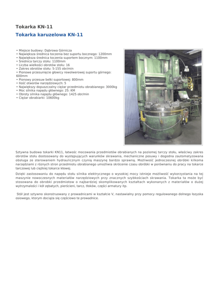 Tokarka KN-11 Tokarka karuzelowa KN-11 • Miejsce budowy: Dąbrowa Górnicza • Największa średnica toczenia bez suportu bocznego: 1200mm • Największa średnica toczenia suportem bocznym: 1100mm • Średnica tarczy stołu: 1100mm • Liczba wielkości obrotów stołu: 16 • Zakres obrotów stołu: 5-155 obr/min • Pionowe przesunięcie głowicy rewolwerowej suportu górnego: 600mm • Pionowy przesuw belki suportowej: 800mm • Ilość otworów narzędziowych: 5 • Największy dopuszczalny ciężar przedmiotu obrabianego: 3000kg • Moc silnika napędu głównego: 25: KM • Obroty silnika napędu głównego: 1425 obr/min • Ciężar obrabiarki: 10600kg Sztywna budowa tokarki KN11, łatwośc mocowania przedmiotów obrabianych na poziomej tarczy stołu, właściwy zakres obrotów stołu dostosowany do występujących warunków skrawania, mechaniczne posuwy i dogodna zautomatyzowana obsługa ze sterowaniem hydraulicznym czynią maszynę bardzo sprawną. Możliwość jednoczesnej obróbki kilkoma narzędziami z róznych stron przedmiotu obrabianego umożliwia skrócenie czasu obróbki w porównaniu do pracy na tokarce tarczowej lub ciężkiej tokarce kłowej. Dzięki zastosowaniu do napędu stołu silnika elektrycznego o wysokiej mocy istnieje możliwość wykorzystania na tej maszynie nowoczesnych materiałów narzędziowych przy znacznych szybkościach skrawania. Tokarka ta może być stosowana do obrobki przedmiotow o najbardziej skomplikowanych kształtach wykonanych z materiałów o dużej wytrzymalości i kół zębatych, pierścieni, tarcz, tłoków, części armatury itp. Stół jest sztywno skonstruowany z prowadnicami w kształcie V, nastawialny przy pomocy regulowanego dolnego łozyska osiowego, ktorym dociąża się częściowo te prowadnice.
