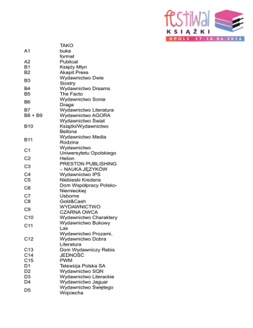 A1 A2 B1 B2 B3 B4 B5 B6 B7 B8 + B9 B10 B11 C1 C2 C3 C4 C5 C6 C7 C8 C9 C10 C11 C12 C13 C14 C15 D1 D2 D3 D4 D5 TAKO buka format Publicat Księży Młyn Akapit Press Wydawnictwo Dwie Siostry Wydawnictwo Dreams The Facto Wydawnictwo Sonia Draga Wydawnictwo Literatura Wydawnictwo AGORA Wydawnictwo Świat Książki/Wydawnictwo Bellona Wydawnictwo Media Rodzina Wydawnictwo Uniwersytetu Opolskiego Helion PRESTON PUBLISHING – NAUKA JĘZYKÓW Wydawnictwo IPS Niebieski Kredens Dom Współpracy PolskoNiemieckiej Usborne Gold&Cash WYDAWNICTWO CZARNA OWCA Wydawnictwo Charaktery Wydawnictwo Bukowy Las Wydawnictwo Prozami, Wydawnictwo Dobra Literatura Dom Wydawniczy Rebis JEDNOŚĆ PWM Telewizja Polska SA Wydawnictwo SQN Wydawnictwo Literackie Wydawnictwo Jaguar Wydawnictwo Świętego Wojciecha