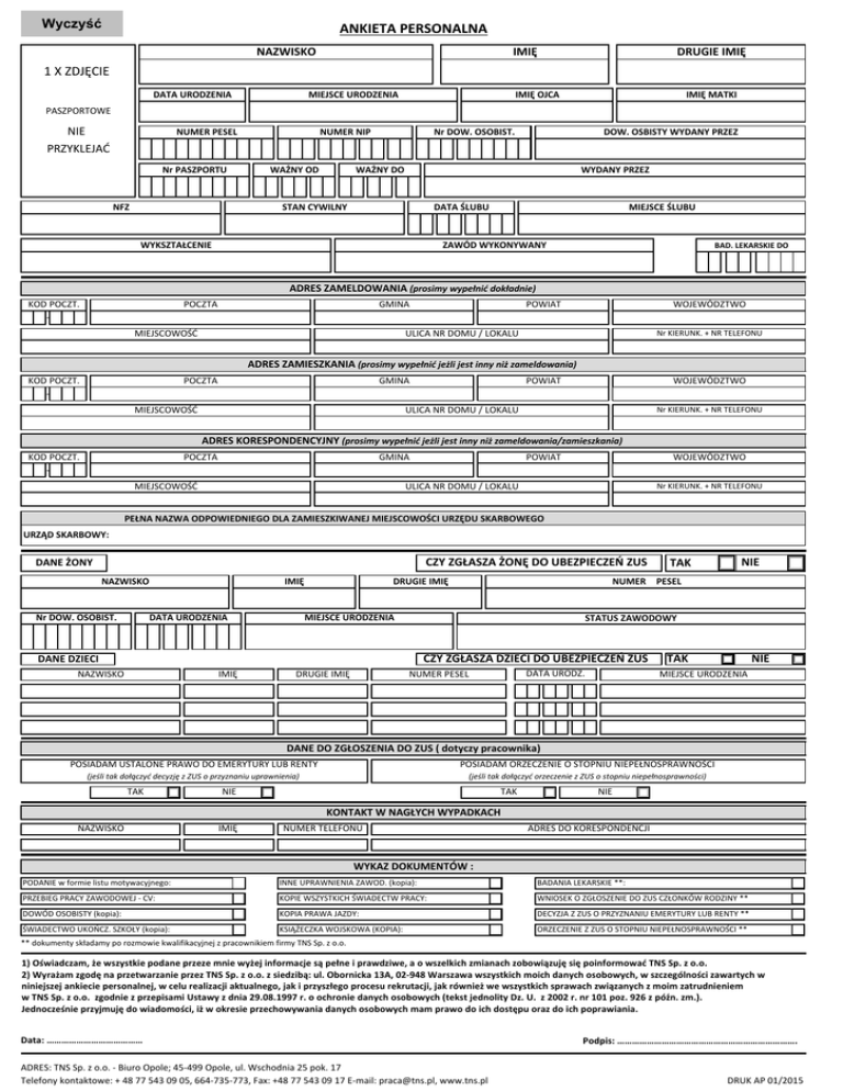 ANKIETA PERSONALNA Wyczyść NAZWISKO IMIĘ DRUGIE IMIĘ 1 X ZDJĘCIE DATA URODZENIA MIEJSCE URODZENIA IMIĘ OJCA IMIĘ MATKI PASZPORTOWE NIE PRZYKLEJAĆ NUMER PESEL Nr PASZPORTU NFZ NUMER NIP WAŻNY OD Nr DOW. OSOBIST. DOW. OSBISTY WYDANY PRZEZ WAŻNY DO WYDANY PRZEZ STAN CYWILNY DATA ŚLUBU WYKSZTAŁCENIE MIEJSCE ŚLUBU ZAWÓD WYKONYWANY BAD. LEKARSKIE DO ADRES ZAMELDOWANIA (prosimy wypełnić dokładnie) KOD POCZT. - POCZTA GMINA MIEJSCOWOŚĆ POWIAT WOJEWÓDZTWO ULICA NR DOMU / LOKALU Nr KIERUNK. + NR TELEFONU ADRES ZAMIESZKANIA (prosimy wypełnić jeżli jest inny niż zameldowania) KOD POCZT. - POCZTA GMINA MIEJSCOWOŚĆ POWIAT WOJEWÓDZTWO ULICA NR DOMU / LOKALU Nr KIERUNK. + NR TELEFONU ADRES KORESPONDENCYJNY (prosimy wypełnić jeżli jest inny niż zameldowania/zamieszkania) KOD POCZT. - POCZTA GMINA MIEJSCOWOŚĆ POWIAT WOJEWÓDZTWO ULICA NR DOMU / LOKALU Nr KIERUNK. + NR TELEFONU PEŁNA NAZWA ODPOWIEDNIEGO DLA ZAMIESZKIWANEJ MIEJSCOWOŚCI URZĘDU SKARBOWEGO URZĄD SKARBOWY: CZY ZGŁASZA ŻONĘ DO UBEZPIECZEŃ ZUS DANE ŻONY NAZWISKO Nr DOW. OSOBIST. IMIĘ DATA URODZENIA DRUGIE IMIĘ NUMER MIEJSCE URODZENIA CZY ZGŁASZA DZIECI DO UBEZPIECZEŃ ZUS IMIĘ DRUGIE IMIĘ NIE STATUS ZAWODOWY DANE DZIECI NAZWISKO TAK PESEL DATA URODZ. NUMER PESEL TAK NIE MIEJSCE URODZENIA DANE DO ZGŁOSZENIA DO ZUS ( dotyczy pracownika) POSIADAM USTALONE PRAWO DO EMERYTURY LUB RENTY POSIADAM ORZECZENIE O STOPNIU NIEPEŁNOSPRAWNOŚCI (jeśli tak dołączyć decyzję z ZUS o przyznaniu uprawnienia) (jeśli tak dołączyć orzeczenie z ZUS o stopniu niepełnosprawności) TAK NIE TAK NIE KONTAKT W NAGŁYCH WYPADKACH NAZWISKO IMIĘ NUMER TELEFONU ADRES DO KORESPONDENCJI WYKAZ DOKUMENTÓW : PODANIE w formie listu motywacyjnego: INNE UPRAWNIENIA ZAWOD. (kopia): BADANIA LEKARSKIE **: PRZEBIEG PRACY ZAWODOWEJ - CV: KOPIE WSZYSTKICH ŚWIADECTW PRACY: WNIOSEK O ZGŁOSZENIE DO ZUS CZŁONKÓW RODZINY ** DOWÓD OSOBISTY (kopia): KOPIA PRAWA JAZDY: DECYZJA Z ZUS O PRZYZNANIU EMERYTURY LUB RENTY ** ŚWIADECTWO UKOŃCZ. SZKOŁY (kopia): KSIĄŻECZKA WOJSKOWA (KOPIA): ORZECZENIE Z ZUS O STOPNIU NIEPEŁNOSPRAWNOŚCI ** ** dokumenty składamy po rozmowie kwalifikacyjnej z pracownikiem firmy TNS Sp. z o.o. 1) Oświadczam, że wszystkie podane przeze mnie wyżej informacje są pełne i prawdziwe, a o wszelkich zmianach zobowiązuję się poinformować TNS Sp. z o.o. 2) Wyrażam zgodę na przetwarzanie przez TNS Sp. z o.o. z siedzibą: ul. Obornicka 13A, 02-948 Warszawa wszystkich moich danych osobowych, w szczególności zawartych w niniejszej ankiecie personalnej, w celu realizacji aktualnego, jak i przyszłego procesu rekrutacji, jak również we wszystkich sprawach związanych z moim zatrudnieniem w TNS Sp. z o.o. zgodnie z przepisami Ustawy z dnia 29.08.1997 r. o ochronie danych osobowych (tekst jednolity Dz. U. z 2002 r. nr 101 poz. 926 z późn. zm.). Jednocześnie przyjmuję do wiadomości, iż w okresie przechowywania danych osobowych mam prawo do ich dostępu oraz do ich poprawiania. Data: ………………………………… ADRES: TNS Sp. z o.o. - Biuro Opole; 45-499 Opole, ul. Wschodnia 25 pok. 17 Telefony kontaktowe: + 48 77 543 09 05, 664-735-773, Fax: +48 77 543 09 17 E-mail: [email protected], www.tns.pl Podpis: ………………………………………………………………. DRUK AP 01/2015