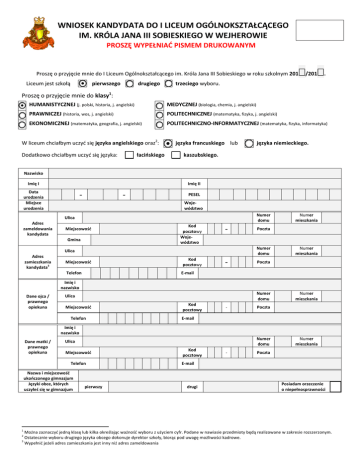 WNIOSEK KANDYDATA DO I LICEUM OGÓLNOKSZTAŁCĄCEGO IM. KRÓLA JANA III SOBIESKIEGO W WEJHEROWIE PROSZĘ WYPEŁNIAĆ PISMEM DRUKOWANYM Proszę o przyjęcie mnie do I Liceum Ogólnokształcącego im. Króla Jana III Sobieskiego w roku szkolnym 201 /201. Liceum jest szkołą pierwszego drugiego trzeciego wyboru. Proszę o przyjęcie mnie do klasy1: HUMANISTYCZNEJ (j. polski, historia, j. angielski) MEDYCZNEJ (biologia, chemia, j. angielski) PRAWNICZEJ (historia, wos, j. angielski) POLITECHNICZNEJ (matematyka, fizyka, j. angielski) EKONOMICZNEJ (matematyka, geografia, j. angielski) POLITECHNICZNO‐INFORMATYCZNEJ (matematyka, fizyka, informatyka) W liceum chciałbym uczyć się języka angielskiego oraz2: języka francuskiego lub Dodatkowo chciałbym uczyć się języka: łacińskiego języka niemieckiego. kaszubskiego. Nazwisko Imię I Data urodzenia Miejsce urodzenia ‐ Imię II ‐ Numer domu Kod pocztowy Woje‐ wództwo Miejscowość ‐ ‐ Numer mieszkania E‐mail Numer mieszkania Poczta Imię i nazwisko Numer domu Ulica Miejscowość Telefon Kod pocztowy ‐ E‐mail Poczta Numer mieszkania Imię i nazwisko Numer domu Ulica Miejscowość Telefon Nazwa i miejscowość ukończonego gimnazjum Języki obce, których uczyłeś się w gimnazjum Kod pocztowy Numer domu Miejscowość Telefon Poczta Ulica Dane matki / prawnego opiekuna Gmina Dane ojca / prawnego opiekuna Ulica Adres zamieszkania 3 kandydata PESEL Woje‐ wództwo Adres zameldowania kandydata Kod pocztowy ‐ E‐mail Poczta Numer mieszkania pierwszy drugi Posiadam orzeczenie o niepełnosprawności 1 Można zaznaczyć jedną klasę lub kilka określając ważność wyboru z użyciem cyfr. Podane w nawiasie przedmioty będą realizowane w zakresie rozszerzonym. Ostatecznie wyboru drugiego języka obcego dokonuje dyrektor szkoły, biorąc pod uwagę możliwości kadrowe. Wypełnić jeżeli adres zamieszkania jest inny niż adres zameldowania 2 3 Na podstawie ustawy z dnia 7 września 1991 roku o systemie oświaty (Dz. U. z 1991 r nr 95 poz. 425 ze zm.) oraz aktami wykonawczymi do tej ustawy obowiązkowo podaję powyższe dane osobowe dziecka oraz jego rodziców/ prawnych opiekunów. Na podstawie art. 24 ustawy o ochronie danych osobowych z dnia 29 sierpnia 1997 roku (tekst jednolity: Dz. U. z 2002 r nr 101, poz. 926) przyjmuję o wiadomości, że : ‐ Administratorem Danych Osobowych jest Zespół Szkół Ponadgimnazjalnych nr 1 w Wejherowie z siedzibą w Wejherowie, przy ul. Bukowej 1, ‐ dane zawarte we wniosku będą przetwarzane wyłącznie w zakresie niezbędnym do prawidłowego wykonywania obowiązków szkoły w związku z realizowaniem przez nią celów statutowych jako placówki edukacyjnej, ‐ dane będą udostępnione wyłącznie upoważnionym pracownikom Administratora Danych, ‐ przysługuje mi prawo dostępu do treści moich danych osobowych oraz członków mojej rodziny, ich uaktualniania lub poprawiania. Jednocześnie wyrażam zgodę na rejestrowanie wizerunku mojego dziecka/podopiecznego podczas zajęć, konkursów i uroczystości organizowanych przez Szkołę – ZSP nr 1 w Wejherowie i wykorzystywanie tego wizerunku poprzez zamieszczenie zdjęć na stronie internetowej szkoły, portalach społecznościowych w ramach stron szkoły, w kronice szkolnej oraz tablicach ściennych i folderach, użycie w formach audiowizualnych i multimedialnych w celu prowadzenia wszelkich działań dydaktycznych, wychowawczych, informacyjnych i promocyjnych Szkoły. Oświadczam/y, że podane w niniejszym wniosku dane osobowe są zgodne ze stanem faktycznym i jestem/śmy świadom(a)/i odpowiedzialności karnej za składanie niewłaściwych danych lub zatajenie prawdy. Zobowiązujemy się do informowania Dyrektora Szkoły o każdorazowej zmianie powyższych danych. Wejherowo, dnia ____________________ Podpis kandydata Podpis ojca/opiekuna prawnego Podpis matki/opiekuna prawnego