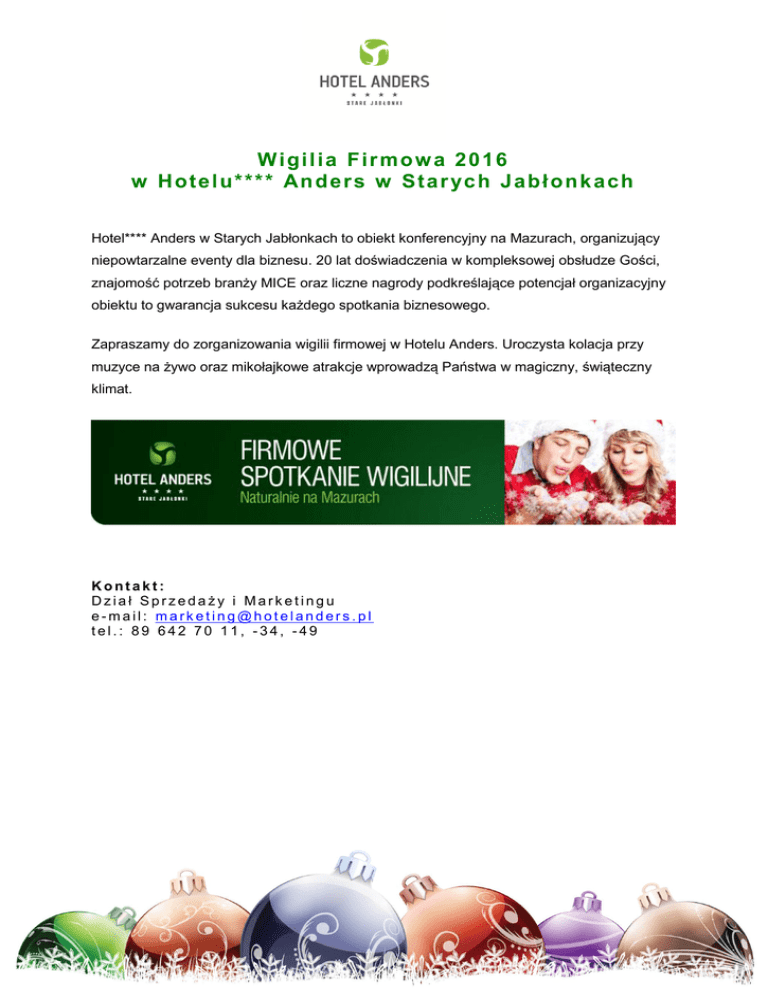 Wigilia Firmowa 2016 w H o t e l u * * * * An d e r s w S t a r yc h J a b ł o n k a c h Hotel**** Anders w Starych Jabłonkach to obiekt konferencyjny na Mazurach, organizujący niepowtarzalne eventy dla biznesu. 20 lat doświadczenia w kompleksowej obsłudze Gości, znajomość potrzeb branży MICE oraz liczne nagrody podkreślające potencjał organizacyjny obiektu to gwarancja sukcesu każdego spotkania biznesowego. Zapraszamy do zorganizowania wigilii firmowej w Hotelu Anders. Uroczysta kolacja przy muzyce na żywo oraz mikołajkowe atrakcje wprowadzą Państwa w magiczny, świąteczny klimat. Kontakt: Dział Sprzedaży i Marketingu e-mail: [email protected] tel.: 89 642 70 11, -34, -49 MENU KOL ACJI WIGILIJNEJ Do każdego menu proponujemy opłatek, w miarę życzenia Gości. Propozycja I Cena: 95 zł Propozycja II Cena: 95 zł Przypalany łosoś na sałatce z czarnej soczewicy z orzechami laskowymi i musem chrzanowym z jabłkiem Pieczywo regionalne, masło wiejskie Bałtycki śledź na sałatce z zielonego groszku i kwaśnych jabłek z pieczoną pietruszką Pieczywo razowe, masło wiejskie Zupa krem z pieczonego buraka z gruszką i malinami Czysty barszcz wigilijny z pierożkami borowikowymi Polędwica z karpia, sos z razowego chleba i purée z bobu z glazurowaną na miodzie marchewką Dorsz z pieczonym kalafiorem, sałatka z ziemniaków w kwaśnej śmietanie, sos z duszonych szalotek w białym winie Róża z jabłek warmińskich z Glotowa Strudel makowy z sosem waniliowym Propozycja III Cena: 105 zł Propozycja IV Cena: 115 zł Gołąbek z gęsiną w sosie z grzybów leśnych Sałatka z wędzonego pstrąga z sałatką z cieciorki, dyni i papryki z olejem Św. Wawrzyńca i musem z pieczonych jabłek Pieczywo regionalne, masło wiejskie z pieprzem Domowa zupa grzybowa z borowika z orzechami i kozim serem Sorbet z pieczonych antonówek w aromatycznym syropie z żubrówką Pierożek z borowika i kapusty kiszonej na mocnym grzybowym demi-glace Policzki wieprzowe długo duszone na kapustce z sosem podpiwkowym, domowe kluski ziołowe Krem z topinamburu z pieczoną pietruszką Placek śliwkowy z lodami gryczanymi Mazurski sandacz na purpurowej kaszy pęczak z pieczonym burakiem, sos z kiszonej kapusty i śliwek Sękacz z Podlasia z sosem miodowym Propozycja V Cena: 145 zł Śledź Matjas w oleju Św. Wawrzyńca z cebulką, kwaśną śmietaną i gotowanymi ziemniakami Pieczywo regionalne, masło wiejskie Bufet zimnych przekąsek Pasztet z dzika z marynowanymi prawdziwkami i konfiturą z czarnej porzeczki z kardamonem Wędzonki z tradycyjnej warmińskiej wędzarni (kumpiak, karczek, schab, szynka) Wędzone ryby – metodą tradycyjną (sieja, sielawa, pstrąg, dziki łosoś bałtycki) Śledzie na kilka sposobów Sery zagrodowe z marynatami (Praslicki, Koryciński, z Mierek, z Kieźlin) Marynaty z domowej spiżarni Sałatka z czarnej soczewicy z orzechami Sałatka jarzynowa tradycyjna Sałatka śledziowa Bufet dań gorących Smażona polędwica z karpia z pieczonym ziemniakiem i borowikami ze szpinakiem Pierś kurczaka supreme z pomidorem suszonym i ziołami z sosem z pieczonej papryki Warzywa polskie w emulsji maślanej Kopytka gryczane obsmażane na maśle Pierogi z kapustą i grzybami Pierogi z kaczki i kaszy jęczmiennej Pierogi z ziemniaków i białego sera Pierogi z kaszy gryczanej z dzikiem Żurek na serwatce Barszcz z buraków na zakwasie z grzybami Bufet słodki Mini-deserki czekoladowe Wybór ciast świątecznych Kompozycje owoców filetowanych