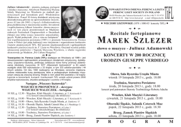 Juliusz Adamowski - pianista, pedagog, prelegent i działacz muzyczny. Absolwent Państwowej Wyższej Szkoły Muzycznej we Wrocławiu po studiach pianistycznych pod kierunkiem prof. Włodzimierza Obidowicza. Ponad 50-letnią działalność artystyczną ukierunkowaną głównie na upowszechnienie muzyki, przez 42 lata (do 2002 r.) łączył z kilkukierunkową pracą dydaktyczną w macierzystej uczelni. Jest autorem i współwykonawcą kilkuset koncertów słowno-muzycznych (w tym pięciu prezentowanych na Międzynarodowych Festiwalach Chopinowskich w Dusznikach Zdroju) oraz kilku tysięcy koncertów umuzykalniających. Wydał podręcznik „Gra a vista na fortepianie”. Jest współinicjatorem powstania (1989 r.) i prezesem Towarzystwa im. Ferenca Liszta w Polsce (już piątą kadencję) oraz inicjatorem i organizatorem konkursów i kursów pianistycznych TiFL. Był jurorem międzynarodowych i ogólnopolskich konkursów pianistycznych im. F. Liszta we Wrocławiu. Otrzymał wysokie polskie odznaczenia państwowe i Nagrodę Muzyczną Wrocławia , a władze węgierskie uhonorowały go Medalem „Pro Cultura Hungarica”. l TOWARZYSTWO IMIENIA FERENCA LISZTA FERENC LISZT SOCIETY IN POLAND 50-028 Wrocław, plac Tadeusza Kościuszki 9, tel./fax (+48) 71 351 9735 tel. 600 39 36 34 TiFL MAREK SZLEZER l Recitale fortepianowe słowo o muzyce - Juliusz Adamowski KONCERTY W 200 ROCZNICĘ URODZIN GIUSEPPE VERDIEGO l Oława, Sala Rycerska Urzędu Miasta wtorek 19 listopada 2013 r., godz. 18.00 Trzebnica, Starostwo Powiatowe środa, 20 listopada 2013 r., godz. 18.00 Następne „Wieczory lisztowskie”: WOJCIECH PRONIEWICZ - skrzypce WOJCIECH WALECZEK - fortepian koncert pod patronatem Starosty Trzebnickiego Roberta Adacha 10 XII, g. 12.30 - Wrocław, Klub Muzyki i Literatury, pl. T. Kościuszki 9 Wrocław, Klub Muzyki i Literatury czwartek, 21 listopada 2013 r., godz. 18.00 (152 koncert umuzykalniający dla młodzieży) 10 XII, g. 18.00 - Wrocław, Klub Muzyki i Literatury, pl. T. Kościuszki 9. 11 XII, g. 18.00 - Oława, Sala Rycerska Urzędu Miasta, pl. Zamkowy 15 12 XII, g. 18.30 - Oborniki Śląskie, Salonik Czterech Muz, ul. J. Piłsudskiego 13. 13 XII, g. 12.30 - Trzebnica, Starostwo Powiatowe, ul Leśna 1 Oborniki Śląskie, Salonik Czterech Muz piątek, 22 listopada 2013 r., godz. 18.30 (153 koncert umuzykalniający dla młodzieży) Redakcja i skład programu – Juliusz Adamowski Naświetlanie płyt CTP - www.studioten.pl Druk – DRUKARNIA „DUET” Wrocław, ul. Cybulskiego 35b tel. 71 328 78 79, e-mail [email protected] e-mail [email protected] WIECZORY LISZTOWSKIE (1078 i 1080-83 koncerty TiFL) Towarzystwo im. Ferenca Liszta (TiFL) działające we Wrocławiu od 1989 r. jest stowarzyszeniem ogólnopolskim prowadzącym działalność artystyczną, dydaktyczną i popularno-naukową, preferując zwłaszcza różne formy promocji utalentowanej młodzieży muzycznej. W 1077 „Wieczorach lisztowskich” w 83 salach wystąpiło około 600 wykonawców z 33 krajów, w tym 333 solistów-pianistów i 44 innych solistów. Od roku 1993 realizujemy we Wrocławiu corocznie międzynarodowe mistrzowskie kursy pianistyczne, które w profesjonalnym środowisku muzycznym cieszą się znaczną renomą. Wzięło w nich udział 542 pianistów z 32 krajów. Łącznie w koncertach, kursach i konkursach TiFL wzięło udział prawie 2500 artystów-wykonawców, artystów-pedagogów i uczniów z 44 krajów. 14 XII, g. 18.00 - Trzebnica, Starostwo Powiatowe, ul Leśna 1 14 XII, g. 18.00 - Brzeg, Zamek Piastów Śląskich, plac Zamkowy 1 http://www.liszt.art.pl P Brzeg, Zamek Piastów Śląskich sobota, 23 listopada 2013 r., godz. 18.00 R O G R A M t P r o g r a FERENC LISZT (1811-1886) Transkrypcje fragmentów oper G. Verdiego: m Parafraza koncertowa na tematy z opery „Ernani Reminiscencje z opery „Simone Boccanegra” Parafraza koncertowa „Rigoletto” przerwa SERGIEJ RACHMANINOW (1873-1943) Preludium cis-moll op. 3 nr 2 Preludium h-moll op. 32 nr 10 II Sonata fortepianowa b-moll op. 36 (wersja z 1913 r.) Allegro agitato Non allegro. Lento Allegro molto l Koncerty są realizowane przy pomocy finansowej Władz Samorządowych Województw Dolnośląskiego i Opolskiego, Starostwa Powiatowego w Trzebnicy, Gmin Brzeg, Oborniki Śląskie, Wrocław, Ośrodka Kultury w Oławie, Związku Artystów Wykonawców STOART, Brzeskiego Przedsiębiorstwa Energetyki Cieplnej, Przedsiębiorstwa Wodociągów i Kanalizacji w Brzegu. l Marek Szlezer (ur. 1981) jest jednym z najczęściej koncertujących polskich pianistów młodego pokolenia. Jego karierę zainicjowało zdobycie w wieku lat 12 Grand Prix na Międzynarodowym Konkursie Pianistycznym w Rzymie. Kształcił się w École Normale de Musique w Paryżu, Akademii Muzycznej w Krakowie oraz Chapelle Musicale Reine Elisabeth w Belgii pod kierunkiem m.in. prof. Ewy Bukojemskiej, Abdela Rahmana El Bacha, Dymitra Bashkirova oraz Marcelli Crudeli. Jest stypendystą Ministra Kultury i Dziedzictwa Narodowego, fundacji polskich i zagranicznych, a także Miasta Krakowa. Marek Szlezer jest laureatem wielu znaczących konkursów krajowych i międzynarodowych. Ceniony za swoje interpretacje dzieł Fryderyka Chopina otrzymał m.in I miejsce w konkursie stypendialnym Towarzystwa im. F. Chopina w Warszawie, III miejsce na Międzynarodowym Konkursie chopinowskim w Mariańskich Łaźniach, nagrodę specjalną Wydania Narodowego Dzieł Wszystkich Fryderyka Chopina a także wiele innych nagród na renomowanych międzynarodowych konkursach pianistycznych. Jego recital otwierał 56. festiwal chopinowski w Dusznikach Zdroju. Miał także zaszczyt wykonywać recital na oryginalnym fortepianie Chopina w muzeum Collegium Maius Uniwersytetu Jagiellońskiego w noc wejścia Polski do Unii Europejskiej w 2004 r. Koncertował w wielu wysoko renomowanych w Polsce i zagranicą. Nagrywał dla Radia i Telewizji wielu krajów europejskich. Jest aktywnie zaangażowany w promocję muzyki polskiej w kraju i zagrani
