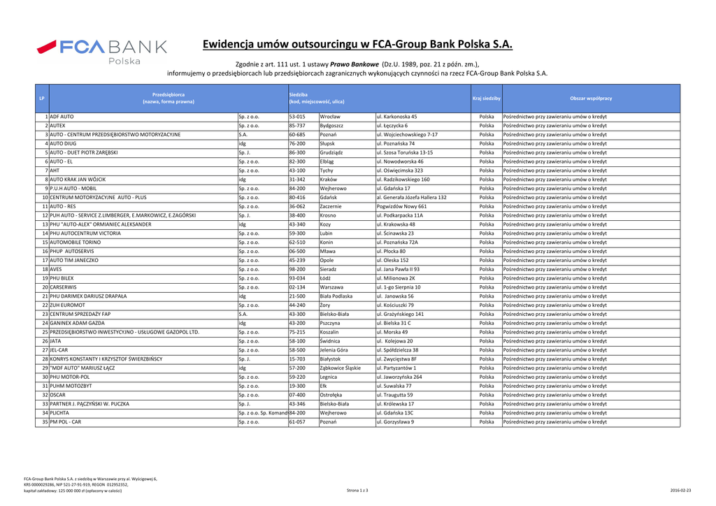 Ewidencja umów outsourcingu w FCA-Group Bank Polska S.A. Zgodnie z art. 111 ust. 1 ustawy Prawo Bankowe (Dz.U. 1989, poz. 21 z późn. zm.), informujemy o przedsiębiorcach lub przedsiębiorcach zagranicznych wykonujących czynności na rzecz FCA-Group Bank Polska S.A. Przedsiębiorca (nazwa, forma prawna) LP Siedziba (kod, miejscowość, ulica) Kraj siedziby Obszar współpracy 1 ADF AUTO Sp. z o.o. 53-015 Wrocław ul. Karkonoska 45 Polska Pośrednictwo przy zawieraniu umów o kredyt 2 AUTEX Sp. z o.o. 85-737 Bydgoszcz ul. Łęczycka 6 Polska Pośrednictwo przy zawieraniu umów o kredyt Pośrednictwo przy zawieraniu umów o kredyt 3 AUTO - CENTRUM PRZEDSIĘBIORSTWO MOTORYZACYJNE S.A. 60-685 Poznań ul. Wojciechowskiego 7-17 Polska 4 AUTO DIUG idg 76-200 Słupsk ul. Poznańska 74 Polska Pośrednictwo przy zawieraniu umów o kredyt 5 AUTO - DUET PIOTR ZARĘBSKI Sp. J. 86-300 Grudziądz ul. Szosa Toruńska 13-15 Polska Pośrednictwo przy zawieraniu umów o kredyt 6 AUTO - EL Sp. z o.o. 82-300 Elbląg ul. Nowodworska 46 Polska Pośrednictwo przy zawieraniu umów o kredyt 7 AHT Sp. z o.o. 43-100 Tychy ul. Oświęcimska 323 Polska Pośrednictwo przy zawieraniu umów o kredyt 8 AUTO KRAK JAN WÓJCIK idg 31-342 Kraków ul. Radzikowskiego 160 Polska Pośrednictwo przy zawieraniu umów o kredyt 9 P.U.H AUTO - MOBIL Sp. z o.o. 84-200 Wejherowo ul. Gdańska 17 Polska Pośrednictwo przy zawieraniu umów o kredyt 10 CENTRUM MOTORYZACYJNE AUTO - PLUS Sp. z o.o. 80-416 Gdańsk al. Generała Józefa Hallera 132 Polska Pośrednictwo przy zawieraniu umów o kredyt 11 AUTO - RES Sp. z o.o. 36-062 Zaczernie Pogwizdów Nowy 661 Polska Pośrednictwo przy zawieraniu umów o kredyt 12 PUH AUTO - SERVICE Z.LIMBERGER, E.MARKOWICZ, E.ZAGÓRSKI Sp. J. 38-400 Krosno ul. Podkarpacka 11A Polska Pośrednictwo przy zawieraniu umów o kredyt 13 PHU "AUTO-ALEX" ORMIANIEC ALEKSANDER idg 43-340 Kozy ul. Krakowska 48 Polska Pośrednictwo przy zawieraniu umów o kredyt 14 PHU AUTOCENTRUM VICTORIA Sp. z o.o. 59-300 Lubin ul. Ścinawska 23 Polska Pośrednictwo przy zawieraniu umów o kredyt 15 AUTOMOBILE TORINO Sp. z o.o. 62-510 Konin ul. Poznańska 72A Polska Pośrednictwo przy zawieraniu umów o kredyt 16 PHUP AUTOSERVIS Sp. z o.o. 06-500 Mława ul. Płocka 80 Polska Pośrednictwo przy zawieraniu umów o kredyt 17 AUTO TIM JANECZKO Sp. z o.o. 45-239 Opole ul. Oleska 152 Polska Pośrednictwo przy zawieraniu umów o kredyt 18 AVES Sp. z o.o. 98-200 Sieradz ul. Jana Pawła II 93 Polska Pośrednictwo przy zawieraniu umów o kredyt 19 PHU BILEX Sp. z o.o. 93-034 Łódź ul. Milionowa 2K Polska Pośrednictwo przy zawieraniu umów o kredyt 20 CARSERWIS Sp. z o.o. 02-134 Warszawa ul. 1-go Sierpnia 10 Polska Pośrednictwo przy zawieraniu umów o kredyt 21 PHU DARIMEX DARIUSZ DRAPAŁA idg 21-500 Biała Podlaska ul. Janowska 56 Polska Pośrednictwo przy zawieraniu umów o kredyt 22 ZUH EUROMOT Sp. z o.o. 44-240 Żory ul. Kościuszki 79 Polska Pośrednictwo przy zawieraniu umów o kredyt 23 CENTRUM SPRZEDAŻY FAP S.A. 43-300 Bielsko-Biała ul. Grażyńskiego 141 Polska Pośrednictwo przy zawieraniu umów o kredyt 24 GANINEX ADAM GAZDA idg 43-200 Pszczyna ul. Bielska 31 C Polska Pośrednictwo przy zawieraniu umów o kredyt 25 PRZEDSIĘBIORSTWO INWESTYCYJNO - USŁUGOWE GAZOPOL LTD. Sp. z o.o. 75-215 Koszalin ul. Morska 49 Polska Pośrednictwo przy zawieraniu umów o kredyt 26 JATA Sp. z o.o. 58-100 Świdnica ul. Kolejowa 20 Polska Pośrednictwo przy zawieraniu umów o kredyt 27 JEL-CAR Sp. z o.o. 58-500 Jelenia Góra ul. Spółdzielcza 38 Polska Pośrednictwo przy zawieraniu umów o kredyt 28 KONRYS KONSTANTY I KRZYSZTOF ŚWIERZBIŃSCY Sp. J. 15-703 Białystok ul. Zwycięstwa 8F Polska Pośrednictwo przy zawieraniu umów o kredyt 29 "MDF AUTO" MARIUSZ ŁĄCZ idg 57-200 Ząbkowice Śląskie ul. Partyzantów 1 Polska Pośrednictwo przy zawieraniu umów o kredyt 30 PHU MOTOR-POL Sp. z o.o. 59-220 Legnica ul. Jaworzyńska 264 Polska Pośrednictwo przy zawieraniu umów o kredyt 31 PUHM MOTOZBYT Sp. z o.o. 19-300 Ełk ul. Suwalska 77 Polska Pośrednictwo przy zawieraniu umów o kredyt 32 OSCAR Sp. z o.o. 07-400 Ostrołęka ul. Traugutta 59 Polska Pośrednictwo przy zawieraniu umów o kredyt 33 PARTNER J. PĄCZYŃSKI W. PUCZKA Sp. J. 43-346 Bielsko-Biała ul. Królewska 17 Polska Pośrednictwo przy zawieraniu umów o kredyt 34 PLICHTA Sp. z o.o. Sp. Komandytowa 84-200 Wejherowo ul. Gdańska 13C Polska Pośrednictwo przy zawieraniu umów o kredyt 35 PM POL - CAR Sp. z o.o. Poznań ul. Gorzysława 9 Polska Pośrednictwo przy zawieraniu umów o kredyt FCA-Group Bank Polska S.A. z siedzibą w Warszawie przy al. Wyścigowej 6, KRS 0000029286, NIP 521-27-91-919, REGON 012952352, kapitał zakładowy: 125 000 000 zł (opłacony w calości) 61-057 Strona 1 z 3 2016-02-23 Ewidencja umów outsourcingu w FCA-Group Bank Polska S.A. Zgodnie z art. 111 ust. 1 ustawy Prawo Bankowe (Dz.U. 1989, poz. 21 z późn. zm.), informujemy o przedsiębiorcach lub przedsiębiorcach zagranicznych wykonujących czynności na rzecz FCA-Group Bank Polska S.A. LP Przedsiębiorca (nazwa, forma prawna) Siedziba (kod, miejscowość, ulica) Kraj siedziby Obszar współpracy 36 POLMOZBYT PLUS Sp. z o.o. 15-703 Białystok ul. Zwycięstwa 10A Polska Pośrednictwo przy zawieraniu umów o kredyt 37 POLSKA GRUPA DEALERÓW Sp. komandytowa 30-403 Kraków ul. Rzemieślnicza 26 Polska Pośrednictwo przy zawieraniu umów o kredyt 38 POLSKI ZWIĄZEK MOTOROWY O.Z.D.G. Sp. z o.o. 20-064 Lublin ul. B. Prusa 8 Polska Pośrednictwo przy zawieraniu umów o kredyt 39 PRIMA AUTO Sp. z o.o. 32-200 Miechów ul. Racławicka 26 Polska Pośrednictwo przy zawieraniu umów o kredyt 40 RESMA Sp. z o.o. 10-092 Olsztyn ul. Obrońców Tobruku 5 Polska Pośrednictwo przy zawieraniu umów o kredyt 41 ROMAR Sp. z o.o. 26-600 Radom ul. Wojska Polskiego 6/10 Polska Pośrednictwo przy zawieraniu umów o kredyt 42 SZCZĘSNY - ZJAWIONY Sp. z o.o. 42-400 Zawiercie ul. Wojska Polskiego 48a Polska Pośrednictwo przy zawier
