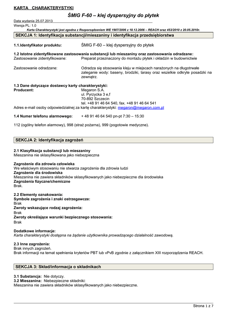 KARTA CHARAKTERYSTYKI ŚMIG F-60 – klej dyspersyjny do płytek Data wydania 25.07.2013 Wersja PL: 1.0 Karta Charakterystyki jest zgodna z Rozporządzeniem WE 1907/2006 z 18.12.2006 – REACH oraz 453/2010 z 20.05.2010r. SEKCJA 1: Identyfikacja substancji/mieszaniny i identyfikacja przedsiębiorstwa 1.1.Identyfikator produktu: ŚMIG F-60 – klej dyspersyjny do płytek 1.2 Istotne zidentyfikowane zastosowania substancji lub mieszaniny oraz zastosowania odradzane: Zastosowanie zidentyfikowane: Preparat przeznaczony do montażu płytek i okładzin w budownictwie Zastosowanie odradzane: Odradza się stosowania kleju w miejscach narażonych na długotrwałe zaleganie wody: baseny, brodziki, tarasy oraz wszelkie odkryte posadzki na zewnątrz. 1.3 Dane dotyczące dostawcy karty charakterystyki: Producent: Megaron S.A. ul. Pyrzycka 3 e,f 70-892 Szczecin tel. +48 91 46 64 540, fax. +48 91 46 64 541 Adres e-mail osoby odpowiedzialnej za kartę charakterystyki: [email protected] 1.4 Numer telefonu alarmowego: + 48 91 46 64 540 pn-pt 7:30 – 15:30 112 (ogólny telefon alarmowy), 998 (straż pożarna), 999 (pogotowie medyczne). SEKCJA 2: Identyfikacja zagrożeń 2.1 Klasyfikacja substancji lub mieszaniny Mieszanina nie sklasyfikowana jako niebezpieczna Zagrożenie dla zdrowia człowieka We właściwym stosowaniu nie stwarza zagrożenia dla zdrowia ludzi Zagrożenie dla środowiska Mieszanina nie zawiera składników sklasyfikowanych jako niebezpieczne dla środowiska Zagrożenia fizyczne/chemiczne Brak. 2.2 Elementy oznakowania: Symbole zagrożenia i znaki ostrzegawcze: Brak Zwroty wskazujące rodzaj zagrożenia: Brak Zwroty określające warunki bezpiecznego stosowania: Brak Dodatkowe informacje: Karta charakterystyki dostępna na żądanie użytkownika prowadzącego działalność zawodową. 2.3 Inne zagrożenia: Brak innych zagrożeń. Brak informacji na temat spełnienia kryteriów PBT lub vPvB zgodnie z załącznikiem XIII rozporządzenia REACH. SEKCJA 3: Skład/informacja o składnikach 3.1 Substancja: Nie dotyczy. 3.2 Mieszanina: Niebezpieczne składniki: Mieszanina nie zawiera składników sklasyfikowanych jako niebezpieczne. Strona 1 z 7 KARTA CHARAKTERYSTYKI ŚMIG F-60 – klej dyspersyjny do płytek Data wydania 25.07.2013 Wersja PL: 1.0 Karta Charakterystyki jest zgodna z Rozporządzeniem WE 1907/2006 z 18.12.2006 – REACH oraz 453/2010 z 20.05.2010r. SEKCJA 4: Środki pierwszej pomocy 4.1 Opis środków pierwszej pomocy W przypadku kontaktu ze skórą: Umyć zabrudzoną skórę wodą z mydłem, spłukać dokładnie wodą, w przypadku pojawienia się podrażnienia, rumieni skontaktować się z lekarzem. W przypadku kontaktu z oczami: Przepłukać oczy przez kilkanaście minut (ok. 15) dużą ilością wody, trzymając powieki szeroko rozwarte. Unikać silnego strumienia, ze względu na niebezpieczeństwo uszkodzenia rogówki, w przypadku wystąpienia nieprzemijających dolegliwości skontaktować się z lekarzem. Narażenie inhalacyjne: W razie zawrotów głowy lub nudności wyprowadzić poszkodowanego na świeże powietrze, w razie braku szybkiej poprawy zasięgnąć porady lekarza. W przypadku połknięcia: W przypadku spożycia nie wywoływać wymiotów, wypłukać usta dużą ilością wody, skonsultować się z lekarzem. Nigdy nie podawać niczego doustnie osobie nieprzytomnej. 4.2 Najważniejsze ostre i opóźnione objawy oraz skutki narażenia: Brak dostępnych informacji. 4.3 Wskazania dotyczące wszelkiej natychmiastowej pomocy lekarskiej i szczególnego postępowania z poszkodowanym: Decyzję o sposobie postępowania podejmuje lekarz po ocenie stanu poszkodowanego. SEKCJA 5: Postępowanie w przypadku pożaru 5.1 Środki gaśnicze: Odpowiednie środki gaśnicze: piana alkoholoodporna lub suche proszki gaśnicze (A,B,C), dwutlenek węgla (gaśnica śniegowa), piasek lub ziemia, mgła wodna. Stosować metody gaśnicze odpowiednie do warunków otoczenia. 5.2 Szczególne zagrożenia związane z substancją lub mieszaniną: brak. 5.3 Informacje dla straży pożarnej: Pojemniki znajdujące się w strefie pożaru chłodzić rozproszonym strumieniem wody, o ile jest to możliwe usunąć ze strefy zagrożenia. W przypadku pożaru w zamkniętym pomieszczeniu należy stosować odzież ochronną i aparat oddechowy na sprężone powietrze . Nie dopuszczać do przedostania się wody gaśniczej do wód powierzchniowych, gruntowych i kanalizacji. SEKCJA 6: Postępowanie w przypadku niezamierzonego uwolnienia do środowiska 6.1 Indywidualne środki ostrożności, wyposażenie ochronne i procedury w sytuacjach awaryjnych Dla osób nienależących do personelu udzielającego pomocy: zawiadomić o awarii odpowiednie służby. Usunąć z obszaru zagrożenia osoby niebiorące udziału w likwidacji awarii. Dla osób udzielających pomocy: Zadbać o odpowiednią wentylację, stosować rękawice ochronne, stosować środki ochrony indywidualnej. 6.2 Środki ostrożności w zakresie ochrony środowiska: Zapobiegać rozprzestrzenianiu się oraz przedostaniu do kanalizacji i zbiorników wodnych, poinformować władze lokalne w przypadku niemożności zapewnienia ochrony. 6.3 Metody i materiały zapobiegające rozprzestrzenianiu się skażenia i służące do usuwania skażenia: Zapobiegać rozprzestrzenianiu się i usuwać poprzez zebranie mechaniczne lub na niepalnym materiale absorpcyjnym (piasek, trociny, ziemia okrzemkowa, absorbent uniwersalny), zanieczyszczony materiał umieścić w odpowiednio oznakowanych pojemnikach w celu utylizacji zgodnie z obowiązującymi przepisami. Strona 2 z 7 KARTA CHARAKTERYSTYKI ŚMIG F-60 – klej dyspersyjny do płytek Data wydania 25.07.2013 Wersja PL: 1.0 Karta Charakterystyki jest zgodna z Rozporządzeniem WE 1907/2006 z 18.12.2006 – REACH oraz 453/2010 z 20.05.2010r. 6.4 Odniesienia do innych sekcji Postępowanie z odpadami produktu – patrz sekcja 13 karty. Środki ochrony indywidualnej – patrz sekcja 8 karty. SEKCJA 7: Postępowanie z substancjami i mies
