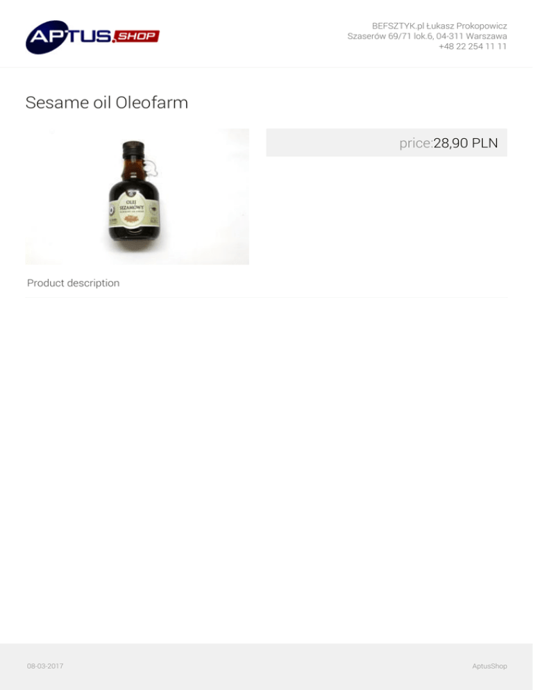 BEFSZTYK.pl Łukasz Prokopowicz Szaserów 69/71 lok.6, 04-311 Warszawa +48 22 254 11 11 Sesame oil Oleofarm price:28,90 PLN Product description 08-03-2017 Powered by TCPDF (www.tcpdf.org) AptusShop