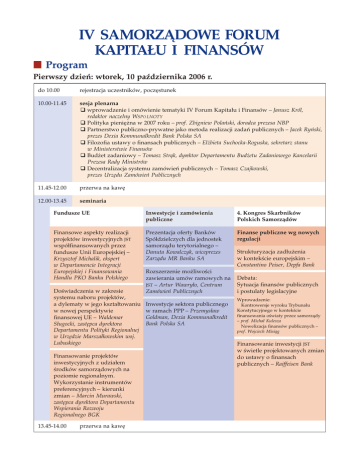 IV SAMORZ¥DOWE FORUM KAPITA£U I FINANSÓW Program Pierwszy dzieñ: wtorek, 10 paŸdziernika 2006 r. do 10.00 rejestracja uczestników, poczêstunek 10.00-11.45 sesja plenarna q wprowadzenie i omówienie tematyki IV Forum Kapita³u i Finansów – Janusz Król, redaktor naczelny WSPÓ LNOTY q Polityka pieniê¿na w 2007 roku – prof. Zbigniew Polañski, doradca prezesa NBP q Partnerstwo publiczno-prywatne jako metoda realizacji zadañ publicznych – Jacek Ryñski, prezes Dexia Kommunalkredit Bank Polska SA q Filozofia ustawy o finansach publicznych – El¿bieta Suchocka-Roguska, sekretarz stanu w Ministerstwie Finansów q Bud¿et zadaniowy – Tomasz Str¹k, dyrektor Departamentu Bud¿etu Zadaniowego Kancelarii Prezesa Rady Ministrów q Decentralizacja systemu zamówieñ publicznych – Tomasz Czajkowski, prezes Urzêdu Zamówieñ Publicznych 11.45-12.00 przerwa na kawê 12.00-13.45 seminaria Fundusze UE Inwestycje i zamówienia publiczne 4. Kongres Skarbników Polskich Samorz¹dów Finansowe aspekty realizacji projektów inwestycyjnych JST wspó³finansowanych przez fundusze Unii Europejskiej – Krzysztof Michalik, ekspert w Departamencie Integracji Europejskiej i Finansowania Handlu PKO Banku Polskiego Prezentacja oferty Banków Spó³dzielczych dla jednostek samorz¹du terytorialnego – Danuta Kowalczyk, wiceprezes Zarz¹du MR Banku SA Finanse publiczne wg nowych regulacji Doœwiadczenia w zakresie systemu naboru projektów, a dylematy w jego kszta³towaniu w nowej perspektywie finansowej UE – Waldemar S³ugocki, zastêpca dyrektora Departamentu Polityki Regionalnej w Urzêdzie Marsza³kowskim woj. Lubuskiego Finansowanie projektów inwestycyjnych z udzia³em œrodków samorz¹dowych na poziomie regionalnym. Wykorzystanie instrumentów preferencyjnych – kierunki zmian – Marcin Murawski, zastêpca dyrektora Departamentu Wspierania Rozwoju Regionalnego BGK 13.45-14.00 przerwa na kawê Rozszerzenie mo¿liwoœci zawierania umów ramowych na JST – Artur Wawry³o, Centrum Zamówieñ Publicznych Inwestycje sektora publicznego w ramach PPP – Przemys³aw Goldman, Dexia Kommunalkredit Bank Polska SA Strukturyzacja zad³u¿enia w kontekœcie europejskim – Constantino Peiser, Depfa Bank Debata: Sytuacja finansów publicznych i postulaty legislacyjne Wprowadzenie: Kontrowersje wyroku Trybuna³u Konstytucyjnego w kontekœcie finansowania oœwiaty przez samorz¹dy – prof. Micha³ Kulesza Nowelizacja finansów publicznych – prof. Wojciech Misi¹g Finansowanie inwestycji JST w œwietle projektowanych zmian do ustawy o finansach publicznych – Raiffeisen Bank Program Pierwszy dzieñ: wtorek, 10 paŸdziernika 2006 r., ci¹g dalszy 14.00-14.45 seminaria Fundusze UE Inwestycje i zamówienia publiczne 4. Kongres Skarbników Polskich Samorz¹dów Zasady kwalifikowania wydatków z funduszy UE w okresie programowania 2007-2013 – Maciej Przybysz, DGA Nowoczesne sposoby dekorowania miast i gmin – Piotr Christop, prezes Energetyki Poznañskiej VAT w nieruchomoœciach – Miros³aw Barszcz, doradca kancelarii prawnej Baker & McKenzie Zmiany w procedurze Regionalne programy operacyjne protestacyjno-odwo³awczej – Rafa³ Zygmunt – g³ówne kierunki i obszary interwencji – Rados³aw Górecki, wnioski, rekomendacje Ministerstwo Rozwoju Regionalnego wnioski, rekomendacje wnioski, rekomendacje 14.45-15.45 przerwa na obiad 15.45-17.00 sesja plenarna q Finansowanie inwestycji samorz¹dowych w kontekœcie zadañ unijnych – Jerzy Witold Pietrewicz, prezes zarz¹du Banku Ochrony Œrodowiska SA q „e-Œwiêtokrzyskie” – wykorzystanie œrodków unijnych w budowie infrastruktury spo³eczeñstwa informacyjnego – doœwiadczenia, wnioski i rekomendacje – Maria Tr¹mpczyñska, Andrzej Maciej Skrzeczkowski, NASK q Priorytety i obszary wykorzystania funduszy unijnych w latach 2007-2013 w œwietle Narodowej Strategii Spójnoœci – Renata Calak, zastêpca dyrektora Departamentu Koordynacji Polityki Strukturalnej Ministerstwa Rozwoju Regionalnego 17.00-19.00 przerwa 19.00-20.30 Gala Inwestorów Samorz¹dowych q og³oszenie wyników Rankingu Inwestorów Samorz¹dowych Pisma Samorz¹du Terytorialnego WSPÓ LNOTA q wrêczenie statuetek Kazimierza Wielkiego wyró¿nionym samorz¹dom 20.30-22.30 recital Aloszy Awdiejewa bankiet Program Drugi dzieñ: œroda, 11 paŸdziernika 2006 r. 10.00-11.30 seminaria Fundusze UE Inwestycje i zamówienia publiczne 4. Kongres Skarbników Polskich Samorz¹dów Finansowanie projektów unijnych realizowanych przez samorz¹dy terytorialne – mo¿liwoœci i doœwiadczenia BOŒ SA z perspektywy 2004-2006 – Alicja Siemieniec, zastêpca dyrektora Banku Ochrony Œrodowiska SA Proces wydawania decyzji o œrodowiskowych uwarunkowaniach zgody na realizacjê przedsiêwziêcia – Artur Kawicki, Ministerstwo Œrodowiska Wybrane problemy zwi¹zane z realizacj¹ i rozliczaniem projektów unijnych – Tomasz Robaczyñski, Ministerstwo Finansów debata wnioski, rekomendacje debata wnioski, rekomendacje Monta¿ finansowy projektów unijnych – praktyczne doœwiadczenia z perspetywy 2004-2006 oraz rekomendacje i uwagi na kolejny okres programowania – Remigiusz Górniak debata wnioski, rekomendacje 11.30-12.00 przerwa na kawê 12.00-13.00 sesja plenarna q omówienie pracy i zaproszenie do odczytania przyjêtych rekomendacji w poszczególnych blokach seminaryjnych q wnioski i rekomendacje przyjête podczas: w trzech sesji seminaryjnych dotycz¹cych funduszy UE w trzech sesji 4. Kongresu Skarbników Polskich Samorz¹dów w dwóch bloków seminaryjnych dotycz¹cych zamówieñ publicznych oraz jednego bloku dotycz¹cego inwestycji 13.00-14.00 obiad ZAKOÑ CZENIE FORUM n
