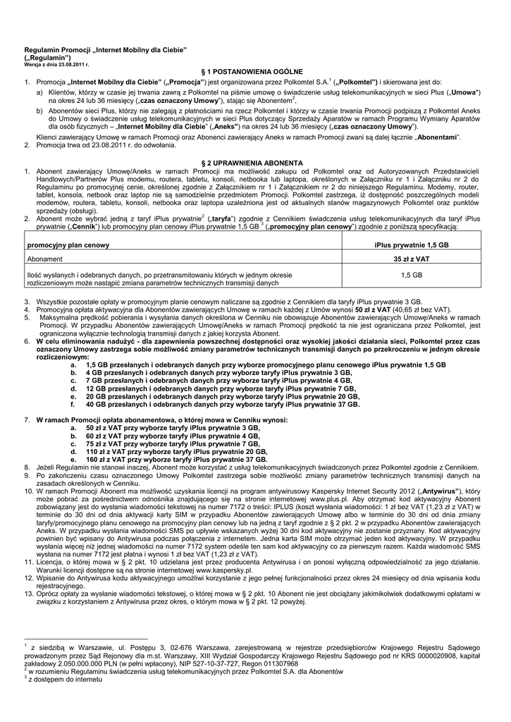 Regulamin Promocji „Internet Mobilny dla Ciebie” („Regulamin”) Wersja z dnia 23.08.2011 r. § 1 POSTANOWIENIA OGÓLNE 1. Promocja „Internet Mobilny dla Ciebie” („Promocja”) jest organizowana przez Polkomtel S.A.1 („Polkomtel”) i skierowana jest do: a) Klientów, którzy w czasie jej trwania zawrą z Polkomtel na piśmie umowę o świadczenie usług telekomunikacyjnych w sieci Plus („Umowa") na okres 24 lub 36 miesięcy („czas oznaczony Umowy”), stając się Abonentem2, b) Abonentów sieci Plus, którzy nie zalegają z płatnościami na rzecz Polkomtel i którzy w czasie trwania Promocji podpiszą z Polkomtel Aneks do Umowy o świadczenie usług telekomunikacyjnych w sieci Plus dotyczący Sprzedaży Aparatów w ramach Programu Wymiany Aparatów dla osób fizycznych – „Internet Mobilny dla Ciebie” („Aneks") na okres 24 lub 36 miesięcy („czas oznaczony Umowy”). Klienci zawierający Umowę w ramach Promocji oraz Abonenci zawierający Aneks w ramach Promocji zwani są dalej łącznie „Abonentami”. 2. Promocja trwa od 23.08.2011 r. do odwołania. § 2 UPRAWNIENIA ABONENTA 1. Abonent zawierający Umowę/Aneks w ramach Promocji ma możliwość zakupu od Polkomtel oraz od Autoryzowanych Przedstawicieli Handlowych/Partnerów Plus modemu, routera, tabletu, konsoli, netbooka lub laptopa, określonych w Załączniku nr 1 i Załączniku nr 2 do Regulaminu po promocyjnej cenie, określonej zgodnie z Załącznikiem nr 1 i Załącznikiem nr 2 do niniejszego Regulaminu. Modemy, router, tablet, konsola, netbook oraz laptop nie są samodzielnie przedmiotem Promocji. Polkomtel zastrzega, iż dostępność poszczególnych modeli modemów, routera, tabletu, konsoli, netbooka oraz laptopa uzależniona jest od aktualnych stanów magazynowych Polkomtel oraz punktów sprzedaży (obsługi). 2. Abonent może wybrać jedną z taryf iPlus prywatnie2 („taryfa”) zgodnie z Cennikiem świadczenia usług telekomunikacyjnych dla taryf iPlus prywatnie („Cennik”) lub promocyjny plan cenowy iPlus prywatnie 1,5 GB 3 („promocyjny plan cenowy”) zgodnie z poniższą specyfikacją: promocyjny plan cenowy Abonament Ilość wysłanych i odebranych danych, po przetransmitowaniu których w jednym okresie rozliczeniowym może nastąpić zmiana parametrów technicznych transmisji danych iPlus prywatnie 1,5 GB 35 zł z VAT 1,5 GB 3. Wszystkie pozostałe opłaty w promocyjnym planie cenowym naliczane są zgodnie z Cennikiem dla taryfy iPlus prywatnie 3 GB. 4. Promocyjna opłata aktywacyjna dla Abonentów zawierających Umowę w ramach każdej z Umów wynosi 50 zł z VAT (40,65 zł bez VAT). 5. Maksymalna prędkość pobierania i wysyłania danych określona w Cenniku nie obowiązuje Abonentów zawierających Umowę/Aneks w ramach Promocji. W przypadku Abonentów zawierających Umowę/Aneks w ramach Promocji prędkość ta nie jest ograniczana przez Polkomtel, jest ograniczona wyłącznie technologią transmisji danych z jakiej korzysta Abonent. 6. W celu eliminowania nadużyć - dla zapewnienia powszechnej dostępności oraz wysokiej jakości działania sieci, Polkomtel przez czas oznaczony Umowy zastrzega sobie możliwość zmiany parametrów technicznych transmisji danych po przekroczeniu w jednym okresie rozliczeniowym: a. 1,5 GB przesłanych i odebranych danych przy wyborze promocyjnego planu cenowego iPlus prywatnie 1,5 GB b. 4 GB przesłanych i odebranych danych przy wyborze taryfy iPlus prywatnie 3 GB, c. 7 GB przesłanych i odebranych danych przy wyborze taryfy iPlus prywatnie 4 GB, d. 12 GB przesłanych i odebranych danych przy wyborze taryfy iPlus prywatnie 7 GB, e. 20 GB przesłanych i odebranych danych przy wyborze taryfy iPlus prywatnie 20 GB, f. 40 GB przesłanych i odebranych danych przy wyborze taryfy iPlus prywatnie 37 GB. 7. W ramach Promocji opłata abonamentowa, o której mowa w Cenniku wynosi: a. 50 zł z VAT przy wyborze taryfy iPlus prywatnie 3 GB, b. 60 zł z VAT przy wyborze taryfy iPlus prywatnie 4 GB, c. 75 zł z VAT przy wyborze taryfy iPlus prywatnie 7 GB, d. 110 zł z VAT przy wyborze taryfy iPlus prywatnie 20 GB, e. 160 zł z VAT przy wyborze taryfy iPlus prywatnie 37 GB. 8. Jeżeli Regulamin nie stanowi inaczej, Abonent może korzystać z usług telekomunikacyjnych świadczonych przez Polkomtel zgodnie z Cennikiem. 9. Po zakończeniu czasu oznaczonego Umowy Polkomtel zastrzega sobie możliwość zmiany parametrów technicznych transmisji danych na zasadach określonych w Cenniku. 10. W ramach Promocji Abonent ma możliwość uzyskania licencji na program antywirusowy Kaspersky Internet Security 2012 („Antywirus”), który może pobrać za pośrednictwem odnośnika znajdującego się na stronie internetowej www.plus.pl. Aby otrzymać kod aktywacyjny Abonent zobowiązany jest do wysłania wiadomości tekstowej na numer 7172 o treści: IPLUS (koszt wysłania wiadomości: 1 zł bez VAT (1,23 zł z VAT) w terminie do 30 dni od dnia aktywacji karty SIM w przypadku Abonentów zawierających Umowę albo w terminie do 30 dni od dnia zmiany taryfy/promocyjnego planu cenowego na promocyjny plan cenowy lub na jedną z taryf zgodnie z § 2 pkt. 2 w przypadku Abonentów zawierających Aneks. W przypadku wysłania wiadomości SMS po upływie wskazanych wyżej 30 dni kod aktywacyjny nie zostanie przyznany. Kod aktywacyjny powinien być wpisany do Antywirusa podczas połączenia z internetem. Jedna karta SIM może otrzymać jeden kod aktywacyjny. W przypadku wysłania więcej niż jednej wiadomości na numer 7172 system odeśle ten sam kod aktywacyjny co za pierwszym razem. Każda wiadomość SMS wysłana na numer 7172 jest płatna i wynosi 1 zł bez VAT (1,23 zł z VAT). 11. Licencja, o której mowa w § 2 pkt. 10 udzielana jest przez producenta Antywirusa i on ponosi wyłączną odpowiedzialność za jego działanie. Warunki licencji dostępne są na stronie internetowej www.kaspersky.pl. 12. Wpisanie do Antywirusa kodu aktywacyjnego umożliwi korzystanie z jego pe