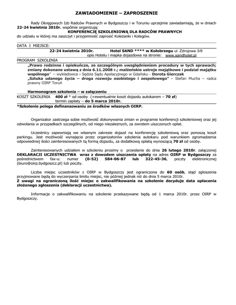 ZAWIADOMIENIE – ZAPROSZENIE Rady Okręgowych Izb Radców Prawnych w Bydgoszczy i w Toruniu uprzejmie zawiadamiają, że w dniach 22-24 kwietnia 2010r. wspólnie organizują: KONFERENCJĘ SZKOLENIOWĄ DLA RADCÓW PRAWNYCH do udziału w której ma zaszczyt i przyjemność zaprosić Koleżanki i Kolegów. DATA I MIEJSCE: 22-24 kwietnia 2010r. Hotel SAND **** w Kołobrzegu ul. Zdrojowa 3/9 opis Hotelu i mapka dojazdowa na stronie: www.sandhotel.pl PROGRAM SZKOLENIA „Prawo rodzinne i opiekuńcze, ze szczególnym uwzględnieniem procedury w tych sprawach; zmiany dokonane ustawą z dnia 6.11.2008 r.; małżeńskie ustroje majątkowe i podział majątku wspólnego” – wykładowca - Sędzia Sądu Apelacyjnego w Gdańsku - Dorota Gierczak „Sztuka udanego życia – droga rozwoju osobistego i zespołowego” - Stefan Mucha – radca prawny OIRP Toruń Harmonogram szkolenia – w załączeniu KOSZT SZKOLENIA 400 zł * od osoby (+ewentualnie koszt dojazdu autokarem – 70 zł) termin zapłaty – do 5 marca 2010r. *Szkolenie polega dofinansowaniu ze środków własnych OIRP. Organizator zastrzega sobie możliwość dokonywania zmian w programie konferencji szkoleniowej oraz jej odwołania w przypadkach szczególnych, od niego niezależnych, za zwrotem uiszczonych opłat. Uczestnicy zapewniają we własnym zakresie dojazd na konferencję szkoleniową oraz ponoszą koszt parkingu. Jest możliwość wynajęcia przez organizatorów szkolenia autokaru pod warunkiem zgromadzenia odpowiedniej ilości zainteresowanych tą formą dojazdu, za dodatkową opłatą wynoszącą 70 zł od osoby. Zainteresowanych udziałem w szkoleniu prosimy o przesłanie do dnia 26 lutego 2010r. załączonej DEKLARACJI UCZESTNICTWA wraz z dowodem uiszczenia opłaty na adres OIRP w Bydgoszczy za pośrednictwem fax-u: numer (0-52) 584-06-87 lub 322-45-36, poczty elektronicznej ([email protected]) lub poczty. Liczba miejsc uczestników z OIRP w Bydgoszczy jest ograniczona do 60 osób, stąd zgłoszenia przyjmowane będą do wyczerpania limitu miejsc, nie później jednak niż do dnia 5 marca 2010r. Z uwagi na ograniczoną ilość miejsc o zakwalifikowania na szkolenie decyduje data opłacenia złożonego zgłoszenia (deklaracji uczestnictwa). Informacje o zakwalifikowaniu na szkolenie przekazywane będą od 1 marca 2010r. przez OIRP w Bydgoszczy. DEKLARACJA UCZESTNICTWA W KONFERENCJI SZKOLENIOWEJ W KOŁOBRZEGU w dniach 22-24 kwietnia 2010 r. 1. Imię i nazwisko ………………………………………………………………………………………………………………….… 2. Numer wpisu na listę radców prawnych OIRP w Bydgoszczy ………..…………………….…………………… 3. Adres kontaktowy, telefon, e-mail: …………………………………………….………………………. ………………………………………………………………………………………………………………………………………………… ……..…………………………………………..………….…………….. Zgłaszam uczestnictwo wskazanego wyżej radcy prawnego w konferencji szkoleniowej w Kołobrzegu w dniach 22-24 kwietnia 2010r., organizowanej wspólnie przez Okręgowe Izby Radców Prawnych w Bydgoszczy i w Toruniu oraz zobowiązuję się do uiszczenia opłaty z tego tytułu w kwocie 400,00 zł od osoby, na rachunek bankowy OIRP w Bydgoszczy - nr kont: BPH O/Bydgoszcz 59 1060 0076 0000 4021 9000 4626 albo Bank Pocztowy 95 1320 1117 2031 7607 2000 0004 lub w kasie OIRP w Bydgoszczy ul. Gdańska 68/6. Jestem/ nie jestem* zainteresowana/-y skorzystaniem z dojazdu w obie strony wynajętym przez organizatora autokarem, w przypadku zgromadzenia odpowiedniej ilości uczestników, deklarując poniesienie opłaty z tego tytułu w wysokości 70,00 zł od osoby. Dowód uiszczenia opłaty przesyłam w załączeniu. Proszę o wystawienie rachunku na n/w płatnika: ………………………………………………………………………………………….. ………………………………………………………………………………………….. Równocześnie oświadczam, że: - akceptuję warunki, określone w zawiadomieniu o szkoleniu; - moja rezygnacja z uczestnictwa w konferencji szkoleniowej nie uprawnia mnie do zwrotu uiszczonej opłaty w przypadku braku radcy, który zechciałby zamiast mnie skorzystać z tego szkolenia; - wyrażam zgodę na przetwarzanie moich danych osobowych przez OIRP w Bydgoszczy na cele związane z organizacją szkolenia i przyjmuję do wiadomości, iż mam prawo wglądu do swoich danych osobowych, ich poprawiania i żądania zaprzestania ich przetwarzania, na zasadach określonych w ustawie z dnia 29 sierpnia 1997r. o ochronie danych osobowych (Dz.U. z 2002r. Nr 101, poz. 926, z późn. zm.). Miejscowość …………………….. data ……………………………… Podpis i pieczątka imienna ………………………….………………… *- niepotrzebne skreślić Harmonogram szkolenia Hotel Sand **** www.sandhotel.pl ul. Zdrojowa 3/9 Kołobrzeg 1 4.0 0- 1 5.0 0 W y j a z d z W ł o c ł a w k a – zbi ó r k a na par k i n g u prz y d w o r c u PKP Fir m a aut o k a r o w a Heliotur W y j a z d z To r u n i a – zbi ó r k a prz y ul. Gr u d z i ą d z k i e j 46/48 pla c D efil a d W y j a z d z B y d g o s z c z y – zbi ó r k a prz y G al e r ii P o m o r s k i e j Pr z y j a z d do K o ł o b r z e g u - za k w a t e r o w a n i e O bi a d – sz w e d z k i stół 1 5.0 0- 1 6. 1 5 Szkolenie – Sędzia Dorota Gierczak 1 6. 1 5- 1 6.4 5 prz e r w a ka w o w a 1 6. 4 5- 1 8.0 0 Szkolenie – Sędzia Dorota Gierczak 7.00 8.00 22.04.2010 9.00 ok. 1 4.0 0 20.00 8.00- 9.00 Prawo rodzinne i opiekuńcze Prawo rodzinne i opiekuńcze K ol a c j a ur o c z y s t a z m u z y k ą Ś nia d a n i e 1 0.0 0- 1 2.0 0 Szkolenie – Sędzia Dorota Gierczak 1 2.0 0- 1 2.3 0 prz e r w a ka w o w a 23