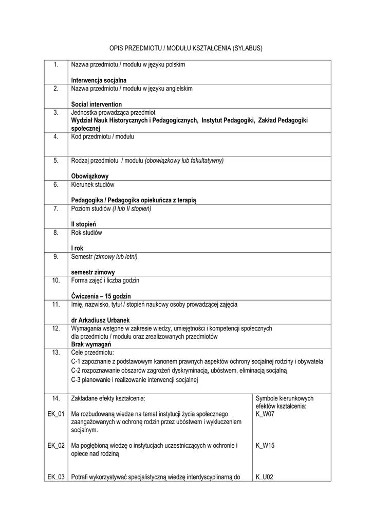 OPIS PRZEDMIOTU / MODUŁU KSZTAŁCENIA (SYLABUS) 1. Nazwa przedmiotu / modułu w języku polskim 2. Interwencja socjalna Nazwa przedmiotu / modułu w języku angielskim 4. Social intervention Jednostka prowadząca przedmiot Wydział Nauk Historycznych i Pedagogicznych, Instytut Pedagogiki, Zakład Pedagogiki społecznej Kod przedmiotu / modułu 5. Rodzaj przedmiotu / modułu (obowiązkowy lub fakultatywny) 6. Obowiązkowy Kierunek studiów 7. Pedagogika / Pedagogika opiekuńcza z terapią Poziom studiów (I lub II stopień) 8. II stopień Rok studiów 9. I rok Semestr (zimowy lub letni) 10. semestr zimowy Forma zajęć i liczba godzin 11. Ćwiczenia – 15 godzin Imię, nazwisko, tytuł / stopień naukowy osoby prowadzącej zajęcia 3. 13. dr Arkadiusz Urbanek Wymagania wstępne w zakresie wiedzy, umiejętności i kompetencji społecznych dla przedmiotu / modułu oraz zrealizowanych przedmiotów Brak wymagań Cele przedmiotu: C-1 zapoznanie z podstawowym kanonem prawnych aspektów ochrony socjalnej rodziny i obywatela C-2 rozpoznawanie obszarów zagrożeń dyskryminacją, ubóstwem, eliminacją socjalną C-3 planowanie i realizowanie interwencji socjalnej 14. Zakładane efekty kształcenia: 12. EK_01 Ma rozbudowaną wiedze na temat instytucji życia społecznego zaangażowanych w ochronę rodzin przez ubóstwem i wykluczeniem socjalnym. Symbole kierunkowych efektów kształcenia: K_W07 EK_02 Ma pogłębioną wiedzę o instytucjach uczestniczących w ochronie i opiece nad rodziną K_W15 EK_03 Potrafi wykorzystywać specjalistyczną wiedzę interdyscyplinarną do K_U02 interpretowania zjawisk społecznych i zagrożeń lokalnych, związanych z wykluczeniem i eliminacją z życia społecznego EK_04 Potrafi konstruować zespoły interwencyjne, planować podstawowe, K_U11 lokalne sieci współpracy socjalnej, animując rozwiązania problemów socjalnych. EK_05 Rozumie miejsce i rolę teorii i empirii nauk pedagogicznych dla praktyki K_K03 ochrony socjalnej obywateli. 15. Treści programowe: 1. Rozumienie interwencji socjalnej i instytucji, które ja sprawują. 2. Polskie i europejskie przepisy ochrony praw socjalnych obywatela i rodziny. 3. Procedury uzyskiwania ochrony socjalnej dla rodzin, zadania rządowe i samorządowe. 4. Współczesne zagrożenia dyskryminacja z ubóstwa i eliminacja socjalna grup z życia społecznego. 5. Procedury interwencji w rodzinie zagrożonej ubóstwem. 16. Zalecana literatura (podręczniki) W. Anioł, Polityka socjalna UE, 2003 M. Rymsza (red.) Pracownicy socjalni i praca socjalna w Polsce. Między służbą a urzędem, Warszawa 2012. A. Urbanek, realizacja zadań pracownika socjalnego w praktyce, Legnica 2012. K. Wódz (red.), Aktywizacja – integracja – spójność społeczna, 2009 J. Zarzeczny (red.), Model społeczny zintegrowanej Europy, 2007 17. Forma zaliczenia poszczególnych komponentów przedmiotu / modułu, sposób sprawdzenia osiągnięcia zamierzonych efektów kształcenia: ćwiczenia: kolokwium K_W07 K_U02 K_K03 projekt działań interwencyjno-wspomagających K_W15 K_U02 K_U11 Kryteria oceny: - ocena bardzo dobra: student potrafi rozstrzygać przypadki rodzin wymagających interwencji socjalnej. Ma dobrą wiedzę o źródłach przepisów prawa, standardach interwencji socjalnej. Rozumie działalność instytucji środowiskowych aktywnych w tym zakresie. Umiejętnie, z zaangażowaniem i refleksją analizuje sytuacje rodzin pod kątem interwencji socjalnej. Umiejętnie rozstrzyga sytuacje problemowe wykazując się wiedzą teoretyczną i praktyczną, pozwalającą na zaplanowanie środowiskowego systemu wsparcia rodziny. - ocena dobra: student potrafi rozstrzygać przypadki rodzin wymagających interwencji socjalnej. Ma dobrą wiedzę o źródłach przepisów prawa i standardach interwencji socjalnej. Zna przykłady instytucji środowiskowych aktywnych w tym zakresie. Umiejętnie, z zaangażowaniem i refleksją analizuje sytuacje rodzin pod kątem interwencji socjalnej, ale propozycje wymagają dopracowania i korekty. Rozstrzyga sytuacje problemowe wykazując się wiedzą teoretyczną i praktyczną, pozwalającą na zaplanowanie środowiskowego systemu wsparcia rodziny. - ocena dostateczna: Student ma podstawową wiedzę o źródłach przepisów prawa i standardach interwencji socjalnej. Zna przykłady instytucji środowiskowych aktywnych w tym zakresie. Z pomocą prowadzącego analizuje sytuacje rodzin pod kątem interwencji socjalnej. Próbuje rozstrzygać sytuacje problemowe wykazując się minimalną wiedzą teoretyczną i praktyczną, pozwalającą na zaplanowanie środowiskowego systemu wsparcia rodziny. - ocena niedostateczna: student nie opanował podstaw wiedzy teoretycznej, nie zna przepisów prawa socjalnego. Nie ma kompetencji do planowania zadań interwencyjnych wobec rodzin. 18. Język wykładowy 19. Polski Obciążenie pracą studenta Forma aktywności studenta Godziny zajęć (według planu studiów) z nauczycielem: - ćwiczenia Praca własna studenta: - przygotowanie do zajęć Średnia liczba godzin na zrealizowanie aktywności 15 15 10 - przygotowanie projektu - przygotowanie do kolokwium semestralnego 20 15 Suma godzin 60 Liczba punktów ECTS 2 *objaśnienie symboli: K (przed podkreśleniem) - kierunkowe efekty kształcenia W - kategoria wiedzy U - kategoria umiejętności K (po podkreśleniu) - kategoria kompetencji społecznych 01, 02, 03 i kolejne - numer efektu kształcenia