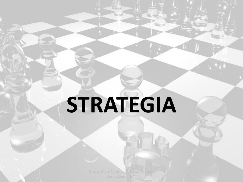 STRATEGIA Prof. dr hab. Monika Kostera Wydział Zarządzania UW 1 Strategia Strategia to zarządzanie granicami organizacji w czasie Strategia – Stan Strategia polega na poszukiwaniu strategicznego dostosowania (strategic fit) – strategia jest skuteczna, gdy łączy to co organizacja potrafi robić (kompetencje) z potrzebami i wymaganiami otoczenia. Celem strategii jest zdobycie przewagi konkurencyjnej. Prof. dr hab. Monika Kostera Wydział Zarządzania UW 3 • • • Strategia – Stan Polega ona na koncentracji zasobów i energii uczestników na kierunku działania wybranym przez zarząd, a więc na realizacji nadrzędnego celu. Oznacza dokonywanie wyborów – firma decyduje się na określone działania, starając się zmaksymalizować szanse wygranej, ale odrzuca inne drogi rozwoju, a więc ponosi także koszty utraconych możliwości. Budowa dobrej strategii opiera się na trafnym i inteligentnym analizowaniu otoczenia, co pozwala na zredukowanie niepewności (Obłój, 2001) Strategia – Stan Strategia jako: Decyzja strategiczna – podjęcie najwłaściwszej decyzji rozwoju na podstawie diagnozy organizacji i analizy otoczenia; struktura podąża za strategią – Alfred Chandler (1962/1998); Strategia powstająca (emergent strategy) – działania organizacji mogą być poddane wpływowi planowania, polegające na stopniowym uczeniu się i kolejnych przybliżeniach; ciągła interakcja z otoczeniem; struktura też wpływa na strategię, James Quinn (1978). Prof. dr hab. Monika Kostera Wydział Zarządzania UW 5 Strategia – Stan Ujęcie sytuacyjne – oba podejścia bywają skuteczne, w zależności od typu otoczenia Prof. dr hab. Monika Kostera Wydział Zarządzania UW 6 Strategia – Stan Złożoność Stopień zmienności Mała Duża Zmiana powolna Model racjonalny Wdrażający formułuje Zmiana szybka Formułujący wdraża ? Rys. 2.2. Model sytuacyjny strategii według Henry’ego Mintzberga Oprac. na podst. Hatch, (1997/2002), s. 125. Prof. dr hab. Monika Kostera Wydział Zarządzania UW 7 Strategia – Stan Diagnoza – Prognoza – Strategia Rys. 2.1. Model tworzenia strategii – metoda SWOT. Źródło: Hatch (1997/2002, 115). Prof. dr hab. Monika Kostera Wydział Zarządzania UW 8 Strategia jako proces Jak się robi strategię? Prof. dr hab. Monika Kostera Wydział Zarządzania UW 9 Strategia – Proces Zarządzanie strategiczne – ciągłe tworzenie organizacji. Wytyczanie granic organizacji względem otoczenia; np. Karl Weick (1969/1979), Charles Stubbart & Linda Smircich (1985). Plan nie jest w stanie zapewnić „mapy” działania – bo proces przebiega w czasie i przyszłość jest niepewna, nie da się sporządzić jej mapy. Jednak plan może się przydać dla podwyższenia morale. Prof. dr hab. Monika Kostera Wydział Zarządzania UW 10