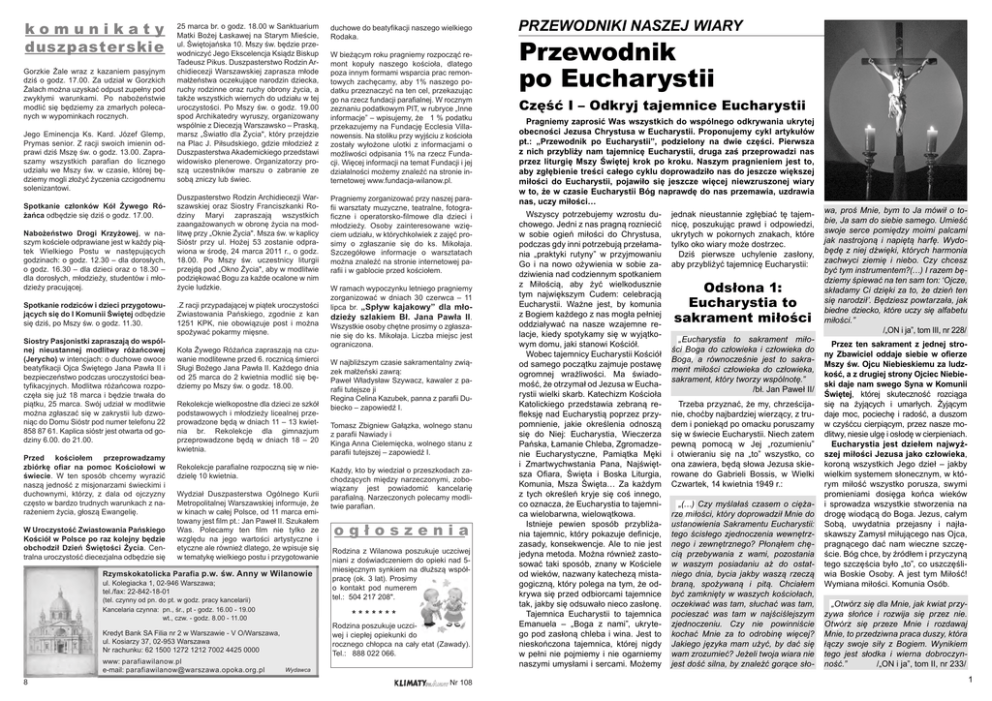 komunikaty duszpaster skie Gorzkie Żale wraz z kazaniem pasyjnym dziś o godz. 17.00. Za udział w Gorzkich Żalach można uzyskać odpust zupełny pod zwykłymi warunkami. Po nabożeństwie modlić się będziemy za zmarłych polecanych w wypominkach rocznych. Jego Eminencja Ks. Kard. Józef Glemp, Prymas senior. Z racji swoich imienin odprawi dziś Mszę św. o godz. 13.00. Zapraszamy wszystkich parafian do licznego udziału we Mszy św. w czasie, której będziemy mogli złożyć życzenia czcigodnemu solenizantowi. Spotkanie członków Kół Żywego Różańca odbędzie się dziś o godz. 17.00. Nabożeństwo Drogi Krzyżowej, w naszym kościele odprawiane jest w każdy piątek Wielkiego Postu w następujących godzinach: o godz. 12.30 – dla dorosłych, o godz. 16.30 – dla dzieci oraz o 18.30 – dla dorosłych, młodzieży, studentów i młodzieży pracującej. Spotkanie rodziców i dzieci przygotowujących się do I Komunii Świętej odbędzie się dziś, po Mszy św. o godz. 11.30. Siostry Pasjonistki zapraszają do wspólnej nieustannej modlitwy różańcowej (Jerycho) w intencjach: o duchowe owoce beatyfikacji Ojca Świętego Jana Pawła II i bezpieczeństwo podczas uroczystości beatyfikacyjnych. Modlitwa różańcowa rozpoczęła się już 18 marca i będzie trwała do piątku, 25 marca. Swój udział w modlitwie można zgłaszać się w zakrystii lub dzwoniąc do Domu Sióstr pod numer telefonu 22 858 87 61. Kaplica sióstr jest otwarta od godziny 6.00. do 21.00. Przed kościołem przeprowadzamy zbiórkę ofiar na pomoc Kościołowi w świecie. W ten sposób chcemy wyrazić naszą jedność z misjonarzami świeckimi i duchownymi, którzy, z dala od ojczyzny często w bardzo trudnych warunkach z narażeniem życia, głoszą Ewangelię. W Uroczystość Zwiastowania Pańskiego Kościół w Polsce po raz kolejny będzie obchodził Dzień Świętości Życia. Centralna uroczystość diecezjalna odbędzie się 25 marca br. o godz. 18.00 w Sanktuarium Matki Bożej Łaskawej na Starym Mieście, ul. Świętojańska 10. Mszy św. będzie przewodniczyć Jego Ekscelencja Ksiądz Biskup Tadeusz Pikus. Duszpasterstwo Rodzin Archidiecezji Warszawskiej zaprasza młode małżeństwa oczekujące narodzin dziecka, ruchy rodzinne oraz ruchy obrony życia, a także wszystkich wiernych do udziału w tej uroczystości. Po Mszy św. o godz. 19.00 spod Archikatedry wyruszy, organizowany wspólnie z Diecezją Warszawsko – Praską, marsz „Światło dla Życia", który przejdzie na Plac J. Piłsudskiego, gdzie młodzież z Duszpasterstwa Akademickiego przedstawi widowisko plenerowe. Organizatorzy proszą uczestników marszu o zabranie ze sobą zniczy lub świec. duchowe do beatyfikacji naszego wielkiego Rodaka. Duszpasterstwo Rodzin Archidiecezji Warszawskiej oraz Siostry Franciszkanki Rodziny Maryi zapraszają wszystkich zaangażowanych w obronę życia na modlitwę przy „Oknie Życia". Msza św. w kaplicy Sióstr przy ul. Hożej 53 zostanie odprawiona w środę, 24 marca 2011 r., o godz. 18.00. Po Mszy św. uczestnicy liturgii przejdą pod „Okno Życia", aby w modlitwie podziękować Bogu za każde ocalone w nim życie ludzkie. Pragniemy zorganizować przy naszej parafii warsztaty muzyczne, teatralne, fotograficzne i operatorsko-filmowe dla dzieci i młodzieży. Osoby zainteresowane wzięciem udziału, w którychkolwiek z zajęć prosimy o zgłaszanie się do ks. Mikołaja. Szczegółowe informacje o warsztatach można znaleźć na stronie internetowej parafii i w gablocie przed kościołem. .Z racji przypadającej w piątek uroczystości Zwiastowania Pańskiego, zgodnie z kan 1251 KPK, nie obowiązuje post i można spożywać pokarmy mięsne. Koła Żywego Różańca zapraszają na czuwanie modlitewne przed 6. rocznicą śmierci Sługi Bożego Jana Pawła II. Każdego dnia od 25 marca do 2 kwietnia modlić się będziemy po Mszy św. o godz. 18.00. Rekolekcje wielkopostne dla dzieci ze szkół podstawowych i młodzieży licealnej przeprowadzone będą w dniach 11 – 13 kwietnia br. Rekolekcje dla gimnazjum przeprowadzone będą w dniach 18 – 20 kwietnia. Rekolekcje parafialne rozpoczną się w niedzielę 10 kwietnia. Wydział Duszpasterstwa Ogólnego Kurii Metropolitalnej Warszawskiej informuje, że w kinach w całej Polsce, od 11 marca emitowany jest film pt.: Jan Paweł II. Szukałem Was. Polecamy ten film nie tylko ze względu na jego wartości artystyczne i etyczne ale również dlatego, że wpisuje się w tematykę wielkiego postu i przygotowanie Rzymskokatolicka Parafia p.w. św. Anny w Wilanowie ul. Kolegiacka 1, 02-946 Warszawa; tel./fax: 22-842-18-01 (tel. czynny od pn. do pt. w godz. pracy kancelarii) Kancelaria czynna: pn., śr., pt - godz. 16.00 - 19.00 wt., czw. - godz. 8.00 - 11.00 8 W ramach wypoczynku letniego pragniemy zorganizować w dniach 30 czerwca – 11 lipca br. „Spływ kajakowy” dla młodzieży szlakiem Bł. Jana Pawła II. Wszystkie osoby chętne prosimy o zgłaszanie się do ks. Mikołaja. Liczba miejsc jest ograniczona. W najbliższym czasie sakramentalny związek małżeński zawrą: Paweł Władysław Szywacz, kawaler z parafii tutejsze ji Regina Celina Kazubek, panna z parafii Dubiecko – zapowiedź I. Tomasz Zbigniew Gałązka, wolnego stanu z parafii Nawiady i Kinga Anna Cielemięcka, wolnego stanu z parafii tutejszej – zapowiedź I. Każdy, kto by wiedział o przeszkodach zachodzących między narzeczonymi, zobowiązany jest powiadomić kancelarię parafialną. Narzeczonych polecamy modlitwie parafian. ogłoszenia Rodzina z Wilanowa poszukuje uczciwej niani z doświadczeniem do opieki nad 5miesięcznym synkiem na dłuższą współpracę (ok. 3 lat). Prosimy o kontakt pod numerem tel.: 504 217 208". ******* Rodzina poszukuje uczciwej i ciepłej opiekunki do rocznego chłopca na cały etat (Zawady). Tel.: 888 022 066. Kredyt Bank SA Filia nr 2 w Warszawie - V O/Warszawa, ul. Kosiarzy 37, 02-953 Warszawa Nr rachunku: 62 1500 1272 1212 7002 4425 0