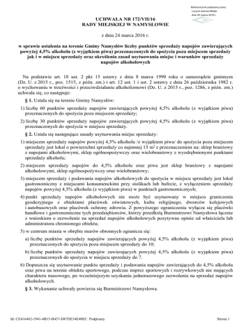 Elektronicznie podpisany przez: Lucyna Joanna Medyk dnia 24 marca 2016 r. UCHWAŁA NR 172/VII/16 RADY MIEJSKIEJ W NAMYSŁOWIE z dnia 24 marca 2016 r. w sprawie ustalenia na terenie Gminy Namysłów liczby punktów sprzedaży napojów zawierających powyżej 4,5% alkoholu (z wyjątkiem piwa) przeznaczonych do spożycia poza miejscem sprzedaży jak i w miejscu sprzedaży oraz określenia zasad usytuowania miejsc i warunków sprzedaży napojów alkoholowych Na podstawie art. 18 ust. 2 pkt 15 ustawy z dnia 8 marca 1990 roku o samorządzie gminnym (Dz. U. z 2015 r., poz. 1515, z późn. zm.) i art. 12 ust. 1 i ust. 2 ustawy z dnia 26 października 1982 r. o wychowaniu w trzeźwości i przeciwdziałaniu alkoholizmowi (Dz. U. z 2015 r., poz. 1286, z późn. zm.) uchwala się, co następuje: § 1. Ustala się na terenie Gminy Namysłów: 1) liczbę 60 punktów sprzedaży napojów zawierających powyżej 4,5% alkoholu (z wyjątkiem piwa) przeznaczonych do spożycia poza miejscem sprzedaży; 2) liczbę 30 punktów sprzedaży napojów zawierających powyżej 4,5% alkoholu (z wyjątkiem piwa) przeznaczonych do spożycia w miejscu sprzedaży. § 2. Ustala się następujące zasady usytuowania miejsc sprzedaży: 1) miejscem sprzedaży napojów powyżej 4,5% alkoholu /z wyjątkiem piwa/ do spożycia poza miejscem sprzedaży jest lokal o powierzchni sprzedaży co najmniej 15 m2 z przeznaczeniem na: sklep branżowy z napojami alkoholowymi, sklep ogólnospożywczy oraz wielobranżowy z wyodrębnionymi punktami sprzedaży alkoholu; 2) miejscem sprzedaży napojów do 4,5% alkoholu oraz piwa jest sklep branżowy z napojami alkoholowymi, sklep ogólnospożywczy oraz wielobranżowy; 3) miejscem sprzedaży i podawania napojów alkoholowych do spożycia w miejscu sprzedaży jest lokal gastronomiczny z miejscami konsumenckimi przy stolikach lub bufecie, z wyłączeniem sprzedaży napojów powyżej 4,5% alkoholu (z wyjątkiem piwa) w punktach gastronomicznych; 4) punkt sprzedaży napojów alkoholowych nie może być usytuowany w miejscu graniczenia geodezyjnego z obiektami placówek oświatowych, kultu religijnego, dworców kolejowych i autobusowych oraz placówek ochrony zdrowia. Z powyższego ograniczenia wyłącza się placówki handlowe i gastronomiczne tych przedsiębiorców, którzy przedłożą Burmistrzowi Namysłowa łącznie z wnioskiem o zezwolenie na sprzedaż napojów alkoholowych pozytywne opinie od właściciela lub administratora chronionego obiektu; 5) w centrum miasta w obrębie murów obronnych ogranicza się: a) liczbę punktów sprzedaży napojów zawierających powyżej 4,5% alkoholu (z wyjątkiem piwa) przeznaczonych do spożycia poza miejscem sprzedaży do 10; b) liczbę punktów sprzedaży napojów zawierających powyżej 4,5% alkoholu (z wyjątkiem piwa) przeznaczonych do spożycia w miejscu sprzedaży do 7. 6) Dopuszcza się usytuowanie punktu sprzedaży i podawania napojów zawierających do 4,5% alkoholu oraz piwa na terenie obiektu sportowego, podczas imprez sportowych i rozrywkowych nie mających charakteru masowego, po wcześniejszym uzyskaniu jednorazowego zezwolenia na sprzedaż napojów alkoholowych. § 3. Wykonanie uchwały powierza się Burmistrzowi Namysłowa. Id: CE416462-1941-4B15-B437-D87DE34E40EC. Podpisany Strona 1 § 4. 1. Uchwała podlega ogłoszeniu w Dzienniku Urzędowym Województwa Opolskiego. 2. Uchwała wchodzi w życie po upływie 14 dni od dnia ogłoszenia w Dzienniku Urzędowym Województwa Opolskiego. § 5. Traci moc Uchwała nr XXXI/444/01 Rady Miejskiej w Namysłowie z dnia 30 października 2001 r. w sprawie ustalenia liczby punktów sprzedaży napojów alkoholowych powyżej 4,5% alkoholu (z wyjątkiem piwa), przeznaczonych do spożycia poza miejscem sprzedaży, jak i w miejscu sprzedaży, oraz określenia zasad usytuowania miejsc sprzedaży napojów alkoholowych i warunków ich sprzedaży, na terenie Gminy Namysłów. Wiceprzewodnicząca Rady Lucyna Medyk Id: CE416462-1941-4B15-B437-D87DE34E40EC. Podpisany Strona 2