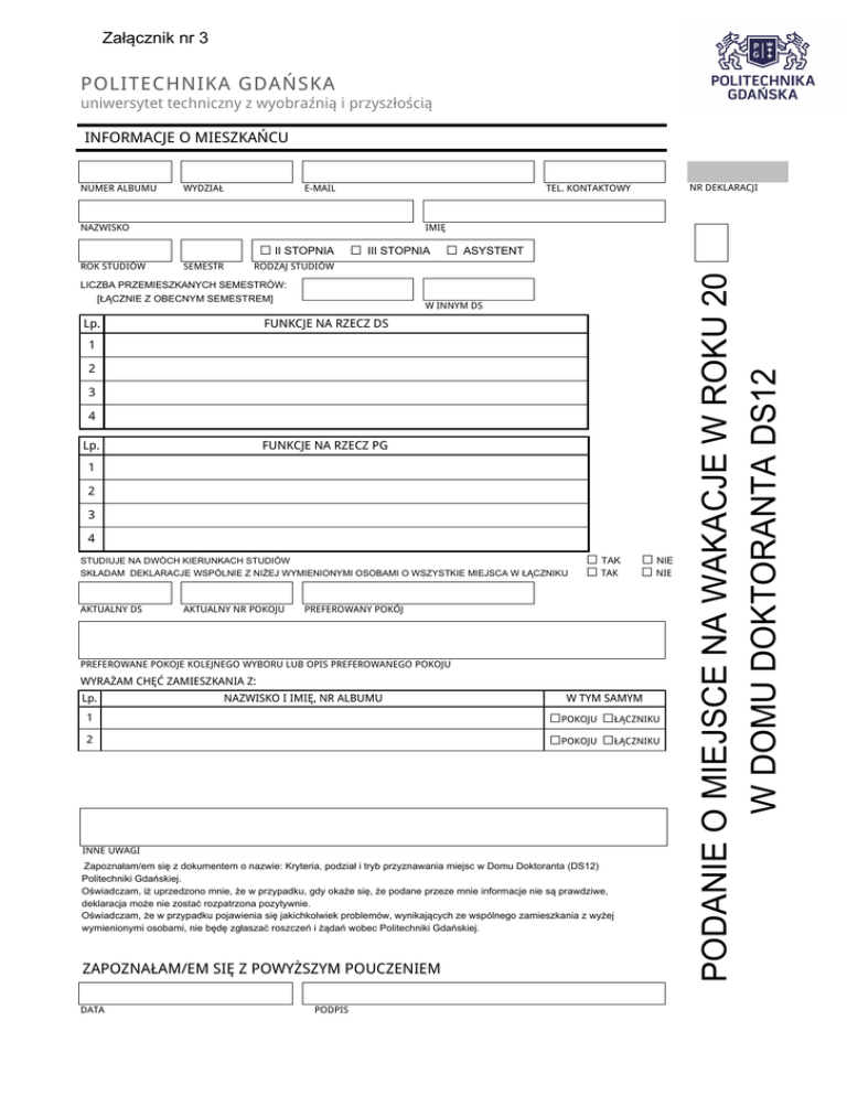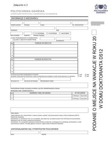 Załącznik nr 3 POLITECHNIKA GDAŃSKA uniwersytet techniczny z wyobraźnią i przyszłością INFORMACJE O MIESZKAŃCU NUMER ALBUMU WYDZIAŁ E-MAIL NAZWISKO NR DEKLARACJI TEL. KONTAKTOWY IMIĘ □ II STOPNIA □ III STOPNIA □ ASYSTENT SEMESTR RODZAJ STUDIÓW LICZBA PRZEMIESZKANYCH SEMESTRÓW: [ŁĄCZNIE Z OBECNYM SEMESTREM] Lp. W PRZYZNAMYM DS W INNYM DS FUNKCJE NA RZECZ DS 1 2 3 4 Lp. FUNKCJE NA RZECZ PG 1 2 3 4 STUDIUJE NA DWÓCH KIERUNKACH STUDIÓW SKŁADAM DEKLARACJE WSPÓLNIE Z NIŻEJ WYMIENIONYMI OSOBAMI O WSZYSTKIE MIEJSCA W ŁĄCZNIKU AKTUALNY DS AKTUALNY NR POKOJU □ TAK □ TAK □ NIE □ NIE PREFEROWANY POKÓJ PREFEROWANE POKOJE KOLEJNEGO WYBORU LUB OPIS PREFEROWANEGO POKOJU WYRAŻAM CHĘĆ ZAMIESZKANIA Z: Lp. NAZWISKO I IMIĘ, NR ALBUMU 1 2 W TYM SAMYM □POKOJU □ŁĄCZNIKU □POKOJU □ŁĄCZNIKU INNE UWAGI Zapoznałam/em się z dokumentem o nazwie: Kryteria, podział i tryb przyznawania miejsc w Domu Doktoranta (DS12) Politechniki Gdańskiej. Oświadczam, iż uprzedzono mnie, że w przypadku, gdy okaże się, że podane przeze mnie informacje nie są prawdziwe, deklaracja może nie zostać rozpatrzona pozytywnie. Oświadczam, że w przypadku pojawienia się jakichkolwiek problemów, wynikających ze wspólnego zamieszkania z wyżej wymienionymi osobami, nie będę zgłaszać roszczeń i żądań wobec Politechniki Gdańskiej. ZAPOZNAŁAM/EM SIĘ Z POWYŻSZYM POUCZENIEM DATA PODPIS PODANIE O MIEJSCE NA WAKACJE W ROKU 20 W DOMU DOKTORANTA DS12 ROK STUDIÓW