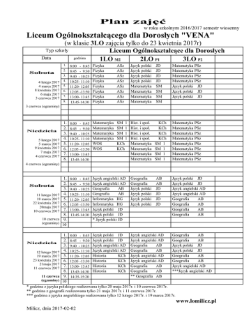 Plan zajęć w roku szkolnym 2016/2017 semestr wiosenny Liceum Ogólnokształcącego dla Dorosłych "VENA" (w klasie 3LO zajęcia tylko do 23 kwietnia 2017r) Typ szkoły Liceum Ogólnokształcące dla Dorosłych godzina Data 1LO M2 2LO P1 3LO P2 1. Sobota 4 lutego 2017 4 marca 2017 8 kwietnia 2017 6 maja 2017 3 czerwca 2017 Fizyka Fizyka Fizyka Fizyka Fizyka Fizyka Fizyka Fizyka ASz ASz ASz ASz ASz ASz ASz ASz Język polski Język polski Język polski Język polski Matematyka Matematyka Matematyka Matematyka JD JD JD JD SM SM SM SM Matematyka PSz Matematyka PSz Matematyka PSz Matematyka PSz Język polski JD Język polski JD Język polski JD 8. 8:00 - 8:45 8:45 - 9:30 9:40 - 10:25 10:25- 11:10 11:20- 12:05 12:05 -13:50 13:00- 13:45 13:45-14:30 1. 2. 3. 4. 5. 6. 7. 8. 8:00 - 8:45 8:45 - 9:30 9:40 - 10:25 10:25- 11:10 11:20- 12:05 12:05 -13:50 13:00- 13:45 13:45-14:30 Matematyka Matematyka Matematyka Matematyka WOS WOS SM 1 SM 1 SM 1 SM 1 KCh KCh Hist. i społ. Hist. i społ. Hist. i społ. Hist. i społ. Matematyka Matematyka Matematyka Matematyka KCh KCh KCh KCh SM 1 SM 1 SM 1 SM 1 Matematyka PSz Matematyka PSz Matematyka PSz Matematyka PSz Matematyka PSz Matematyka PSz Matematyka PSz Matematyka PSz 1. 2. 3. 4. 5. 6. 7. 8. 9. 10 8:00 - 8:45 8:45 - 9:30 9:40 - 10:25 10:25- 11:10 11:20- 12:05 12:05 -13:50 13:00- 13:45 13:45-14:30 Język angielski AD Język angielski AD Geografia AB Geografia AB Informatyka HG Informatyka HG Język polski JD Język polski JD * Język polski JD Geografia Geografia Język polski Język polski Język polski Język polski AB AB JD JD JD JD Język polski JD Język polski JD Język angielski AD Język angielski AD Geografia AB Geografia AB Geografia AB Geografia AB 2. 3. 4. 5. 6. 7. 3 czerwca (egzaminy) Niedziela 5 lutego 2017 5 marca 2017 9 kwietnia 2017 7 maja 2017 4 czerwca 2017 4 czerwca (egzaminy) Sobota 11 lutego 2017 18 marca 2017 22 kwietnia 2017 20maja 2017 10 czerwca 2017 10 czerwca (egzaminy) 1. 8:00 - 8:45 Język polski JD Język angielski AD Geografia AB 2. 8:45 - 9:30 Język polski JD Język angielski AD Geografia AB Niedziela 3. 9:40 - 10:25 Język angielski AD Geografia AB Język polski JD AB Język polski JD 12 lutego 2017 4. 10:25- 11:10 Język angielski AD Geografia KCh Język angielski AD Geografia AB 19 marca 2017 5. 11:20- 12:05 Historia 23 kwietnia 2017 6. 12:05 -13:50 Historia KCh Język angielski AD Geografia AB 21maja 2017 7. 13:00- 13:45 Historia KCh Geografia AB Język angielski AD 11 czerwca 2017 8. 13:45-14:30 Historia KCh Geografia AB ***Język angielski AD 11 czerwca 9. 14:35-15:20 ** Geografia AB (egzaminy) 10 * godzina z języka polskiego realizowana tylko 20 maja 2017r. i 10 czerwca 2017r. ** godzina z geografii realizowana tylko 21 maja 2017r. i 11 czerwca 2017r. *** godzina z języka angielskiego realizowana tylko 12 lutego 2017r. i 19 marca 2017r. www.lomilicz.pl Milicz, dnia 2017-02-02