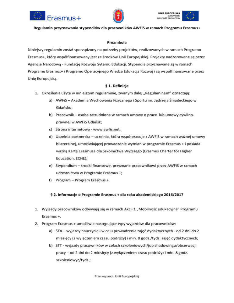 Regulamin przyznawania stypendiów dla pracowników AWFiS w ramach Programu Erasmus+ Preambuła Niniejszy regulamin został sporządzony na potrzeby projektów, realizowanych w ramach Programu Erasmus+, który współfinansowany jest ze środków Unii Europejskiej. Projekty nadzorowane są przez Agencje Narodową - Fundację Rozwoju Sytemu Edukacji. Stypendia przyznawane są w ramach Programu Erasmus+ i Programu Operacyjnego Wiedza Edukacja Rozwój i są współfinansowane przez Unię Europejską. § 1. Definicje 1. Określenia użyte w niniejszym regulaminie, zwanym dalej „Regulaminem” oznaczają: a) AWFiS – Akademia Wychowania Fizycznego i Sportu im. Jędrzeja Śniadeckiego w Gdaosku; b) Pracownik – osoba zatrudniona w ramach umowy o prace lub umowy cywilnoprawnej w AWFiS Gdaosk; c) Strona internetowa - www.awfis.net; d) Uczelnia partnerska – uczelnia, która współpracuje z AWFiS w ramach ważnej umowy bilateralnej, umożlwiającej prowadzenie wymian w programie Erasmus + i posiada ważną Kartę Erasmusa dla Szkolnictwa Wyższego (Erasmus Charter for Higher Education, ECHE); e) Stypendium – środki finansowe, przyznane pracownikowi przez AWFiS w ramach uczestnictwa w Programie Erasmus +; f) Program – Program Erasmus +. § 2. Informacje o Programie Erasmus + dla roku akademickiego 2016/2017 1. Wyjazdy pracowników odbywają się w ramach Akcji 1 „Mobilnośd edukacyjna” Programu Erasmus +. 2. Program Erasmus + umożliwia następujące typy wyjazdów dla pracowników: a) STA – wyjazdy nauczycieli w celu prowadzenia zajęd dydaktycznych - od 2 dni do 2 miesięcy (z wyłączeniem czasu podróży) i min. 8 godz./tydz. zajęd dydaktycznych; b) STT - wyjazdy pracowników w celach szkoleniowych/job shadowingu/obserwacji pracy – od 2 dni do 2 miesięcy (z wyłączeniem czasu podróży) i min. 8 godz. szkoleniowyc/tydz.; Przy wsparciu Unii Europejskiej 3. Wyjazdy w ramach kategorii wymienionych w § 2 pkt. 2 możliwe są tylko między uczelniami partnerskimi i/lub instytucjami funkcjonującymi na terenie Unii Europejskiej. 4. Finansowanie wjazdów dla pracowników AWFiS obejmuje okres 01.06.2015-31.05.2018, z zastrzeżeniem, że w pierwszej kolejności realizowane będą wyjazdy, których termin zakooczenia przypada na 31.05.2017. 5. Szczegółowe informacje o funkcjonowaniu Programu znajdują się w niniejszym Regulaminie jak i na stronie internetowej uczelni w zakładce „Uczelnia / Erasmus”. § 3. Kryteria rekrutacji 1. Pracownicy ubiegający się o wyjazd w ramach kategorii STA i STT muszą spełnid następujące kryteria: a) byd pracownikiem zatrudnionym w ramach umowy o pracę lub umowy cywilnoprawnej w AWFiS; b) znad język obcy w stopniu umożliwiającym uczestnictwo w zajęciach / szkoleniach na zagranicznej uczelni lub instytucji; 2. Wyjazdy typu STA skierowane są do pracowników naukowych, naukowo-dydaktycznych i dydaktycznych AWFiS. 3. Wyjazdy typu STT skierowane są do wszystkich pracowników AWFiS. 4. Wyjazdy typu STA umożliwiają prowadzenie zajęd dydaktycznych w dowolnym obszarze przedmiotowym/dowolnej dyscyplinie akademickiej w partnerskich instytucjach szkolnictwa wyższego za granicą. 5. Wyjazdy typu STT zapewniają wsparcie w zakresie doskonalenia zawodowego wszystkich pracowników w następujących formach: job shadowing, inne, szkolenie, warsztat. §4. Procedura rekrutacji STA,STT 1. Pracownik zainteresowany uzyskaniem stypendium składa w Biurze Programu Erasmus następujące dokumenty: a. formularz zgłoszenia na wyjazd typu STA, STT (Załącznik nr 1 - Formularz zgłoszeniowy pracownika STA, STT) b. dokument potwierdzający znajomośd języka obcego (jeśli taki posiada). Nie dotyczy pracowników Studium Języków Obcych wyjeżdżających do jednego z krajów, w których językiem urzędowym jest język nauczany przez nich w AWFiS. Przy wsparciu Unii Europejskiej 2. Na etapie rekrutacji pracownik ubiegający się o wyjazd STA ma obowiązek wskazad uczelnię i wydział tej uczelni, na którym chciałby realizowad wyjazd. 3. Na etapie rekrutacji pracownik ubiegający się o wyjazd STT ma obowiązek wskazad uczelnię, przedsiębiorstwo lub instytucje, w której chciałby realizowad wyjazd. 4. Dokumenty rekrutacyjne należy złożyd do dnia zakooczenia rekrutacji, której termin zostanie ogłoszony na stronie internetowej. 5. Po zakooczeniu procesu rekrutacji dokumentacja złożona przez pracowników jest poddawana ocenie przez komisję kwalifikacyjną powołaną przez Rektora. 6. Komisji kwalifikacyjna dokonuje weryfikacji pracowników na podstawie złożonych przez nich dokumentów. 7. Pracownik może uzyskad maksymalnie 15 punktów, wg następujących kryteriów: a. zawartośd przedstawionego przez pracownika Indywidualnego programu nauczania, szkolenia, w tym: i. korzyści dla uczelni z działao podejmowanych podczas pobytu – 5 punktów, ii. programu nauczania/szkolenia – 2 punkty, b. znajomośd języka obcego, w którym będą prowadzone zajęcia: i. w przypadku znajomości języka na poziomie A1-A2 – 1 punkt, ii. w przypadku znajomości języka na poziomie B1-B2 – 2 punkty, iii. w przypadku znajomości języka na poziomie C1-C2 – 3 punktów, c. wskazanie czy jest to pierwszy czy kolejny wyjazd w ramach Erasmus: i. jeżeli wyjazd po raz pierwszy – 3 punkty, ii. jeżeli wyjazd po raz kolejny – 1 punkt. d. doświadczenie dydaktyczne - staż pracy: i. do 10 lat – 1 punkt ii. powyżej 10 lat – 2 punkty 8. Pierwszeostwo przy kwalifikacji na wyjazdy pracowników będą miały osoby, które będą korzystad po raz pierwszy z Programu Erasmus+. 9. W sytuacji uzyskania takiej samej liczby punktów pierwszeostwo do wjazdu będą miały osoby wyjeżdżające po raz pierwszy lub z mniejszą liczbą zrealizowanych wyjazdów . 10. Przy kwalifikacji na wyjazdy pracowników preferencyjnie traktowani będą pracownicy etatowi uczelni (wykorzystywanie wyjazdów w programie Erasmus+ do podnoszenia kwalifikacji pracowników etatowych). 11. W