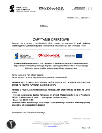 Pruszków, dnia ....... lipca 2013 r. ADRESAT: ........................................................... ………………………………………... ZAPYTANIE OFERTOWE Zwracam się z prośbą o przedstawienie oferty cenowej na wykonanie 8 sztuk plakietek informacyjnych, wykonanych z pleksi o wymiarach: 8 cm (szerokość) x 2 cm (wysokość) i treści: Projekt współfinansowany przez Unię Europejską ze środków Europejskiego Funduszu Rozwoju Regionalnego w ramach Regionalnego Programu Operacyjnego Województwa Mazowieckiego 2007-2013 oraz ze środków budżetu województwa mazowieckiego Termin wykonania: 7 dni od daty zlecenia; Termin płatności: 30 dni od daty dostarczenia prawidłowo wystawionej FV. ZAMAWIAJĄCY WYMAGA WYSTAWIENIA DWÓCH FAKTUR VAT, KTÓRYCH PRZEDMIOTEM BĘDZIE PO 4 SZTUKI PLAKIETEK (ŁĄCZNIE 8 SZTUK). PROSZĘ O PRZESŁANIE WYPEŁNIONEGO FORMULARZA OFERTOWEGO DO DNIA 16 LIPCA 2013 r.: - w wersji papierowej do Szpitala Kolejowego im. dr med. Włodzimierza Roeflera w Pruszkowie SPZOZ, ul. Warsztatowa 1, pokój ....., piętro parter, dział zaopatrzenia; - faxem - tel.: 22 770 93 09; - e-mailem - skan wypełnionego, podpisanego i opieczętowanego formularza ofertowego proszę przesłać na adres: [email protected] W załączeniu – wzór formularza ofertowego. dla rozwoju Mazowsza Szpital Kolejowy im. Włodzimierza Roeflera w Pruszkowie SPZOZ 05-800 Pruszków, ul. Warsztatowa 1 NIP: 534-20-17-762 Regon: 010648673 Tel. (22) 770-94-99 Faks: (22) 770-94-80 email: [email protected] Strona 1 z 2 ……………………………..dnia ………………………….. FORMULARZ OFERTOWY Wykonanie 8 sztuk plakietek z pleksi za cenę jednostkową ……………………… zł netto, …………………………… zł brutto, łącznie za wykonanie 8 sztuk plakietek : …………………….. zł netto, ……………………… zł brutto. Oferowane plakietki będą wykonane z materiałów odpornych na warunki atmosferyczne i środki czystości, będą miały wymiary: 8 cm (szerokość) x 2 cm (wysokość), według wymogów Zamawiającego zawartych w zapytaniu ofertowym. Oświadczamy, że akceptujemy wymóg Zamawiającego o wystawieniu dwóch FV dla ww. zakresu, po 4 szt. plakietek na jednej FV. Termin wykonania: 7 dni od daty zlecenia; Termin płatności – 30 dni od daty otrzymania prawidłowo wystawionej FV na podstawie podpisanego przez obydwie strony protokołu odbioru. ……………………………….. Podpis osoby upoważnionej w imieniu oferenta Pieczęć firmowa oferenta dla rozwoju Mazowsza Szpital Kolejowy im. Włodzimierza Roeflera w Pruszkowie SPZOZ 05-800 Pruszków, ul. Warsztatowa 1 NIP: 534-20-17-762 Regon: 010648673 Tel. (22) 770-94-99 Faks: (22) 770-94-80 email: [email protected] Strona 2 z 2