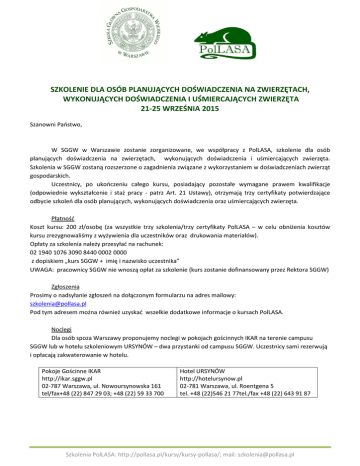 SZKOLENIE DLA OSÓB PLANUJĄCYCH DOŚWIADCZENIA NA ZWIERZĘTACH, WYKONUJĄCYCH DOŚWIADCZENIA I UŚMIERCAJĄCYCH ZWIERZĘTA 21-25 WRZEŚNIA 2015 Szanowni Państwo, W SGGW w Warszawie zostanie zorganizowane, we współpracy z PolLASA, szkolenie dla osób planujących doświadczenia na zwierzętach, wykonujących doświadczenia i uśmiercających zwierzęta. Szkolenia w SGGW zostaną rozszerzone o zagadnienia związane z wykorzystaniem w doświadczeniach zwierząt gospodarskich. Uczestnicy, po ukończeniu całego kursu, posiadający pozostałe wymagane prawem kwalifikacje (odpowiednie wykształcenie i staż pracy - patrz Art. 21 Ustawy), otrzymają trzy certyfikaty potwierdzające odbycie szkoleń dla osób planujących, wykonujących doświadczenia oraz uśmiercających zwierzęta. Płatność Koszt kursu: 200 zł/osobę (za wszystkie trzy szkolenia/trzy certyfikaty PolLASA – w celu obniżenia kosztów kursu zrezygnowaliśmy z wyżywienia dla uczestników oraz drukowania materiałów). Opłaty za szkolenia należy przesyłać na rachunek: 02 1940 1076 3090 8440 0002 0000 z dopiskiem „kurs SGGW + imię i nazwisko uczestnika” UWAGA: pracownicy SGGW nie wnoszą opłat za szkolenie (kurs zostanie dofinansowany przez Rektora SGGW) Zgłoszenia Prosimy o nadsyłanie zgłoszeń na dołączonym formularzu na adres mailowy: [email protected] Pod tym adresem można również uzyskać wszelkie dodatkowe informacje o kursach PolLASA. Noclegi Dla osób spoza Warszawy proponujemy noclegi w pokojach gościnnych IKAR na terenie campusu SGGW lub w hotelu szkoleniowym URSYNÓW – dwa przystanki od campusu SGGW. Uczestnicy sami rezerwują i opłacają zakwaterowanie w hotelu. Pokoje Gościnne IKAR http://ikar.sggw.pl 02-787 Warszawa, ul. Nowoursynowska 161 tel/fax+48 (22) 847 29 03; +48 (22) 59 33 700 Hotel URSYNÓW http://hotelursynow.pl 02-781 Warszawa, ul. Roentgena 5 tel. +48 (22)546 21 77tel./fax +48 (22) 643 91 87 Szkolenia PolLASA: http://pollasa.pl/kursy/kursy-pollasa/; mail: [email protected]
