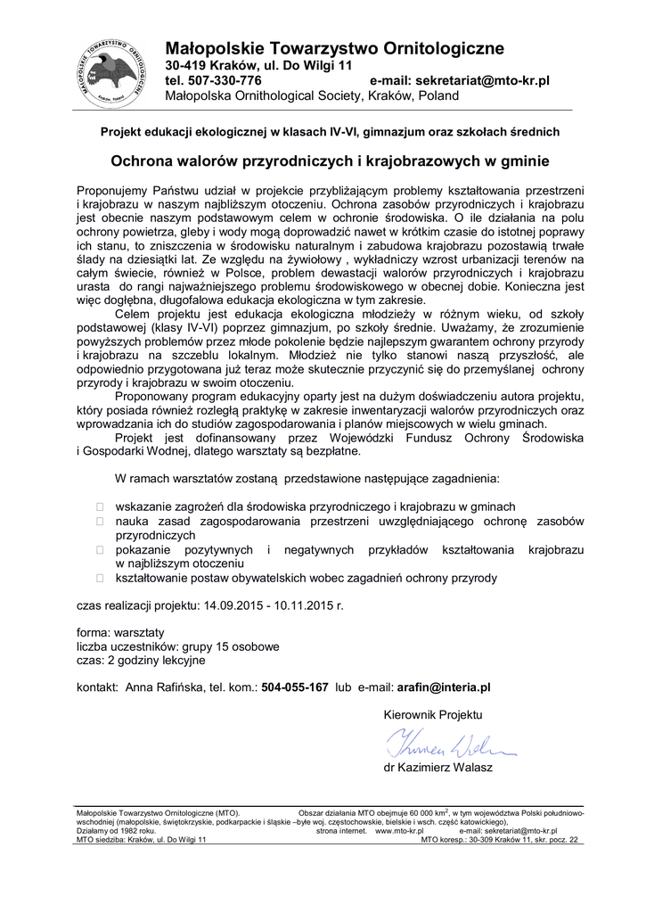 Ma opolskie Towarzystwo Ornitologiczne 30-419 Kraków, ul. Do Wilgi 11 tel. 507-330-776 e-mail: [email protected] Ma opolska Ornithological Society, Kraków, Poland Projekt edukacji ekologicznej w klasach IV-VI, gimnazjum oraz szko ach rednich Ochrona walorów przyrodniczych i krajobrazowych w gminie Proponujemy Pa stwu udzia w projekcie przybli aj cym problemy kszta towania przestrzeni i krajobrazu w naszym najbli szym otoczeniu. Ochrona zasobów przyrodniczych i krajobrazu jest obecnie naszym podstawowym celem w ochronie rodowiska. O ile dzia ania na polu ochrony powietrza, gleby i wody mog doprowadzi nawet w krótkim czasie do istotnej poprawy ich stanu, to zniszczenia w rodowisku naturalnym i zabudowa krajobrazu pozostawi trwa e lady na dziesi tki lat. Ze wzgl du na ywio owy , wyk adniczy wzrost urbanizacji terenów na ca ym wiecie, równie w Polsce, problem dewastacji walorów przyrodniczych i krajobrazu urasta do rangi najwa niejszego problemu rodowiskowego w obecnej dobie. Konieczna jest wi c dog bna, d ugofalowa edukacja ekologiczna w tym zakresie. Celem projektu jest edukacja ekologiczna m odzie y w ró nym wieku, od szko y podstawowej (klasy IV-VI) poprzez gimnazjum, po szko y rednie. Uwa amy, e zrozumienie powy szych problemów przez m ode pokolenie b dzie najlepszym gwarantem ochrony przyrody i krajobrazu na szczeblu lokalnym. M odzie nie tylko stanowi nasz przysz , ale odpowiednio przygotowana ju teraz mo e skutecznie przyczyni si do przemy lanej ochrony przyrody i krajobrazu w swoim otoczeniu. Proponowany program edukacyjny oparty jest na du ym do wiadczeniu autora projektu, który posiada równie rozleg praktyk w zakresie inwentaryzacji walorów przyrodniczych oraz wprowadzania ich do studiów zagospodarowania i planów miejscowych w wielu gminach. Projekt jest dofinansowany przez Wojewódzki Fundusz Ochrony rodowiska i Gospodarki Wodnej, dlatego warsztaty s bezp atne. W ramach warsztatów zostan przedstawione nast puj ce zagadnienia: wskazanie zagro dla rodowiska przyrodniczego i krajobrazu w gminach nauka zasad zagospodarowania przestrzeni uwzgl dniaj cego ochron zasobów przyrodniczych pokazanie pozytywnych i negatywnych przyk adów kszta towania krajobrazu w najbli szym otoczeniu kszta towanie postaw obywatelskich wobec zagadnie ochrony przyrody czas realizacji projektu: 14.09.2015 - 10.11.2015 r. forma: warsztaty liczba uczestników: grupy 15 osobowe czas: 2 godziny lekcyjne kontakt: Anna Rafi ska, tel. kom.: 504-055-167 lub e-mail: [email protected] Kierownik Projektu dr Kazimierz Walasz Ma opolskie Towarzystwo Ornitologiczne (MTO). wschodniej (ma opolskie, wi tokrzyskie, podkarpackie i Dzia amy od 1982 roku. MTO siedziba: Kraków, ul. Do Wilgi 11 Obszar dzia ania MTO obejmuje 60 000 km2, w tym województwa Polski po udniowoskie –by e woj. cz stochowskie, bielskie i wsch. cz katowickiego), strona internet. www.mto-kr.pl e-mail: [email protected] MTO koresp.: 30-309 Kraków 11, skr. pocz. 22