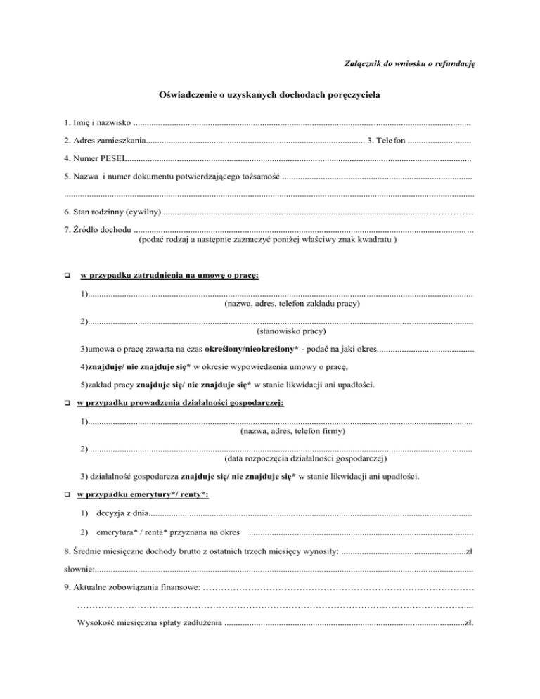Oświadczenie o uzyskanych dochodach poręczyciela