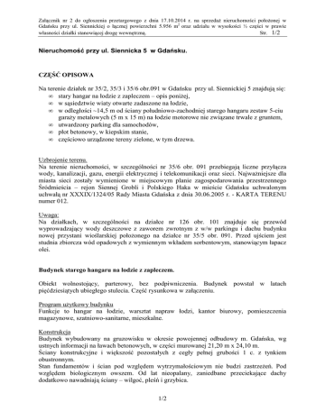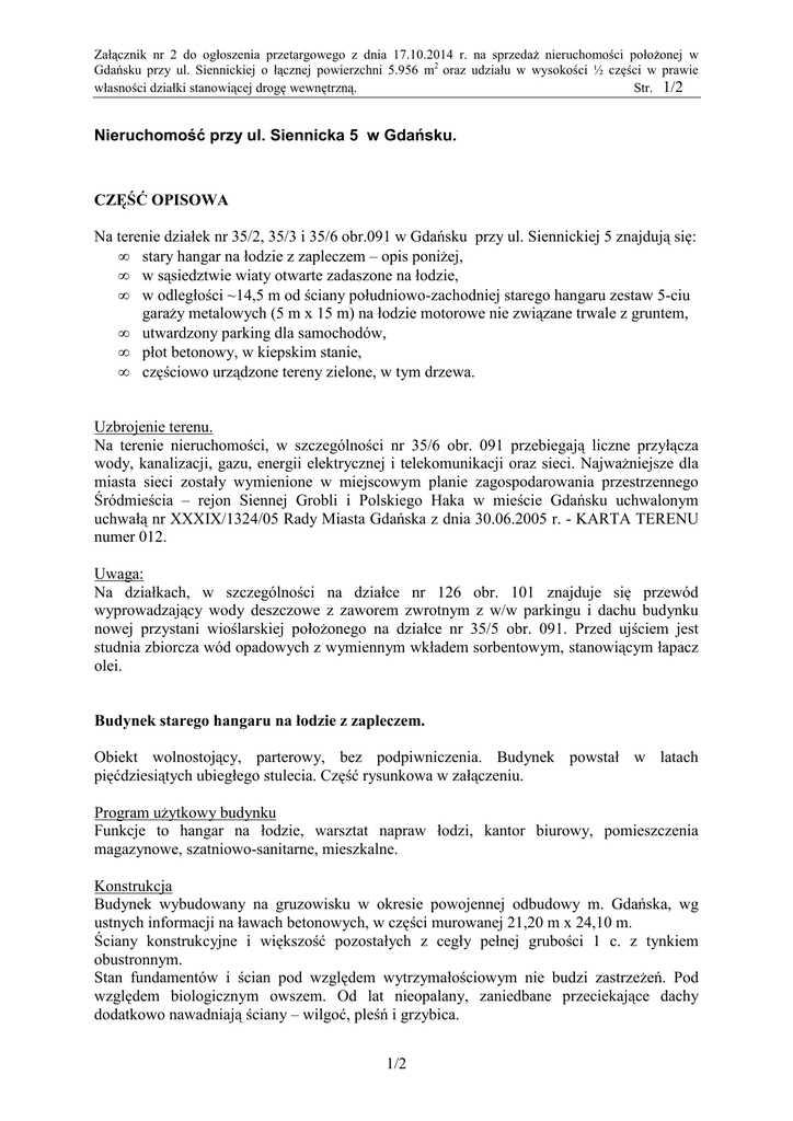 Załącznik nr 2 do ogłoszenia przetargowego z dnia 17.10.2014 r. na sprzedaż nieruchomości położonej w Gdańsku przy ul. Siennickiej o łącznej powierzchni 5.956 m2 oraz udziału w wysokości ½ części w prawie własności działki stanowiącej drogę wewnętrzną. Str. 1/2 Nieruchomość przy ul. Siennicka 5 w Gdańsku. CZĘŚĆ OPISOWA Na terenie działek nr 35/2, 35/3 i 35/6 obr.091 w Gdańsku przy ul. Siennickiej 5 znajdują się: • stary hangar na łodzie z zapleczem – opis poniżej, • w sąsiedztwie wiaty otwarte zadaszone na łodzie, • w odległości ~14,5 m od ściany południowo-zachodniej starego hangaru zestaw 5-ciu garaży metalowych (5 m x 15 m) na łodzie motorowe nie związane trwale z gruntem, • utwardzony parking dla samochodów, • płot betonowy, w kiepskim stanie, • częściowo urządzone tereny zielone, w tym drzewa. Uzbrojenie terenu. Na terenie nieruchomości, w szczególności nr 35/6 obr. 091 przebiegają liczne przyłącza wody, kanalizacji, gazu, energii elektrycznej i telekomunikacji oraz sieci. Najważniejsze dla miasta sieci zostały wymienione w miejscowym planie zagospodarowania przestrzennego Śródmieścia – rejon Siennej Grobli i Polskiego Haka w mieście Gdańsku uchwalonym uchwałą nr XXXIX/1324/05 Rady Miasta Gdańska z dnia 30.06.2005 r. - KARTA TERENU numer 012. Uwaga: Na działkach, w szczególności na działce nr 126 obr. 101 znajduje się przewód wyprowadzający wody deszczowe z zaworem zwrotnym z w/w parkingu i dachu budynku nowej przystani wioślarskiej położonego na działce nr 35/5 obr. 091. Przed ujściem jest studnia zbiorcza wód opadowych z wymiennym wkładem sorbentowym, stanowiącym łapacz olei. Budynek starego hangaru na łodzie z zapleczem. Obiekt wolnostojący, parterowy, bez podpiwniczenia. Budynek powstał w latach pięćdziesiątych ubiegłego stulecia. Część rysunkowa w załączeniu. Program użytkowy budynku Funkcje to hangar na łodzie, warsztat napraw łodzi, kantor biurowy, pomieszczenia magazynowe, szatniowo-sanitarne, mieszkalne. Konstrukcja Budynek wybudowany na gruzowisku w okresie powojennej odbudowy m. Gdańska, wg ustnych informacji na ławach betonowych, w części murowanej 21,20 m x 24,10 m. Ściany konstrukcyjne i większość pozostałych z cegły pełnej grubości 1 c. z tynkiem obustronnym. Stan fundamentów i ścian pod względem wytrzymałościowym nie budzi zastrzeżeń. Pod względem biologicznym owszem. Od lat nieopalany, zaniedbane przeciekające dachy dodatkowo nawadniają ściany – wilgoć, pleśń i grzybica. 1/2 Załącznik nr 2 do ogłoszenia przetargowego z dnia 17.10.2014 r. na sprzedaż nieruchomości położonej w Gdańsku przy ul. Siennickiej o łącznej powierzchni 5.956 m2 oraz udziału w wysokości ½ części w prawie własności działki stanowiącej drogę wewnętrzną. Str. 2/2 Budynek posiada stropodach drewniany o dźwigarach w postaci zbijaków deskowych i krawędziaków z podsufitką w większości z płyt pilśniowych, przynajmniej w części ma docieplenia z wełny szklanej lub mineralnej. Połać stanowi deskowanie z pokryciem z papy asfaltowej, które z powodu zaniedbań miejscowo mocno przeciekają. Budynek posiadał instalacje wodną, ze studni przyłączeniowej poza działkami z punktem pomiarowym /odłączone/. Budynek posiadał instalacje gazową w szczególności do zasilania kotła gazowego. Przyłącze zamknięte, licznik zdemontowany. Budynek posiadał instalację elektryczną /odłączona od zasilania/. Obok budynku usytuowane jest złącze kontrolno-pomiarowe zasilania studni z pkt. kontroli wody usytuowanej na terenie AWFiS /na wodociągu DN500/ , należące do GIWK Gdańsk. Dane powierzchniowe i kubatura Powierzchnia zabudowy z podcieniami Powierzchnia zabudowy cz. murowanej Powierzchnia netto cz. murowanej Powierzchnia użytkowa cz. murowanej Kubatura netto Wysokość pomieszczeń podstawowa 560,00 m² 511,00 m² 448,00 m² 448,00 m² 1370,00 m³ 2,80 m. Dane powierzchniowe i kubaturę budynku ustalono na podstawie danych AWFiS oraz szkiców inwentaryzacyjnych. W czasie oględzin nieruchomości stwierdzono, że stan techniczny budynku zagraża bezpieczeństwu użytkowników. Ściany zewnętrzne wykazują odchylenie od pionu. Strop drewniany wykazuje nadmierne ugięcie. W dachu budynku występują przecieki przez co budynek ulega szybkiej degradacji. Ściany zewnętrzne zawilgocone. Budynek znajduje się w bardzo zły stanie technicznym, który może zagrażać bezpieczeństwu ludzi. Jego remont lub modernizacja jest nieuzasadniona ze względów ekonomicznych. Zasadniczo budynek jest przeznaczony do rozbiórki. 2/2