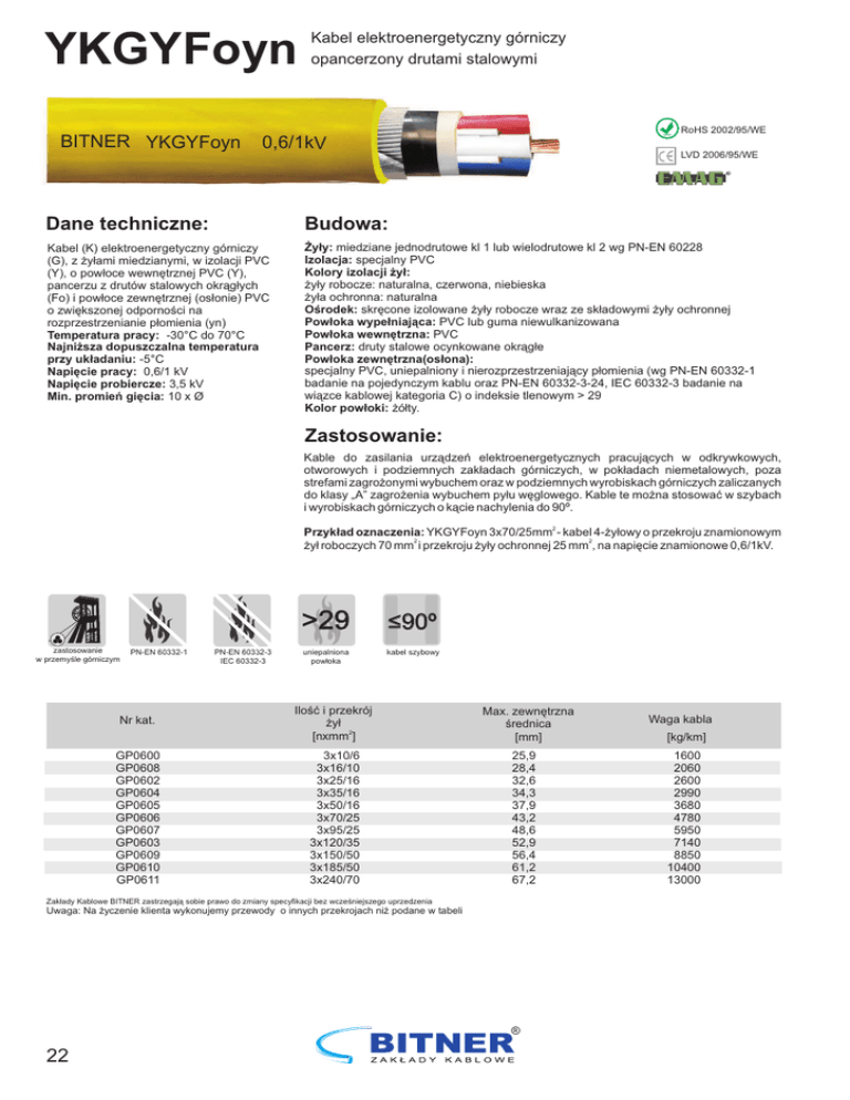 YKGYFoyn BITNER YKGYFoyn Kabel elektroenergetyczny górniczy opancerzony drutami stalowymi 0,6/1kV RoHS RoHS 2002/95/WE LVD 2006/95/WE Dane techniczne: Budowa: Kabel (K) elektroenergetyczny górniczy (G), z żyłami miedzianymi, w izolacji PVC (Y), o powłoce wewnętrznej PVC (Y), pancerzu z drutów stalowych okrągłych (Fo) i powłoce zewnętrznej (osłonie) PVC o zwiększonej odporności na rozprzestrzenianie płomienia (yn) Temperatura pracy: -30°C do 70°C Najniższa dopuszczalna temperatura przy układaniu: -5°C Napięcie pracy: 0,6/1 kV Napięcie probiercze: 3,5 kV Min. promień gięcia: 10 x Ø Żyły: miedziane jednodrutowe kl 1 lub wielodrutowe kl 2 wg PN-EN 60228 Izolacja: specjalny PVC Kolory izolacji żył: żyły robocze: naturalna, czerwona, niebieska żyła ochronna: naturalna Ośrodek: skręcone izolowane żyły robocze wraz ze składowymi żyły ochronnej Powłoka wypełniająca: PVC lub guma niewulkanizowana Powłoka wewnętrzna: PVC Pancerz: druty stalowe ocynkowane okrągłe Powłoka zewnętrzna(osłona): specjalny PVC, uniepalniony i nierozprzestrzeniający płomienia (wg PN-EN 60332-1 badanie na pojedynczym kablu oraz PN-EN 60332-3-24, IEC 60332-3 badanie na wiązce kablowej kategoria C) o indeksie tlenowym > 29 Kolor powłoki: żółty. Zastosowanie: Kable do zasilania urządzeń elektroenergetycznych pracujących w odkrywkowych, otworowych i podziemnych zakładach górniczych, w pokładach niemetalowych, poza strefami zagrożonymi wybuchem oraz w podziemnych wyrobiskach górniczych zaliczanych do klasy „A” zagrożenia wybuchem pyłu węglowego. Kable te można stosować w szybach i wyrobiskach górniczych o kącie nachylenia do 90º. Przykład oznaczenia: YKGYFoyn 3x70/25mm - kabel 4-żyłowy o przekroju znamionowym 2 2 żył roboczych 70 mm i przekroju żyły ochronnej 25 mm , na napięcie znamionowe 0,6/1kV. 2 zastosowanie w przemyśle górniczym PN-EN 60332-1 PN-EN 60332-3 IEC 60332-3 >29 ≤90º uniepalniona powłoka kabel szybowy Nr kat. Ilość i przekrój żył [nxmm2] GP0600 GP0608 GP0602 GP0604 GP0605 GP0606 GP0607 GP0603 GP0609 GP0610 GP0611 3x10/6 3x16/10 3x25/16 3x35/16 3x50/16 3x70/25 3x95/25 3x120/35 3x150/50 3x185/50 3x240/70 Max. zewnętrzna średnica [mm] 25,9 28,4 32,6 34,3 37,9 43,2 48,6 52,9 56,4 61,2 67,2 Zakłady Kablowe BITNER zastrzegają sobie prawo do zmiany specyfikacji bez wcześniejszego uprzedzenia Uwaga: Na życzenie klienta wykonujemy przewody o innych przekrojach niż podane w tabeli ® 22 Waga kabla [kg/km] 1600 2060 2600 2990 3680 4780 5950 7140 8850 10400 13000 YKGYFoyn Przekrój żył Rezystancja żył roboczych [mm ] [Ω/km] 10 16 25 35 50 70 95 120 150 185 240 1,83 1,15 0,727 0,524 0,387 0,268 0,193 0,153 0,124 0,099 0,075 2 Kabel elektroenergetyczny górniczy opancerzony drutami stalowymi Indukcyjność jednostkowa [mH/km] 0,28 0,27 0,27 0,26 0,25 0,24 0,24 0,24 0,24 0,24 0,23 Reaktancja indukcyjna [Ω/km] Obciążalność długotrwała [A] Obciążalność zwarciowa* [kA] 0,089 0,084 0,084 0,082 0,080 0,077 0,076 0,075 0,074 0,074 0,074 64 86 113 139 173 212 257 294 339 387 454 1,15 1,84 2,88 4,03 5,75 8,05 10,93 13,80 17,25 21,28 27,60 * obciążalność zwarciowa 1 sekundowa, obliczona przy założeniu, że temperatura żył roboczych w chwili zwarcia jest równa temperaturze dopuszczalnej długotrwale 1 2 3 4 5 1. Żyła robocza 2. Izolacja 3. Wkładka polwinitowa 4. Składowa żyły ochronnej 5. Izolacja żyły ochronnej 6. Powłoka wypełniająca 7. Powłoka 8. Pancerz z drutów stalowych okrągłych 9. Osłona 6 7 8 9 ® 23