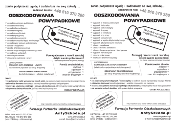 ’ ’ zanim podpiszesz ugodę i zadziałasz na swą szkodę... zadzwoń do nas: +48 51 0 zanim podpiszesz ugodę i zadziałasz na swą szkodę... zadzwoń do nas: 3 +48 51 0 3 70 280 ODSZKODOWANIA POWYPADKOWE F wypadek w miejscu publicznym 70 280 ODSZKODOWANIA POWYPADKOWE F wypadek w miejscu publicznym F wypadek śmiertelny F wypadek komunikacyjny F wypadek drogowy F wypadek w rolnictwie F wypadek przy pracy F wypadek konsumencki F wypadek w wyniku błędu medycznego F wypadek gdy sprawca jest nieznany F szkoda - majątkowa F szkoda- choroba zawodowa F szkoda- słupy energetyczne i sieci gazowe F wypadek na wakacjach F zatrucie pokarmowe F niesłuszne zwolnienie z pracy F wypadek śmiertelny F wypadek komunikacyjny F wypadek drogowy F wypadek w rolnictwie F wypadek przy pracy F wypadek konsumencki F wypadek w wyniku błędu medycznego F wypadek gdy sprawca jest nieznany F szkoda - majątkowa F szkoda- choroba zawodowa F szkoda- słupy energetyczne i sieci gazowe F wypadek na wakacjach F zatrucie pokarmowe F niesłuszne zwolnienie z pracy Wsz znaj ystkie s dzie z sz n czegół y a str oni e Ant ySzk o da.pl Pomagaj razem z nami i zarabiaj dzięki swoim poleceniom! Wsz znaj ystkie s d zi e z sz n czegół y a str onie Ant ySzk o Pomagaj razem z nami i zarabiaj dzięki swoim poleceniom! (za każde polecenie otrzymasz prowizję) (za każde polecenie otrzymasz prowizję) UDOSTĘPNIAMY DARMOWE AUTA ZASTĘPCZE I LAWETY (właścicielom pojazdów po kolizji drogowej) ODKUPUJEMY ODSZKODOWANIA (po kolizji drogowej i szkodzie majątkowej) Pomóż swoim bliskim: rodzinie E sąsiadom E przyjaciołom E oraz ich znajomym E da.pl UDOSTĘPNIAMY DARMOWE AUTA ZASTĘPCZE I LAWETY (właścicielom pojazdów po kolizji drogowej) ODKUPUJEMY ODSZKODOWANIA (po kolizji drogowej i szkodzie majątkowej) Pomóż swoim bliskim: rodzinie E sąsiadom E przyjaciołom E oraz ich znajomym E OPŁATY • nie pobieramy opłat wstępnych / innych opłat, na żadnym etapie reprezentacji naszego Klienta • całkowicie darmowa konsultacja sprawy i wszelkie czynności z nią związane • dopiero po uzyskaniu należnego i pełnego odszkodowania, otrzymujemy nasze wynagrodzenie • nie ponosisz żadnych kosztów, jeśli sprawa będzie przegrana OPŁATY • nie pobieramy opłat wstępnych / innych opłat, na żadnym etapie reprezentacji naszego Klienta • całkowicie darmowa konsultacja sprawy i wszelkie czynności z nią związane • dopiero po uzyskaniu należnego i pełnego odszkodowania, otrzymujemy nasze wynagrodzenie • nie ponosisz żadnych kosztów, jeśli sprawa będzie przegrana OSOBA POLECAJĄCA: OSOBA POLECAJĄCA: MY IA E J N U YSK OWA NIKŁE Z OD KOD WY 7 Y SZ 99 imię i nazwisko oraz numer telefonu osoby polecającej OD ZKOD .08.1 S 0 ZA PO 1 Formacja Partnerów Odszkodowawczych Y JEM NIA U K A E ZYS DOW NIKŁ D O KO WY 7 Y SZ 99 imię i nazwisko oraz numer telefonu osoby polecającej OD ZKOD .08.1 S 0 ZA PO 1 Formacja Partnerów Odszkodowawczych INFOLINIA: +48 32 723 2000 TEL / SMS: +48 510 370 280 (sms: 24/dobę - oddzwonimy) Ant ySzkoda.pl www.antyszkoda.pl e-mail: [email protected] INFOLINIA: +48 32 723 2000 TEL / SMS: +48 510 370 280 (sms: 24/dobę - oddzwonimy) Ant ySzkoda.pl www.antyszkoda.pl e-mail: [email protected]