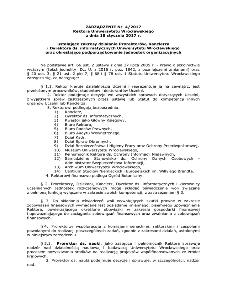 ZARZĄDZENIE Nr 4/2017 Rektora Uniwersytetu Wrocławskiego z dnia 18 stycznia 2017 r. ustalające zakresy działania Prorektorów, Kanclerza i Dyrektora ds. informatycznych Uniwersytetu Wrocławskiego oraz określające podporządkowanie jednostek organizacyjnych Na podstawie art. 66 ust. 2 ustawy z dnia 27 lipca 2005 r. - Prawo o szkolnictwie wyższym (tekst jednolity: Dz. U. z 2016 r. poz. 1842, z późniejszymi zmianami) oraz § 20 ust. 3, § 21 ust. 2 pkt 7, § 68 i § 78 ust. 1 Statutu Uniwersytetu Wrocławskiego zarządza się, co następuje: § 1.1. Rektor kieruje działalnością Uczelni i reprezentuje ją na zewnątrz, jest przełożonym pracowników, studentów i doktorantów Uczelni. 2. Rektor podejmuje decyzje we wszystkich sprawach dotyczących Uczelni, z wyjątkiem spraw zastrzeżonych przez ustawę lub Statut do kompetencji innych organów Uczelni lub Kanclerza. 3. Rektorowi podlegają bezpośrednio: 1) Kanclerz, 2) Dyrektor ds. informatycznych, 3) Kwestor jako Główny Księgowy, 4) Biuro Rektora, 5) Biuro Radców Prawnych, 6) Biuro Audytu Wewnętrznego, 7) Dział Kadr, 8) Dział Spraw Obronnych, 9) Dział Bezpieczeństwa i Higieny Pracy oraz Ochrony Przeciwpożarowej, 10) Muzeum Uniwersytetu Wrocławskiego, 11) Pełnomocnik Rektora ds. Ochrony Informacji Niejawnych, 12) Samodzielne Stanowisko ds. Ochrony Danych Osobowych Administrator Bezpieczeństwa Informacji, 13) Archiwum Uniwersytetu Wrocławskiego, 14) Centrum Studiów Niemieckich i Europejskich im. Willy’ego Brandta. 4. Rektorowi finansowo podlega Ogród Botaniczny. § 2. Prorektorzy, Dziekani, Kanclerz, Dyrektor ds. informatycznych i kierownicy uczelnianych jednostek rozliczeniowych mogą składać oświadczenia woli związane z pełnioną funkcją wyłącznie w zakresie swoich kompetencji, z zastrzeżeniem § 3. § 3. Do składania oświadczeń woli wywołujących skutki prawne w zakresie zobowiązań finansowych wymagane jest posiadanie imiennego, pisemnego upoważnienia Rektora, powierzającego określone obowiązki w zakresie gospodarki finansowej i upoważniającego do zaciągania zobowiązań finansowych oraz zwalniania z zobowiązań finansowych. § 4. Prorektorzy współpracują z komisjami senackimi, rektorskimi i zespołami powołanymi do realizacji poszczególnych zadań, zgodnie z zakresami działań, ustalonymi w niniejszym zarządzeniu. § 5.1. Prorektor ds. nauki, jako zastępca i pełnomocnik Rektora sprawuje nadzór nad działalnością naukową i badawczą Uniwersytetu Wrocławskiego oraz procesem pozyskiwania środków na realizację projektów współfinansowanych ze źródeł krajowych. 2. Prorektor ds. nauki podejmuje decyzje i sprawuje, w szczególności, nadzór nad: 1) 2) 3) 4) organizacją i realizacją badań naukowych, rozwojem kadry naukowej i dydaktycznej, delegowaniem nauczycieli akademickich na krajowe staże naukowe, udzielaniem urlopów naukowych i przyznawaniem stypendiów doktorskich, 5) organizacją ochrony patentowej i wspomaganiem rozwoju wynalazczości w Uczelni, 6) funkcjonowaniem Biblioteki Uniwersyteckiej, 7) procesem pozyskiwania środków na realizację zadań i projektów w zakresie swoich kompetencji, 8) innowacjami, wdrożeniami i komercjalizacją wyników badań naukowych, 9) upowszechnianiem wyników badań naukowych, 10) działalnością wydawniczą. 3. Prorektorowi ds. nauki podlegają: 1) Dział Badań Naukowych, 2) Akademicki Inkubator Przedsiębiorczości, 3) Biblioteka Uniwersytecka, 4) Sekcja Aparatury Naukowej i Obrotu Zagranicznego. § 6.1. Prorektor ds. współpracy z zagranicą i projektów międzynarodowych jako zastępca i pełnomocnik Rektora sprawuje nadzór nad prowadzeniem i rozwijaniem współpracy międzynarodowej oraz pozyskiwaniem środków zagranicznych na działania podejmowane w Uniwersytecie Wrocławskim. 2. Prorektor ds. współpracy z zagranicą i projektów międzynarodowych podejmuje decyzje i sprawuje, w szczególności, nadzór nad: 1) umiędzynarodowieniem uczelni, 2) inicjowaniem i monitorowaniem współpracy Uniwersytetu Wrocławskiego z podmiotami zagranicznymi, 3) delegowaniem pracowników za granicę w celach naukowych i dydaktycznych, 4) monitorowaniem realizacji projektów zagranicznych. 3. Prorektorowi ds. współpracy z zagranicą i projektów międzynarodowych podlegają: 1) Biuro Projektów Zagranicznych, 2) Biuro Współpracy Międzynarodowej, 3) Instytut Konfucjusza w Uniwersytecie Wrocławskim, 4) Ośrodek Szkoleniowy w zakresie Polityki Regionalnej Unii Europejskiej EURO-REGIO-CENTRE. § 7.1. Prorektor ds. nauczania, jako zastępca i pełnomocnik Rektora sprawuje nadzór nad działalnością dydaktyczną Uniwersytetu Wrocławskiego. 2. Prorektor ds. nauczania podejmuje decyzje i sprawuje, w szczególności, nadzór nad: 1) procesem tworzenia nowych kierunków studiów, programów kształcenia i planów studiów, 2) organizacją i realizacją procesu rekrutacji na studia, 3) jakością kształcenia, 4) organizacją i realizacją studiów doktoranckich, podyplomowych, kursów dokształcających i szkoleń oraz kształcenia na odległość, 5) przyznawaniem stypendiów doktoranckich, 6) współpracą z organami administracji publicznej w zakresie kształcenia nauczycieli, 7) tworzeniem warunków do rozwoju kultury fizycznej studentów, 8) procesem pozyskiwania środków na realizację zadań i projektów w zakresie swoich kompetencji. 3. Prorektorowi ds. nauczania podlegają: 2 1) 2) 3) 4) 5) 6) 7) 8) 9) Dział Nauczania, Biuro Karier - Biuro Zawodowej Promocji Studentów i Absolwentów, Centrum Edukacji Nauczycielskiej, Centrum Kształcenia na Odległość, Kolegium Międzyobszarowych Studiów Indywidualnych, Międzywydziałowe Studium Ochrony Środowiska, Studium Intensywnej Nauki Języka Angielskiego, Studium Praktycznej Nauki Języków Obcych, Uniwersytet Trzeciego Wieku. § 8.1. Prorektor ds. finansów i rozwoju, jako zastępca i pełnomocnik Rektora sprawuje nadzór nad finansami i rozwojem Uniwersytetu Wrocławsk