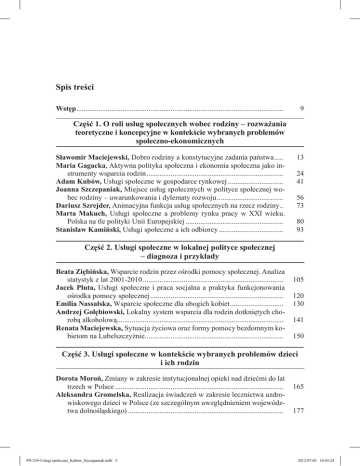 Spis treści Wstęp................................................................................................................. 9 Część 1. O roli usług społecznych wobec rodziny – rozważania teoretyczne i koncepcyjne w kontekście wybranych problemów społeczno-ekonomicznych Sławomir Maciejewski, Dobro rodziny a konstytucyjne zadania państwa...... Maria Gagacka, Aktywna polityka społeczna i ekonomia społeczna jako instrumenty wsparcia rodzin........................................................................... Adam Kubów, Usługi społeczne w gospodarce rynkowej............................... Joanna Szczepaniak, Miejsce usług społecznych w polityce społecznej wobec rodziny – uwarunkowania i dylematy rozwoju..................................... Dariusz Szrejder, Animacyjna funkcja usług społecznych na rzecz rodziny... Marta Makuch, Usługi społeczne a problemy rynku pracy w XXI wieku. Polska na tle polityki Unii Europejskiej...................................................... Stanisław Kamiński, Usługi społeczne a ich odbiorcy.................................... 13 24 41 56 73 80 93 Część 2. Usługi społeczne w lokalnej polityce społecznej – diagnoza i przykłady Beata Ziębińska, Wsparcie rodzin przez ośrodki pomocy społecznej. Analiza statystyk z lat 2001-2010............................................................................. Jacek Pluta, Usługi społeczne i praca socjalna a praktyka funkcjonowania ośrodka pomocy społecznej......................................................................... Emilia Nassalska, Wsparcie społeczne dla ubogich kobiet.............................. Andrzej Gołębiowski, Lokalny system wsparcia dla rodzin dotkniętych chorobą alkoholową........................................................................................... Renata Maciejewska, Sytuacja życiowa oraz formy pomocy bezdomnym kobietom na Lubelszczyźnie............................................................................ 105 120 130 141 150 Część 3. Usługi społeczne w kontekście wybranych problemów dzieci i ich rodzin Dorota Moroń, Zmiany w zakresie instytucjonalnej opieki nad dziećmi do lat trzech w Polsce............................................................................................ 165 Aleksandra Gromelska, Realizacja świadczeń w zakresie lecznictwa uzdrowiskowego dzieci w Polsce (ze szczególnym uwzględnieniem województwa dolnośląskiego)..................................................................................... 177 PN-239-Usługi społeczne_Kubów_Szczepaniak.indb 5 2012-07-03 10:43:24 6 Spis treści Maja Piotrowska, Jak pomóc dziecku w obliczu rozwodu rodziców? Poradnictwo i mediacje dla rozwodzących się rodziców...................................... Krystyna Skurjat, Dialog pozorny jako zagrożenie porozumienia w rodzinie................................................................................................................ Marzena Sendyk, Praca z rodzinami dzieci umieszczonych w pieczy zastępczej............................................................................................................... Katarzyna Miłek, Zabawa w profilaktyce i eliminowaniu problemów emocjonalnych dziecka i wspierania rodziny..................................................... Małgorzata Wróbel, Wpływ warunków mieszkaniowych na dzietność w miastach 100-tysięcznych i większych w Polsce w latach 1998-2008........ 188 201 214 224 234 Część 4. Usługi społeczne wobec osób niesamodzielnych i starszych – stan i postulowane rozwiązania Mateusz Błaszczyk, Usługi opiekuńcze i społeczne jako wsparcie rodzin osób niesamodzielnych................................................................................ Izabela Buchowicz, Uczniowie ze specjalnymi potrzebami edukacyjnymi w polskim systemie edukacji....................................................................... Agnieszka Makarewicz-Marcinkiewicz, Edukacja podstawowa dziecka niepełnosprawnego w polskim systemie oświaty............................................. Bożena Kołaczek, Usługi edukacyjne i opiekuńcze dla dzieci niepełnosprawnych.............................................................................................................. Olga Kowalczyk, Usługi pomocy osobistej jako wsparcie rodzin z osobami niepełnosprawnymi...................................................................................... Krystyna Gilga, Usługi społeczne na rzecz studentów niepełnosprawnych.... Ewa Janion, Przeciwdziałanie zjawiskom wykluczenia społecznego i braku aktywności zawodowej rodziców dzieci niepełnosprawnych. Usługi Akademickiego Klubu Integracji Społecznej w Zielonej Górze........................ Jolanta Lipińska-Lokś, Działania Stowarzyszenia Pomocy Osobom Autystycznym „Dalej Razem” jako przykład inicjatywy społecznej na rzecz osób z autyzmem i ich rodzin zagrożonych wykluczeniem społecznym.... Stella Grotowska, Stary człowiek i jego rodzina w niestabilnych czasach. Uwagi na marginesie rozważań o usługach społecznych wobec rodziny........... Łukasz Jurek, Usługi społeczne wobec rodzin z niesamodzielnym seniorem. Maria Łuszczyńska, Usługi społeczne dla rodziny seniorskiej – stan obecny i perspektywy rozwojowe............................................................................ PN-239-Usługi społeczne_Kubów_Szczepaniak.indb 6 253 268 277 286 298 304 313 323 332 341 352 2012-07-03 10:43:24 Spis treści 7 Summaries Part 1. On the role of social services towards family − theoretical and creative discussions in the context of selected socio-economic problems Sławomir Maciejewski, The good of the family and the constitutional tasks of the state.................................................................................................... 23 Maria Gagacka, Active social policy and social economy as forms of support of families................