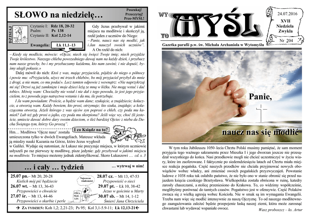 SŁOWO na niedzielę… Poszukaj! Przeczytaj! Prze-MYŚL! DZI SI AJ Gdy Jezus przebywał w jakimś Psalm: Ps 138 miejscu na modlitwie i skończył ją, Czytanie II: Kol 2,12-14 rzekł jeden z uczniów do Niego: – Panie, naucz nas się modlić, jak i Jan nauczył swoich uczniów”. Ewangelia: Łk 11,1–13 A On rzekł do nich: ` – Kiedy się modlicie, mówcie: «Ojcze, niech się święci Twoje imię; niech przyjdzie Twoje królestwo. Naszego chleba powszedniego dawaj nam na każdy dzień, i przebacz nam nasze grzechy, bo i my przebaczamy każdemu, kto nam zawini; i nie dopuść, byśmy ulegli pokusie.» Dalej mówił do nich: Ktoś z was, mając przyjaciela, pójdzie do niego o północy i powie mu: «Przyjacielu, użycz mi trzech chlebów, bo mój przyjaciel przybył do mnie z drogi, a nie mam, co mu podać». Lecz tamten odpowie z wewnątrz: «Nie naprzykrzaj mi się! Drzwi są już zamknięte i moje dzieci leżą ze mną w łóżku. Nie mogę wstać i dać tobie». Mówię wam: Chociażby nie wstał i nie dał z tego powodu, że jest jego przyjacielem, to z powodu jego natręctwa wstanie i da mu, ile potrzebuje. I Ja wam powiadam: Proście, a będzie wam dane; szukajcie, a znajdziecie; kołaczcie, a otworzą wam. Każdy bowiem, kto prosi, otrzymuje; kto szuka, znajduje; a kołaczącemu otworzą. Jeżeli którego z was ojców syn poprosi o chleb, czy poda mu kamień? Lub też gdy prosi o jajko, czy poda mu skorpiona? Jeśli więc wy, choć źli jesteście, umiecie dawać dobre dary swoim dzieciom, o ileż bardziej Ojciec z nieba da Ducha Świętego tym, którzy Go proszą”. 24.07.2016 XVII Niedziela Zwykła Czytanie I: Rdz 18, 20-32 I co Ksiądz na to? Hm… Modlitwa ‘Ojcze nasz’ została umieszczona tylko w dwóch Ewangeliach. Mateusz wkłada ją miedzy nauki Kazania na Górze, które Jezus wygłosił w Galilei. Wydaje się natomiast, że Łukasz nie precyzuje miejsca, w którym uczniowie usłyszeli po raz pierwszy tę modlitwę, pisze jedynie: gdy przebywał w jakimś miejscu na modlitwie. To miejsce możemy jednak zidentyfikować. Skoro Łukaszowi … cd. s. 3 … i cały … tydzień 25.07 pn.– Mt 20, 20-28 Kielich mój pić będziecie … wytrwaj w nim! 28.07 cz. – Mt 13, 47-53 Przypowieść o sieci 26.07 wt. – Mt 13, 36-43 29.07 pt. – Łk 10, 38-42 Przypowieści o chwaście 27.07 śr. – Mt 13, 44-46 Przypowieści o skarbie i perle Jezus w gościnie u Marty 30.07 sb. – Mt 14, 1-12 Śmierć Jana Chrzciciela ZA TYDZIEŃ: Koh 1,2; 2,21-23; Ps 95; Kol 3,1-5.9-11; Łk 12,13-21 Gazetka parafii p.w. św. Michała Archanioła w Wytomyślu Nr 204 29 Panie, naucz nas się modlić W tym roku Jubileuszu 1050–lecia Chrztu Polski musimy pamiętać, że sam moment przyjęcia tego ważnego sakramentu przez Mieszka I i jego dworzan jeszcze nie przesądzał wszystkiego do końca. Nasi przodkowie mogli nie chcieć uczestniczyć w życiu wiary, które im zaoferowane. I faktycznie po siedemdziesięciu latach od Chrztu miała miejsce reakcja pogańska. Część naszych przodków nie chciała przyjmować nowych obowiązków wobec władcy, ani zmieniać swoich pogańskich przyzwyczajeń. Powstanie ludowe z 1038 roku tak osłabiło państwo, że nie było ono w stanie obronić się przed najazdem księcia czeskiego Brzetysława. Wielkopolska została obrócona w ruinę, katedry zarosły chaszczami, a stolicę przeniesiono do Krakowa. To, co widzimy współcześnie, moglibyśmy porównać do tamtych czasów. Pogaństwo jest w ofensywie. Część Polaków zwraca się z wielką agresją wobec Kościoła. Nie w smak są im wymagania Ewangelii. Trzeba nam więc się modlić intensywnie za naszą Ojczyznę. To od naszego modlitewnego zaangażowania zależeć będzie przepojenie łaską naszej ziemi, która może zarosnąć chwastami lub wydawać wspaniałe owoce. Wasz proboszcz – ks. Artur . Anna i Joachim – byś świętymi rodzicami i dziadkami . W Piśmie Świętym nie znajdziemy na ich temat ani jednego słowa. Kim właściwie byli, jaką ważną rolę odegrali w życiu i skąd o Nich wiemy dowiemy się właśnie z tego artykułu. Wiele informacji związanych z ich imionami i życiem przekazują tak zwane apokryfy. Taką nazwę stosuje się w odniesieniu do pism wczesnochrześcijańskich, które często noszą imiona Ewangelistów lub Apostołów, te jednak nie zostały uznane za księgi kanoniczne, czyli zatwierdzone przez Kościół. Tym samym nie tworzą kanonu Pisma Świętego. Apokryfy zostały napisane przez nieznanych bliżej nam ludzi, którzy podszywali się pod autorów ksiąg biblijnych. Próbowano w ten sposób uzupełnić to wszystko, czego nie można było znaleźć w Piśmie Świętym. Nie można natomiast powiedzieć, że wspomniane apokryfy zostały zmyślone, niektóre zawarte w nich treści mogą być prawdziwe, a opisane niekiedy wydarzenia mogły mieć miejsce. Musimy pamiętać, że istniała tak zwana tradycja ustna, przekazywana z ust do ust, w której nie koniecznie wszystko musiało być zmyślone. Anna i Joachim są rodzicami Najświętszej Maryi Panny. Hebrajskie imię Anna w języku polskim oznacza tyle co „łaska”, Joachim natomiast oznacza „przygotowanie w Panu”. Tworzyli razem szczęśliwe małżeństwo, borykali się jednak z problemem bezpłodności. Pewnego dnia Joachim udał się na pustynię pościł i modlił się 40 dni i nocy, Anna natomiast gorliwie modliła się w domu by Pan Bóg zdjął z niej piętno bezdzietności. Wtedy zjawił się anioł na pustyni i zwiastował, że jego prośby zostały wysłuchane, gdyż jego małżonka Anna da mu Dziecię, które będzie radością ziemi. Tak też się stało. Przy narodzinach ukochanej Córki, której według zwyczaju piętnastego dnia nadano imię Maria, była najbliższa rodzina. W rocznicę tych narodzin urządzono wielką radosną uroczystość. Spełniając uprzednio złożony ślub, rodzice oddali swą Jedynaczkę na służbę w świątyni kiedy Maryja miała 3 lata. Wychowywała