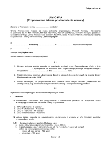 Załącznik nr 4 UMOWA (Proponowane istotne postanowienia umowy) Zawarta w Tworkowie w dniu ………………… pomiędzy: Gminą Krzyżanowice mającą za swoją jednostkę organizacyjną Ośrodek Pomocy Społecznej ul. Zamkowa 50, 47-451 Tworków, NIP 639-169-69-30, REGON 003452122, w imieniu której na podstawie upoważnienia Wójta Gminy Krzyżanowice z dnia 01.10.2010r. działa Kierownik Ośrodka Pomocy Społecznej Krzyżanowice - zwany w treści umowy „Zamawiającym”, a ………………………. z siedzibą……………………….w ……………………. reprezentowana przez: p. …………………….– ……………….. zwanym dalej Wykonawcą została zawarta umowa o następującej treści: § 1. 1. Umowa niniejsza zostaje zawarta na podstawie przyjętej przez Zamawiającego oferty z dnia …………………..r., sporządzonej na podstawie SIWZ i ogłoszonego przetargu nieograniczonego – nr ogłoszenia ………………………. z dnia …….…………….. roku. 2. Przedmiot umowy obejmuje „Dożywianie dzieci w szkołach i osób dorosłych na terenie Gminy Krzyżanowice w roku 2014” 3. Strony zastrzegają, że prognozowana ilość posiłków może ulegać zmianie (zwiększeniu lub zmniejszeniu) przy zachowaniu stałych warunków umowy i ceny jednostkowej posiłków. § 2. Wykonawca zobowiązany jest do realizacji następujących zadań: I. Zadanie I 1.1 Przedmiotem zamówienia jest przygotowanie i dostarczanie posiłków na dożywianie dzieci w następujących szkołach na terenie Gminy Krzyżanowice. a. b. c. d. SP w Zabełkowie - 3 uczniów ZSO W Chałupkach - 7 uczniów ZSO w Tworkowie - 11 uczniów ZSO w Bieńkowicach - 9 uczniów 1.2 Usługa będzie polegała na przygotowaniu, dostarczeniu i wydaniu w w/w Szkołach posiłków w następującej formie: 1.2.1 Gorący dwudaniowy posiłek składający się z: a) zupa o obowiązującej gramaturze posiłku : zupa -350 ml. b) mięso lub jego porcja + ziemniaki, kasza lub ryż + surówka + napój lub kompot. Ustala się obowiązująca gramaturę posiłku: − mięso lub jego porcja – 100 gram − ziemniaki – 150 gram Strona 1 z 5 − − − lub kasza, ryż (zamiennie) 100 gram surówka - 100 gram, napój lub kompot - 200 ml. 1.3 Za danie z mięsem, jeden raz w tygodniu posiłek mogą stanowić np.: pierogi, naleśniki z serem, krokiety lub danie z makaronem o minimalnej gramaturze – 200 gram + napój lub kompot 1.4 Zamawiający nie dopuszcza, aby w ciągu jednego tygodnia (5 dni nauki szkolnej) wystąpiła powtarzalność tego samego dania lub zupy. 1.5 Posiłki przygotowane przez Wykonawcę pod względem technologii wykonania i jakości, spełniać muszą normy określone przez Instytut Żywności i Żywienia Dzieci i Młodzieży. 1.6 Posiłki muszą posiadać wymaganą przepisami kaloryczność i muszą być sporządzone zgodnie z wymogami sztuki kulinarnej i sanitarnej dla żywienia zbiorowego. Muszą być wykonane ze świeżych produktów spożywczych posiadających aktualne terminy przydatności do spożycia. 1.7 Wykonawca będzie zobowiązany do przygotowania i przedstawienia zleceniodawcy (Dyrektorom Szkół i Kierownikowi Ośrodka Pomocy Społecznej Krzyżanowice) z co najmniej tygodniowym wyprzedzeniem, jadłospisów dotyczących dożywiania w poszczególnych dniach. 1.8 W okresie dożywiania liczba posiłków może ulegać zmianie tj zwiększeniu lub zmniejszeniu do 30 %. 1.9 Godziny dostarczenia posiłków Wykonawca ustali z Dyrektorami poszczególnych szkół. 1.10 Przygotowanie i dostarczenie gorących posiłków powinno być wykonywane przez kadrę posiadająca wymagane kwalifikacje zawodowe oraz w oparciu o bazę kuchenną do sporządzania posiłków. 1.11 Posiłki będą wydawane na terenie Szkół. Posiłki Wykonawca będzie dostarczał we własnym zakresie, na własny koszt środkami transportu przystosowanymi do przewozu żywności, spełniając przy tym wszelkie wymogi sanitarno – higieniczne, we własnych specjalistycznych termosach gwarantujących utrzymanie odpowiedniej temperatury oraz jakości przewożonych potraw albo dostawa może odbywać się także w jednorazowych naczyniach zapewniających właściwą ochronę i temperaturę. 1.12 Wykonawca zapewnia naczynia i sztućce do spożywania wydawanych posiłków . 1.13 Wydawanie posiłków leży po stronie Wykonawcy. 1.14 Wykonawca będzie ponosił koszty załadunku i rozładunku wszystkich dostaw posiłków oraz wydawania wszystkich posiłków w szkołach a także koszty i odpowiedzialność za czystość używanych termosów i naczyń wielokrotnego użytku, jeśli takie będą używane. 1.15 Informacje o zmianach w liczbie dostarczanych posiłków lub dodatkowych dniach wolnych od nauki szkolnej Zamawiający (Kierownik Ośrodka Pomocy Społecznej Krzyżanowice lub osoby przez niego upoważnione), jest obowiązany przekazać do Wykonawcy w terminie z co najmniej 3 dniowym wyprzedzeniem . II Zadanie II 2.1 Przedmiotem zamówienia jest przygotowanie i dostarczanie posiłków dla osób dorosłych na terenie Gminy Krzyżanowice. Prognozowana liczba osób dorosłych objętych dożywianiem na terenie gminy Krzyżanowice wynosi 2. Przewidywana średnia liczba posiłków w roku 2014 wyniesie 525 szt. Dożywianie osób dorosłych odbywać się będzie od poniedziałku do piątku w godzinach pomiędzy 10.00 a 15.00. w następujących miejscowościach: − Roszków – 1 osoba − Krzyżanowice – 1 osoby 2.2 Usługa będzie polegała na przygotowaniu i dostarczeniu dwudaniowych posiłków do mieszkań osób uprawnionych zgodnie z wykazem. 2.2.1 Posiłek dwudaniowy powinien składać się z: Strona 2 z 5 a) zupa - 500 ml, pieczywo (1 bułka lub 2 kromki chleba ), b) drugie danie - mięso lub jego porcja + ziemniaki, kasza lub ryż + surówka. Ustala się obowiązującą gramaturę posiłku: − − − − mięso lub jego porcja – 100 gram ziemniaki – 250 gram lub kasza, ryż (zamiennie) 250 gram surówka – 100 gram. 