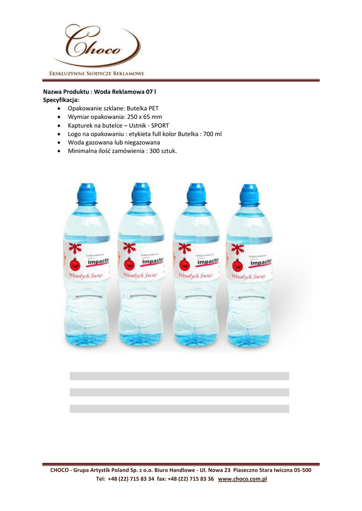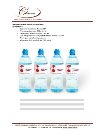 Nazwa Produktu : Woda Reklamowa 07 l Specyfikacja: Opakowanie szklane: Butelka PET Wymiar opakowania: 250 x 65 mm Kapturek na butelce – Ustnik - SPORT Logo na opakowaniu : etykieta full kolor Butelka : 700 ml Woda gazowana lub niegazowana Minimalna ilość zamówienia : 300 sztuk. CHOCO - Grupa Artystik Poland Sp. z o.o. Biuro Handlowe - Ul. Nowa 23 Piaseczno Stara Iwiczna 05-500 Tel: +48 (22) 715 83 34 fax: +48 (22) 715 83 36 www.choco.com.pl