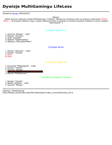 Dywizje MultiGamingu LifeLess Posted by Bengu 09/10/2013 Witam! Jeżeli chcecie zobaczyć skład MultiGamingu "Lifeless" Wystarczy rozwinac post za pomoca zalacznika "Read More..." W prawym dolnym rogu ;) Jezeli widziecie braki w dywizji to mozecie wysylac Podania w menu zkladce "Rekrutacje" :) Counter Strike 1.6 1. Szymon "Bengu" - Lider 2. Kacper "Serocky" 3. Arek "Szpadel" 4. Wojtek "wojtekzwierz" 5. Mateusz "BansujDzifffko!" Combat Arms 1. Kacper "Serocky" - Lider 2. Kacper "TosieG" 3. Brak 4. Brak League Of Legends 1. Krzysztof "Makubgulid" - Lider 2. Kacper "TosieG" 3. Szymon "Bengu" 4. Bartłomiej "Knorek Xd" - Zawieszony! 5. Maciej "MrMakeman" TrackMania Nation Forever 1. Kacper "TosieG" 2. Błażej "Jobekol" - Lider 3. Szymon "Bengu" LifeLess - MultiGaming http://lifeless.y0.pl/index.php?file=News&op=index_comment&news_id=9.