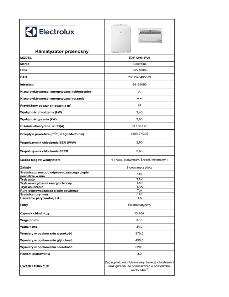 Klimatyzator przenośny MODEL EXP12HN1W6 Marka Electrolux PNC 922718080 EAN 7332543465033 Intrastad Klasa efektywności energetycznej (chłodzenie) 84151090 A Klasa efektywności energetycznej (grzanie) A+ Przybliżony obszar chłodzenia m2 24 Wydajność chłodzenia (kW) 3,40 Wydajność grzania (kW) 3,00 Ciśninie akustyczne w dB(A) 53 / 50 / 45 Przepływ powietrza (m3/h) (High/Med/Low) 386/327/305 Współczynnik chłodzenia EER (W/W) 2,60 Współczynnik chłodzenia SEER 2,63 Liczba biegów wentylatora Żaluzje Średnica przewodu odprowadzającego ciepłe powietrze w mm Tryb auto Tryb oszczędzania energii / Nocny Tryb osuszania Rura odprowadzająca ciepłe powietrze Średnica rury mm Usuwanie pary wodnej L/H Filtry Czynnik chłodniczy 4 ( Auto, Najwyższy, Średni, Minimalny ) Storowane z pilota 145 TAK TAK TAK Tak 145 1,5 Elektrostatyczny R410A Waga brutto 37,5 Waga netto 34,0 Wymiary w opakowaniu wysokość 870,0 Wymiary w opakowaniu głębokość 455,0 Wymiary w opakowaniu szerokość 520,0 Poziom piętrowania 3,0 UWAGI / FUNKCJE Zegar;pilot, kolor biało-szary, funkcja chłodzenia i oraz grzania, do pomieszczeń o powierzchni około 24m 2