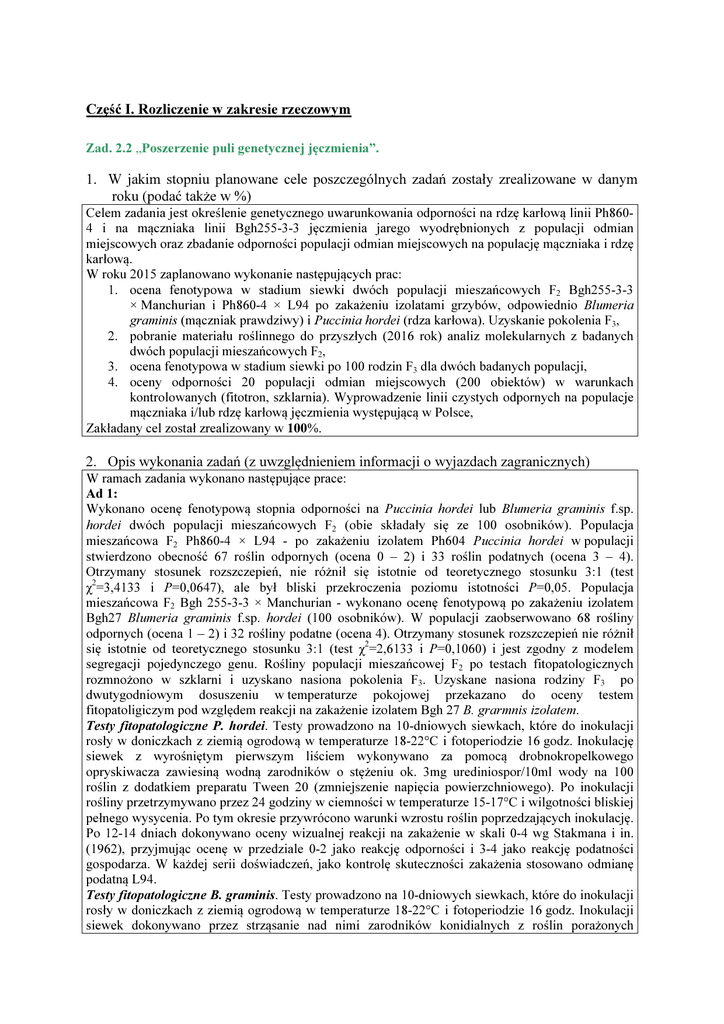 Część I. Rozliczenie w zakresie rzeczowym Zad. 2.2 „Poszerzenie puli genetycznej jęczmienia”. 1. W jakim stopniu planowane cele poszczególnych zadań zostały zrealizowane w danym roku (podać także w %) Celem zadania jest określenie genetycznego uwarunkowania odporności na rdzę karłową linii Ph8604 i na mączniaka linii Bgh255-3-3 jęczmienia jarego wyodrębnionych z populacji odmian miejscowych oraz zbadanie odporności populacji odmian miejscowych na populację mączniaka i rdzę karłową. W roku 2015 zaplanowano wykonanie następujących prac: 1. ocena fenotypowa w stadium siewki dwóch populacji mieszańcowych F2 Bgh255-3-3 × Manchurian i Ph860-4 × L94 po zakażeniu izolatami grzybów, odpowiednio Blumeria graminis (mączniak prawdziwy) i Puccinia hordei (rdza karłowa). Uzyskanie pokolenia F3, 2. pobranie materiału roślinnego do przyszłych (2016 rok) analiz molekularnych z badanych dwóch populacji mieszańcowych F2, 3. ocena fenotypowa w stadium siewki po 100 rodzin F3 dla dwóch badanych populacji, 4. oceny odporności 20 populacji odmian miejscowych (200 obiektów) w warunkach kontrolowanych (fitotron, szklarnia). Wyprowadzenie linii czystych odpornych na populacje mączniaka i/lub rdzę karłową jęczmienia występującą w Polsce, Zakładany cel został zrealizowany w 100%. 2. Opis wykonania zadań (z uwzględnieniem informacji o wyjazdach zagranicznych) W ramach zadania wykonano następujące prace: Ad 1: Wykonano ocenę fenotypową stopnia odporności na Puccinia hordei lub Blumeria graminis f.sp. hordei dwóch populacji mieszańcowych F2 (obie składały się ze 100 osobników). Populacja mieszańcowa F2 Ph860-4 × L94 - po zakażeniu izolatem Ph604 Puccinia hordei w populacji stwierdzono obecność 67 roślin odpornych (ocena 0 – 2) i 33 roślin podatnych (ocena 3 – 4). Otrzymany stosunek rozszczepień, nie różnił się istotnie od teoretycznego stosunku 3:1 (test χ2=3,4133 i P=0,0647), ale był bliski przekroczenia poziomu istotności P=0,05. Populacja mieszańcowa F2 Bgh 255-3-3 × Manchurian - wykonano ocenę fenotypową po zakażeniu izolatem Bgh27 Blumeria graminis f.sp. hordei (100 osobników). W populacji zaobserwowano 68 rośliny odpornych (ocena 1 – 2) i 32 rośliny podatne (ocena 4). Otrzymany stosunek rozszczepień nie różnił się istotnie od teoretycznego stosunku 3:1 (test χ2=2,6133 i P=0,1060) i jest zgodny z modelem segregacji pojedynczego genu. Rośliny populacji mieszańcowej F2 po testach fitopatologicznych rozmnożono w szklarni i uzyskano nasiona pokolenia F3. Uzyskane nasiona rodziny F3 po dwutygodniowym dosuszeniu w temperaturze pokojowej przekazano do oceny testem fitopatoligiczym pod względem reakcji na zakażenie izolatem Bgh 27 B. grarmnis izolatem. Testy fitopatologiczne P. hordei. Testy prowadzono na 10-dniowych siewkach, które do inokulacji rosły w doniczkach z ziemią ogrodową w temperaturze 18-22°C i fotoperiodzie 16 godz. Inokulację siewek z wyrośniętym pierwszym liściem wykonywano za pomocą drobnokropelkowego opryskiwacza zawiesiną wodną zarodników o stężeniu ok. 3mg urediniospor/10ml wody na 100 roślin z dodatkiem preparatu Tween 20 (zmniejszenie napięcia powierzchniowego). Po inokulacji rośliny przetrzymywano przez 24 godziny w ciemności w temperaturze 15-17°C i wilgotności bliskiej pełnego wysycenia. Po tym okresie przywrócono warunki wzrostu roślin poprzedzających inokulację. Po 12-14 dniach dokonywano oceny wizualnej reakcji na zakażenie w skali 0-4 wg Stakmana i in. (1962), przyjmując ocenę w przedziale 0-2 jako reakcję odporności i 3-4 jako reakcję podatności gospodarza. W każdej serii doświadczeń, jako kontrolę skuteczności zakażenia stosowano odmianę podatną L94. Testy fitopatologiczne B. graminis. Testy prowadzono na 10-dniowych siewkach, które do inokulacji rosły w doniczkach z ziemią ogrodową w temperaturze 18-22°C i fotoperiodzie 16 godz. Inokulacji siewek dokonywano przez strząsanie nad nimi zarodników konidialnych z roślin porażonych wybranym izolatem. Po 8–10 dniach od inokulacji oceniano reakcję roślin w pięciostopniowej (0–4) skali Mainsa i Dietza (1930). Rośliny o reakcji 0–2 klasyfikowano, jako odporne, a 3–4 jako podatne. Ad 2: Na potrzeby przyszłych analiz molekularnych z każdej badanej rośliny obydwu populacji pokolenia F2 (w sumie 200 próbek) pobrano fragment liścia (około 200mg) i zamrożono w temp. –80°C. Ad 3: Wykonano ocenę fenotypową na zakażanie izolatem Ph604 Puccinia hordei 100 rodzin F3 kombinacji mieszańcowej Ph860-4 × L94. Test został wykonany w stadium siewki zgodnie z podaną wcześniej metodyką. W populacji stwierdzono obecność 32 rodzin odpornych, 35 rodzin o mieszanej reakcji (rozszczepiających się) i 33 rodzin podatnych. Otrzymane stosunki rozszczepień (teoretycznie 1:1:1, test χ2=0,14, P=0,9324) w populacji F2:3 świadczą o uwarunkowaniu odporności w linii Ph8604 przez więcej niż jeden gen. Podobnie wykonano ocenę fenotypową na zakażanie izolatem Bgh 27 Blumeria gramnis f. sp. hordei 100 rodzin F3 kombinacji mieszańcowej Bgh 255-3-3 x Manchurian. Test został wykonany w stadium siewki zgodnie z podaną wcześniej metodyką. W populacji stwierdzono obecność 15 rodzin odpornych, 57 rodzin o mieszanej reakcji (rozszczepiających się) i 28 rodzin podatnych. Otrzymane stosunki rozszczepień (teoretycznie 1:2:1), w populacji F2:3 świadczą o uwarunkowaniu odporności w linii Bgh 255-3-3 prawdopodobnie przez więcej niż jeden gen. Ad 4: Rozpoczęto prace mające na celu ocenę odporności 200 obiektów odmian miejscowych (20 populacji) w warunkach kontrolowanych (fitotron, szklarnia) na rdzę karłową (P. hordei) i mączniaka prawdziwego (B. graminis). Testy odporności prowadzono zgodnie z metodyką podaną w Ad. 1. Jak dotąd, 200 obiektów odmian miejscowych (20 populacji) zostało przetestowanych dwoma izolatami P. hordei (Ph604 i Ph518-3), które różniły się profilem